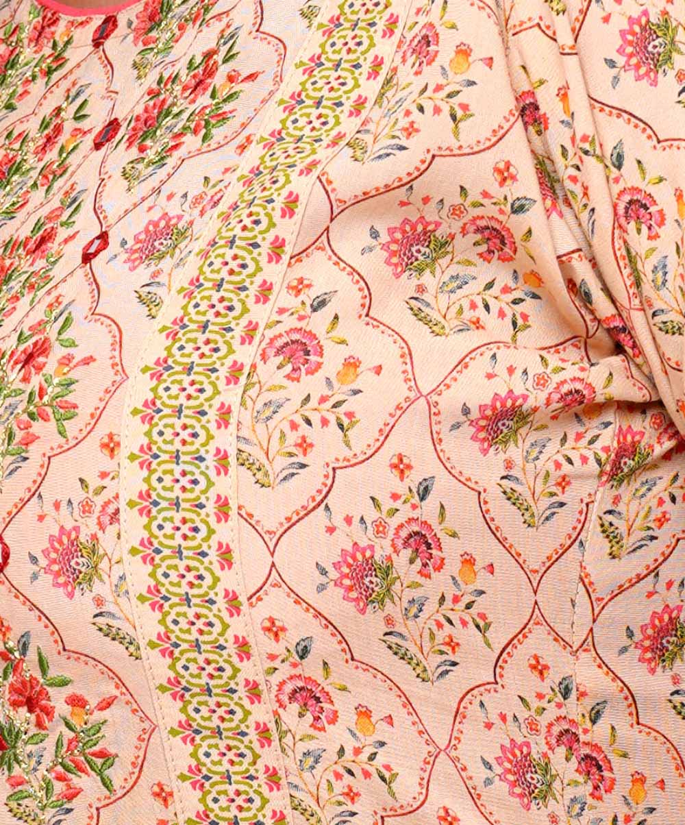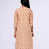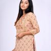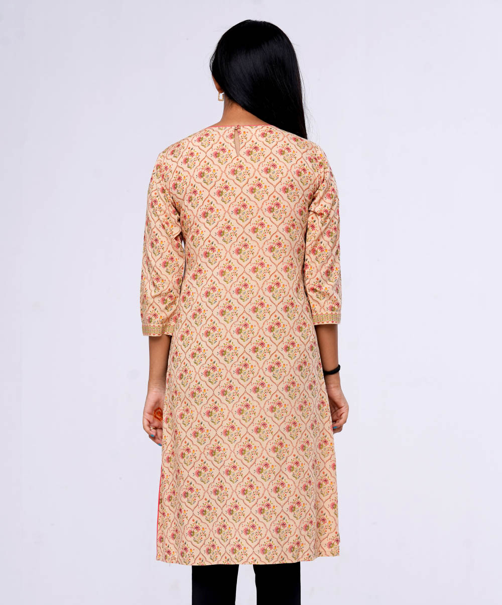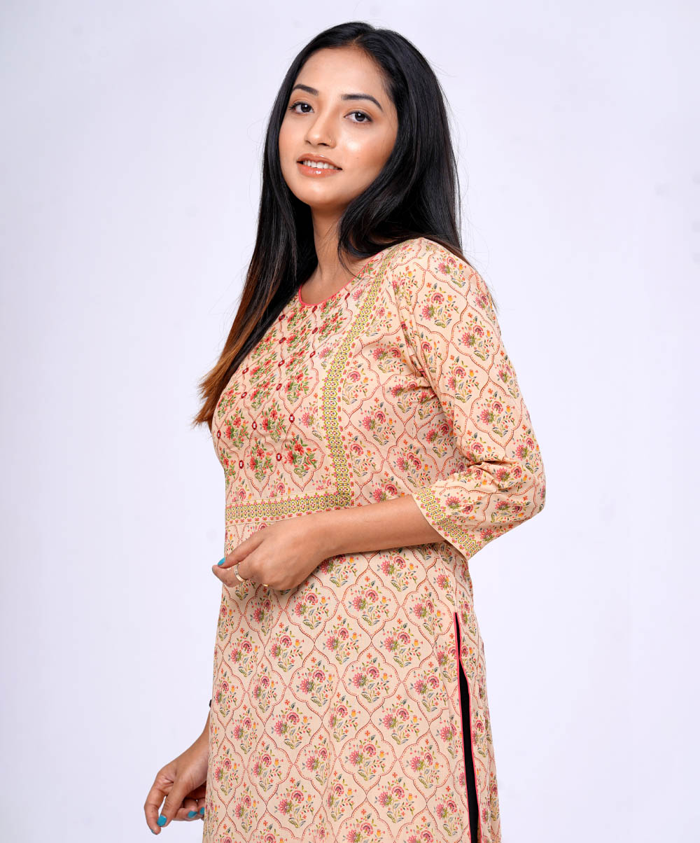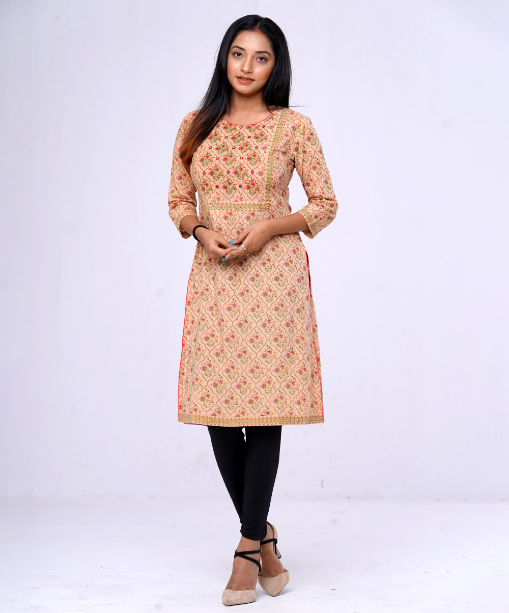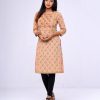 Brown all-over printed straight-cut Kameez in Viscose fabric. Designed with a round neck and three-quarter sleeves. Embellished with embroidery at the top front. Patch attachment at the front and cuffs. Single button opening at the back.