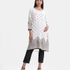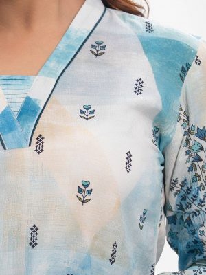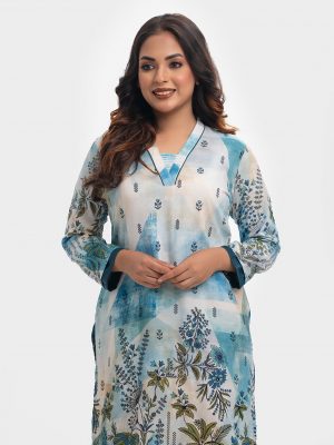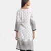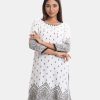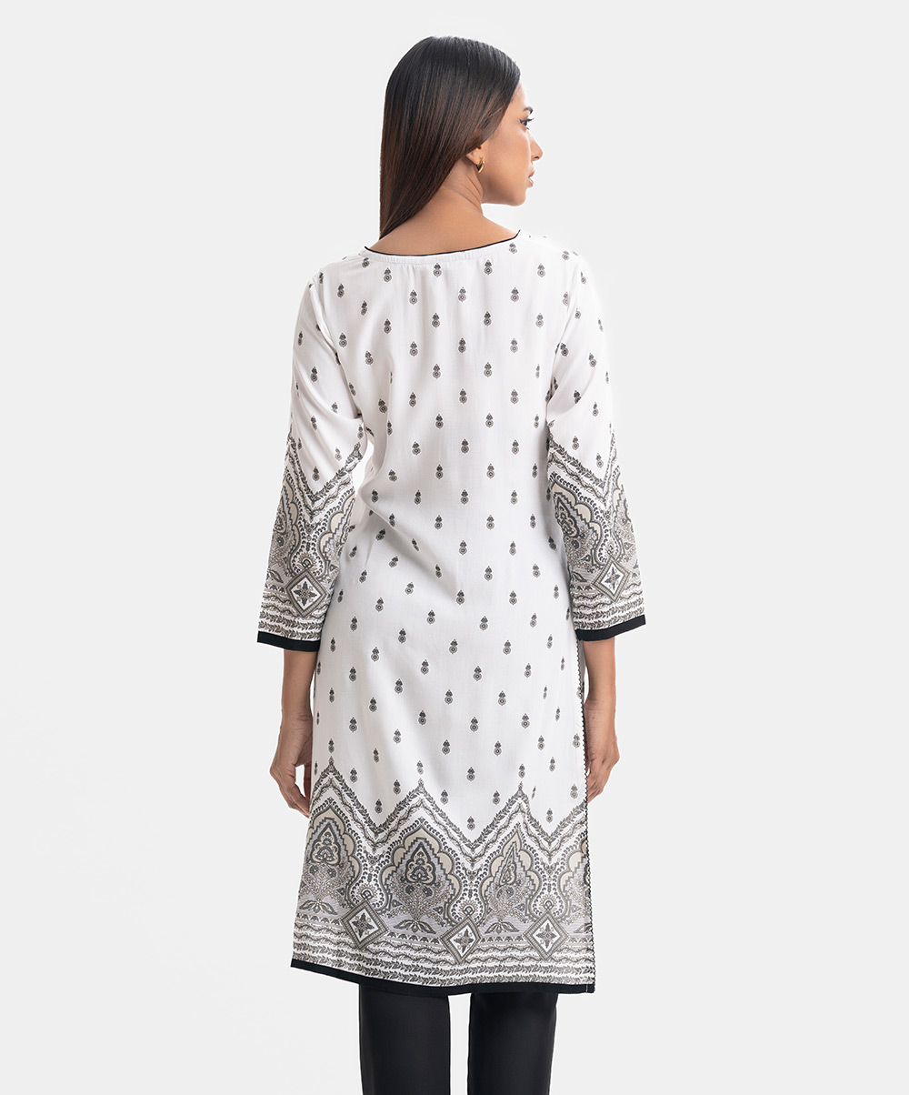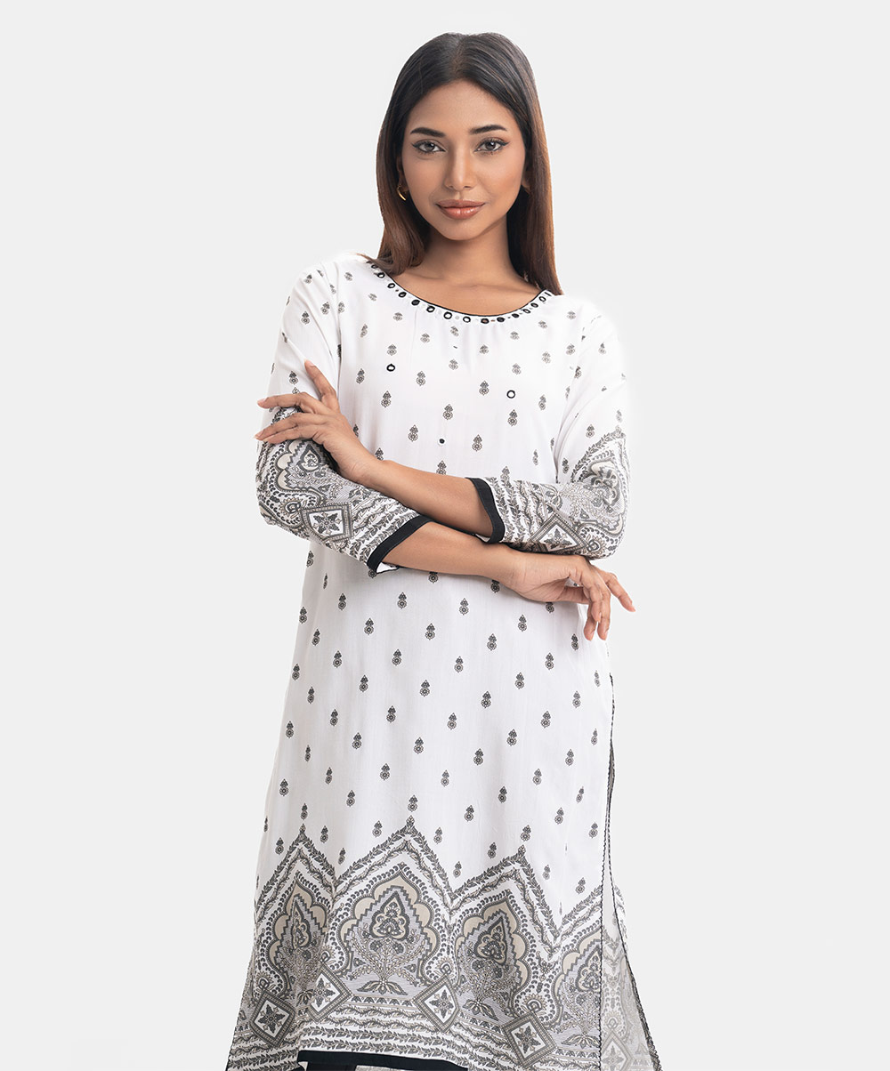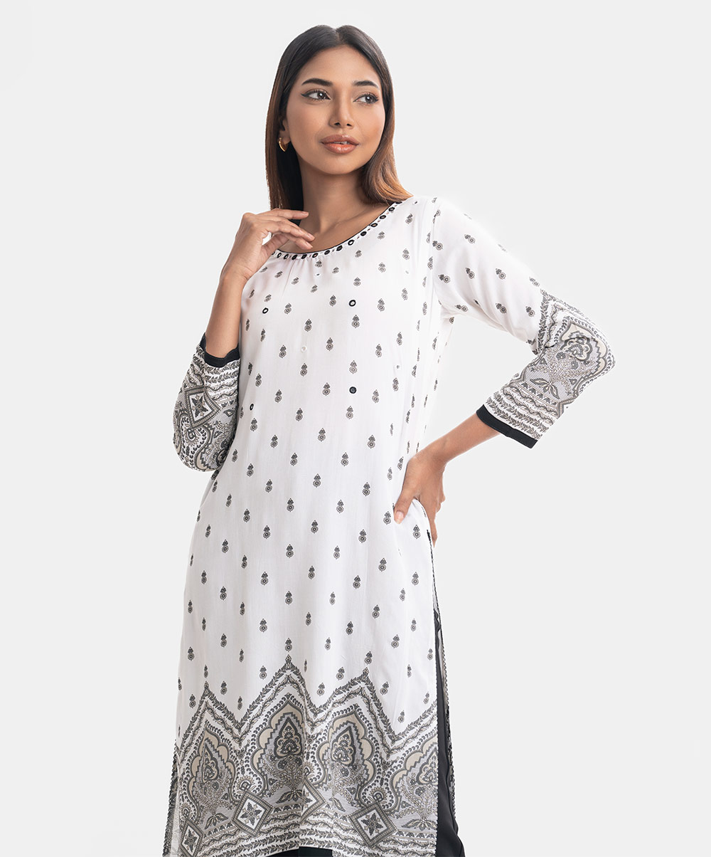 Round-neck A-line kameez in satin-georgette fabric. Three-quarter sleeves. Karchupi detailed.
