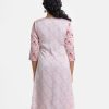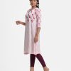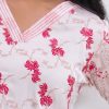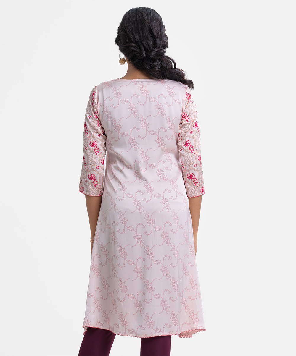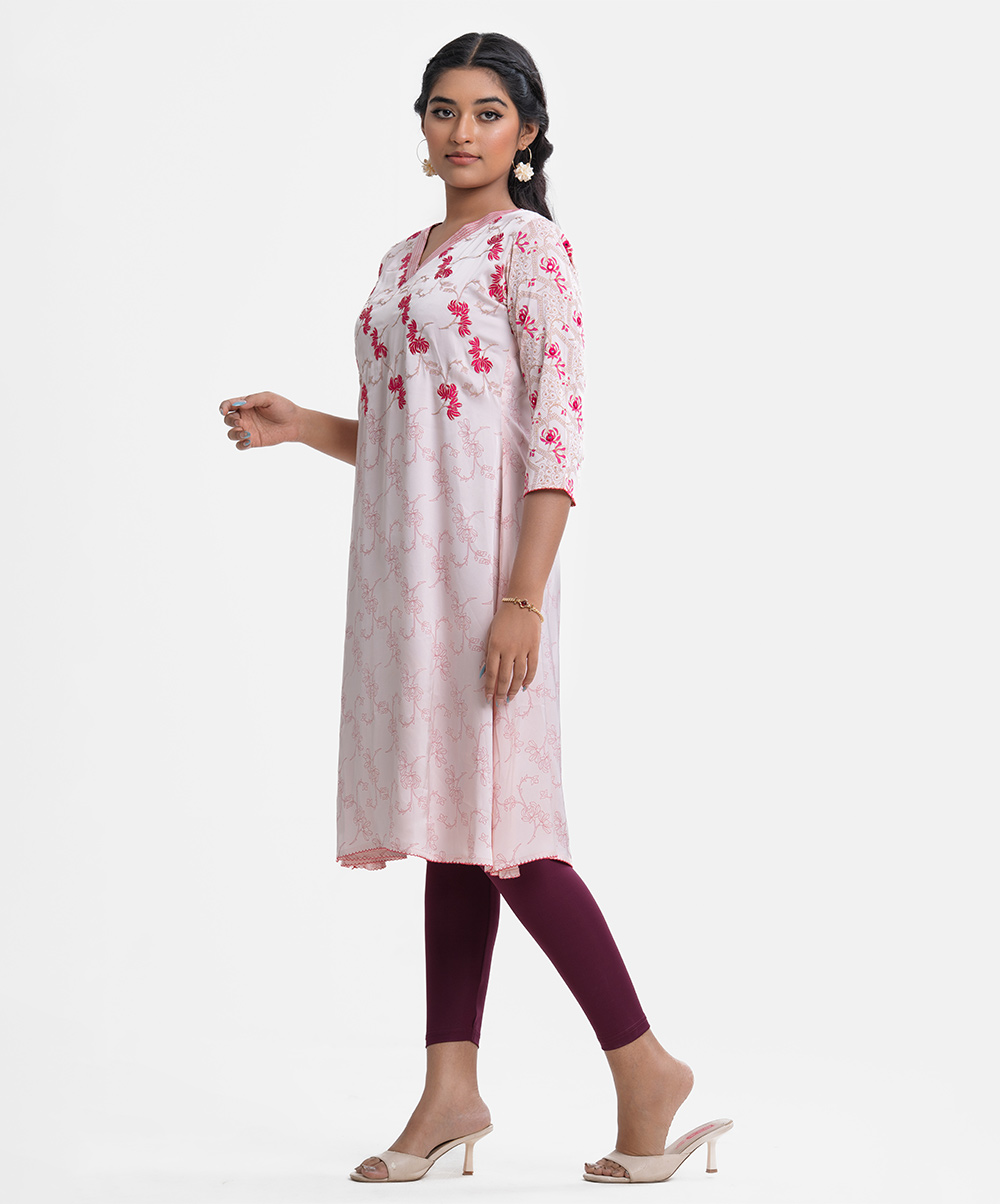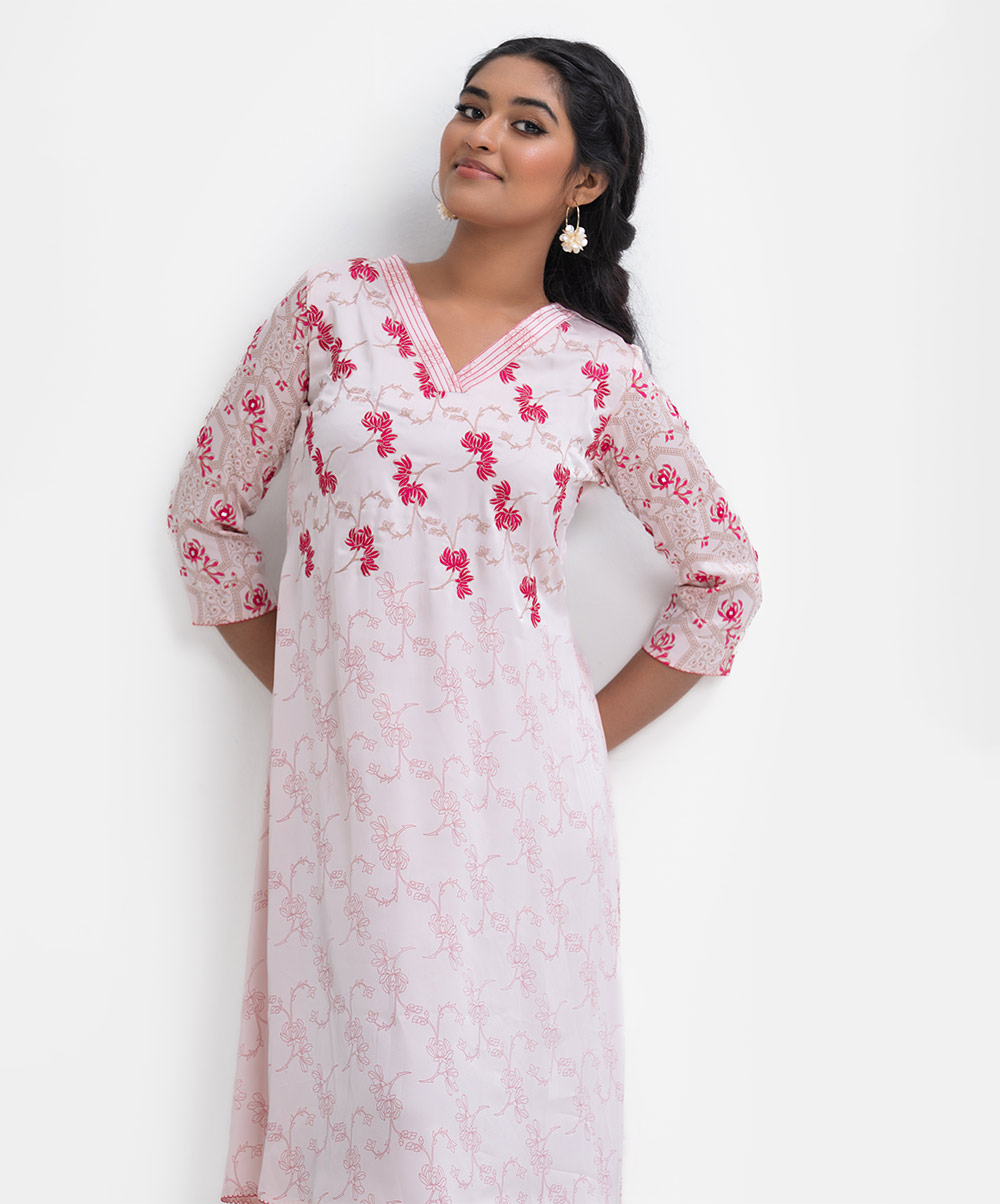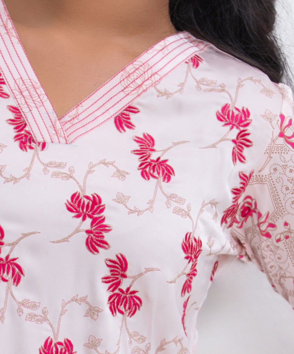 Women’s floral printed A-line kameez in georgette fabric. Three-quarter sleeves, V-neck. Embroidery at front.