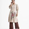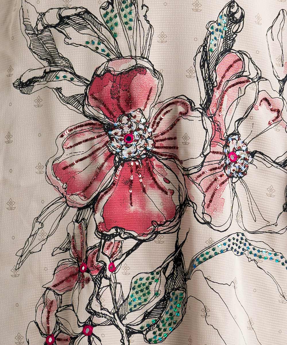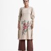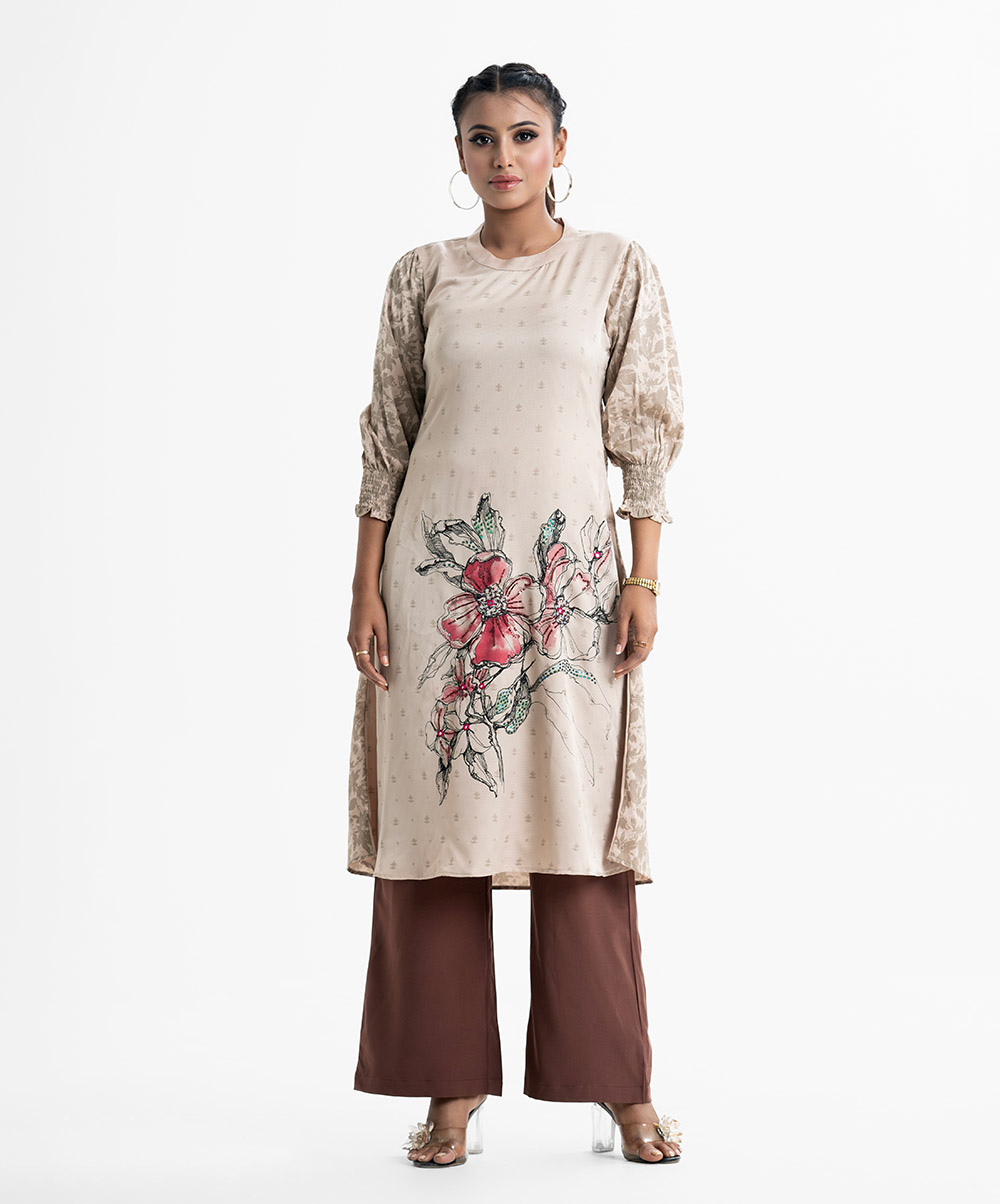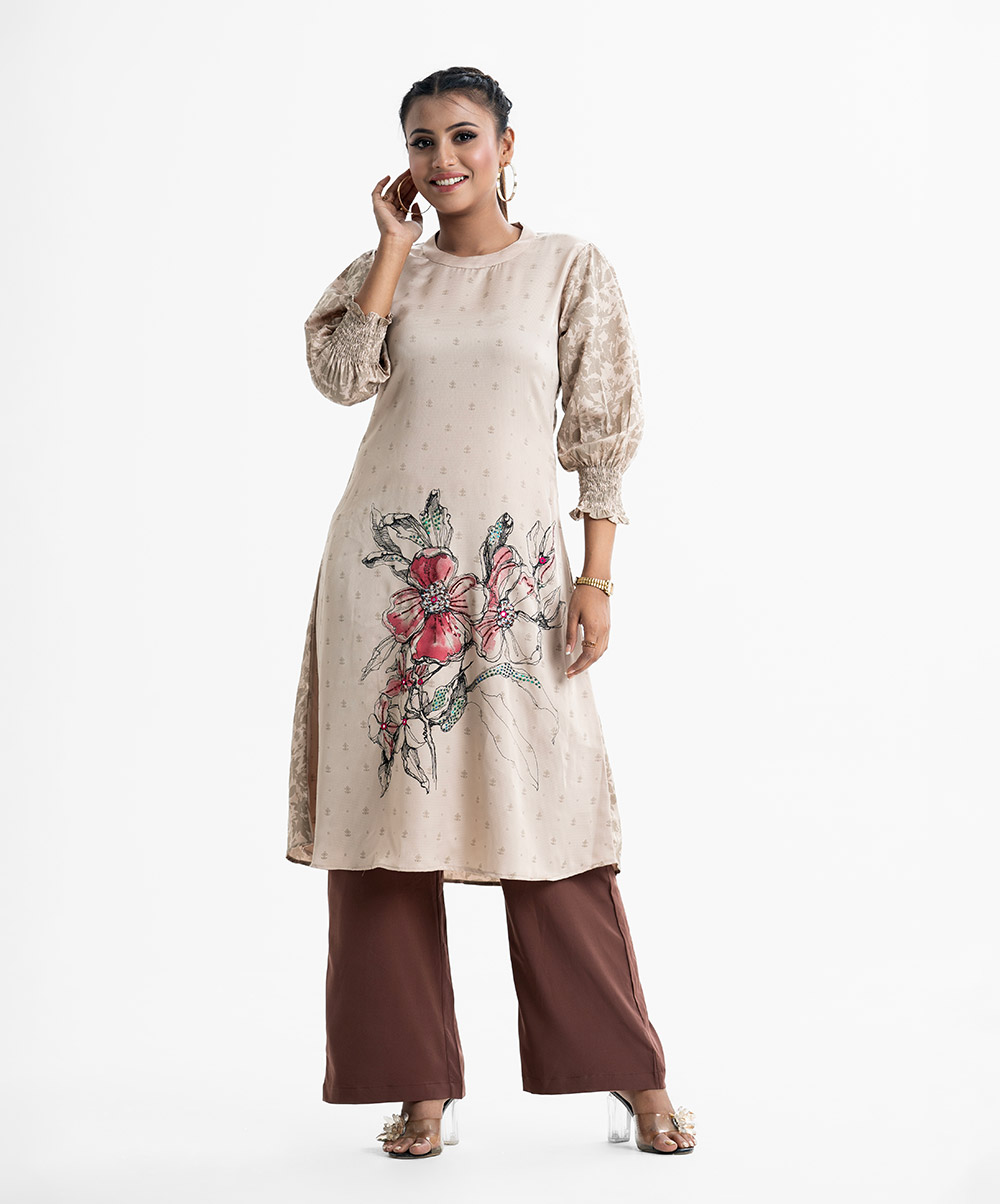 Floral printed straight kameez in crepe fabric. Mock neck and lantern sleeves. Karchupi at front.