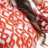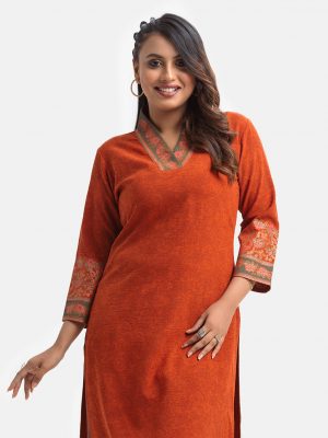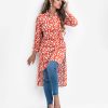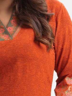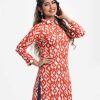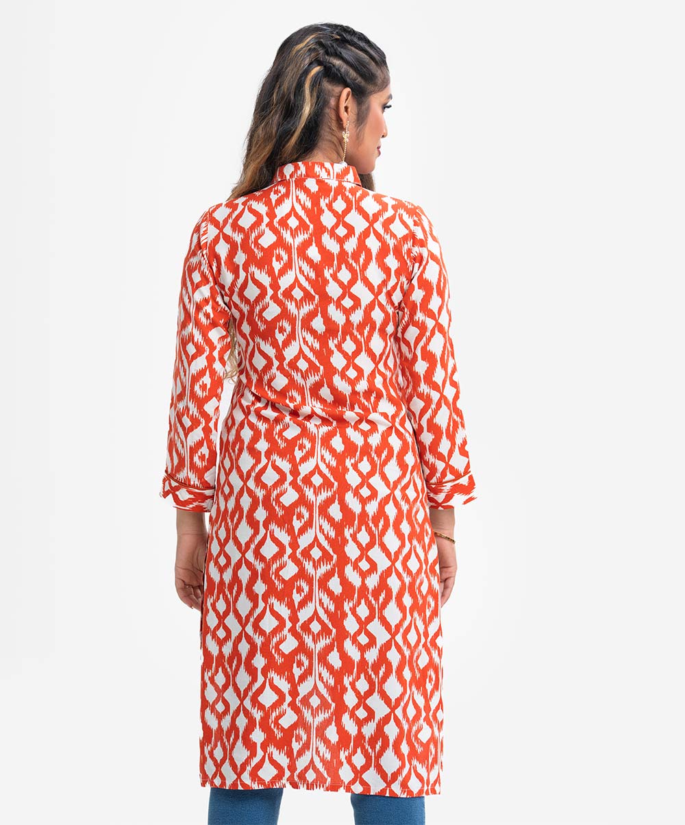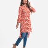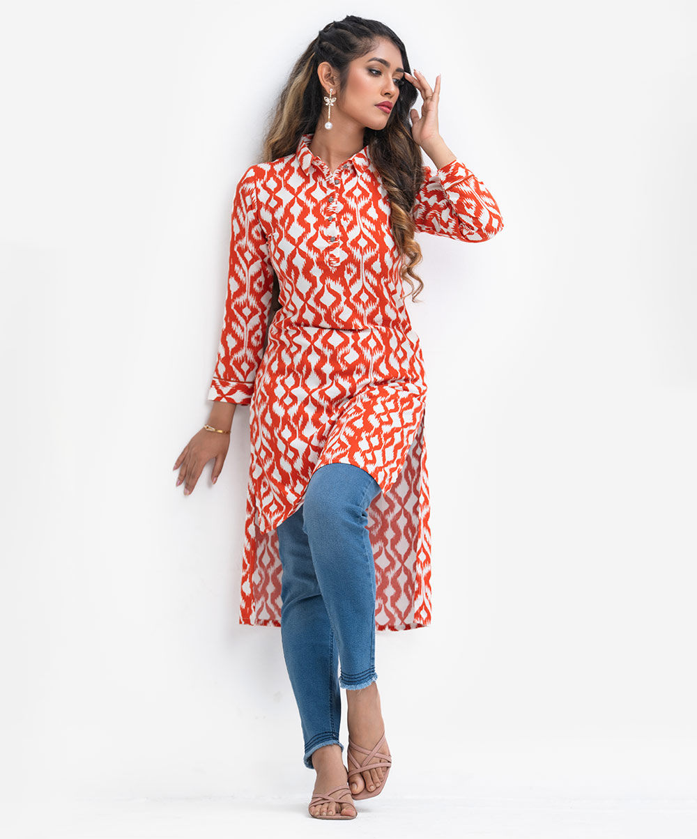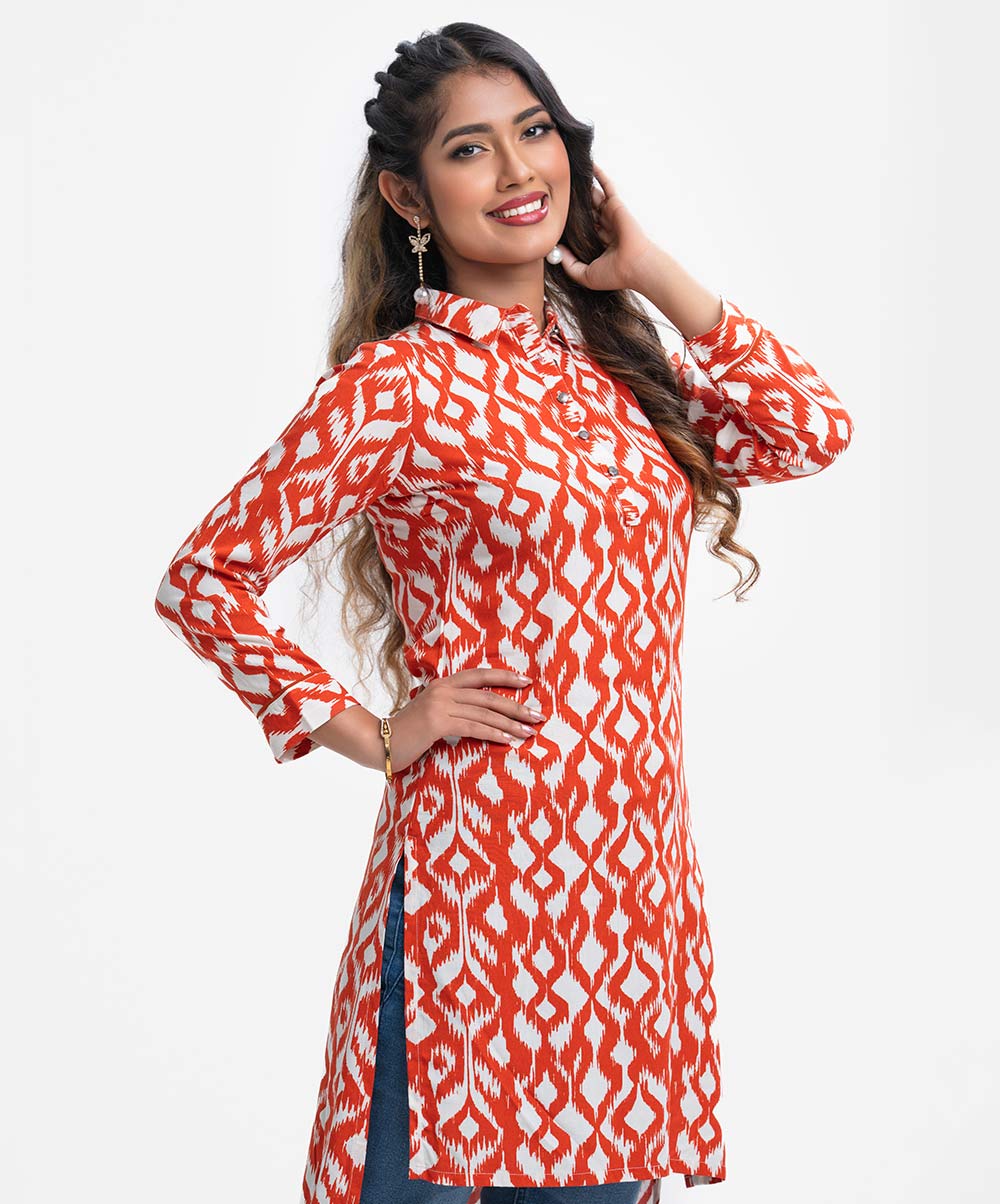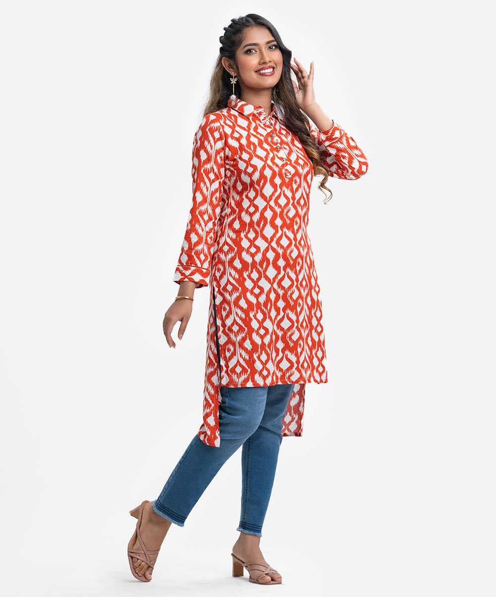 Women’s printed high-low hem straight kameez in viscose fabric. Classic collar, three-quarter sleeved. Button fastening at the front.
