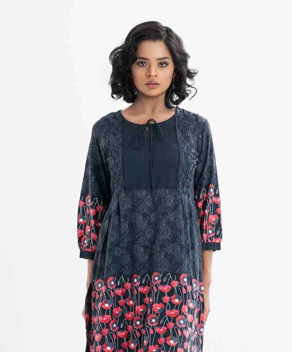 Women’s printed A-line kameez in cotton fabric. Round neckline with tie cord, three-quarter sleeves. Lace & diamond pintuck work at front.