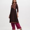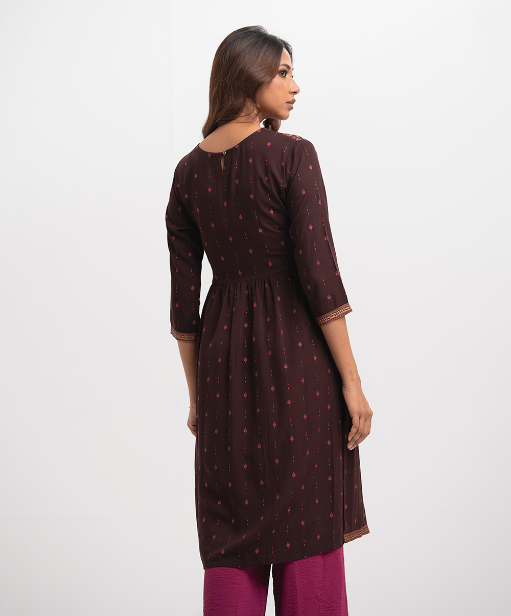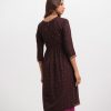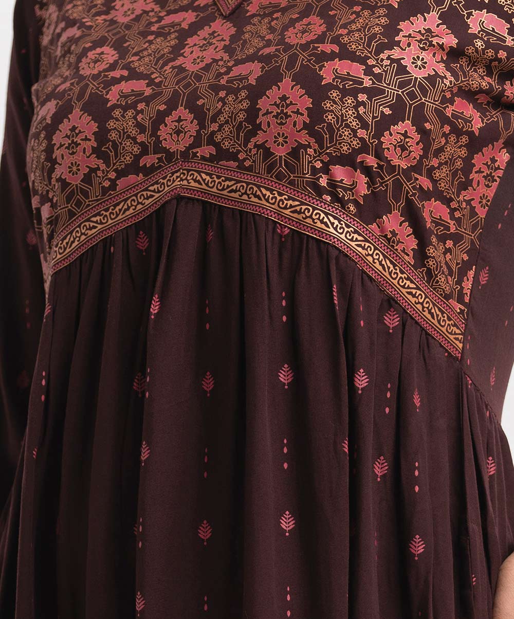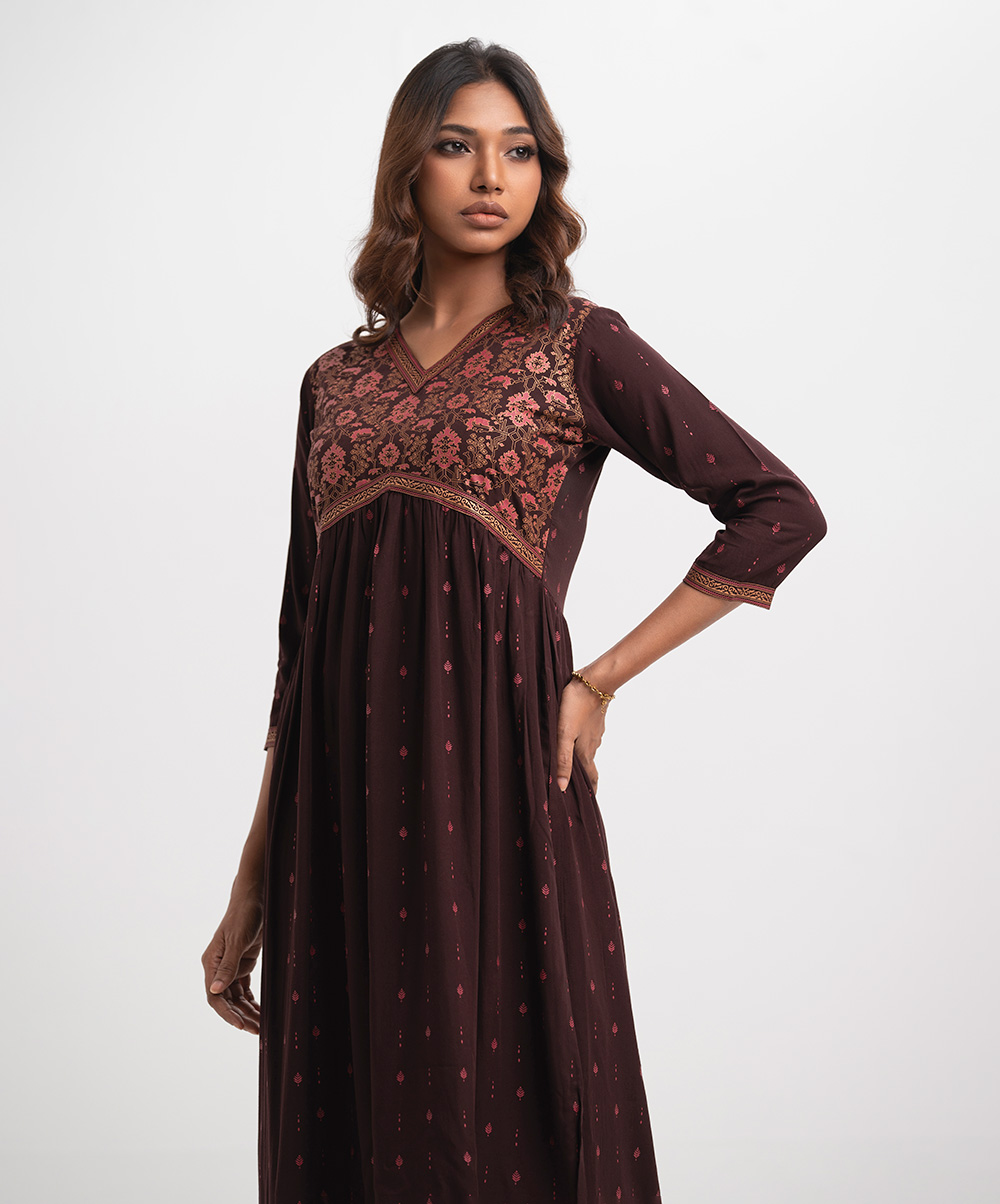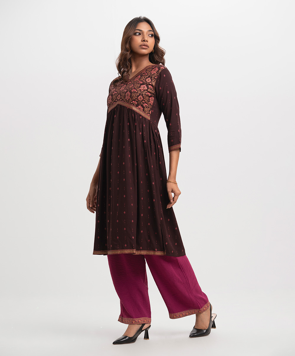 Gathered A-line kameez in viscose fabric. Three-quarter sleeves, V-neck, printed patch attached at the neck, cuffs and the waistline.