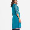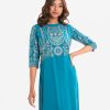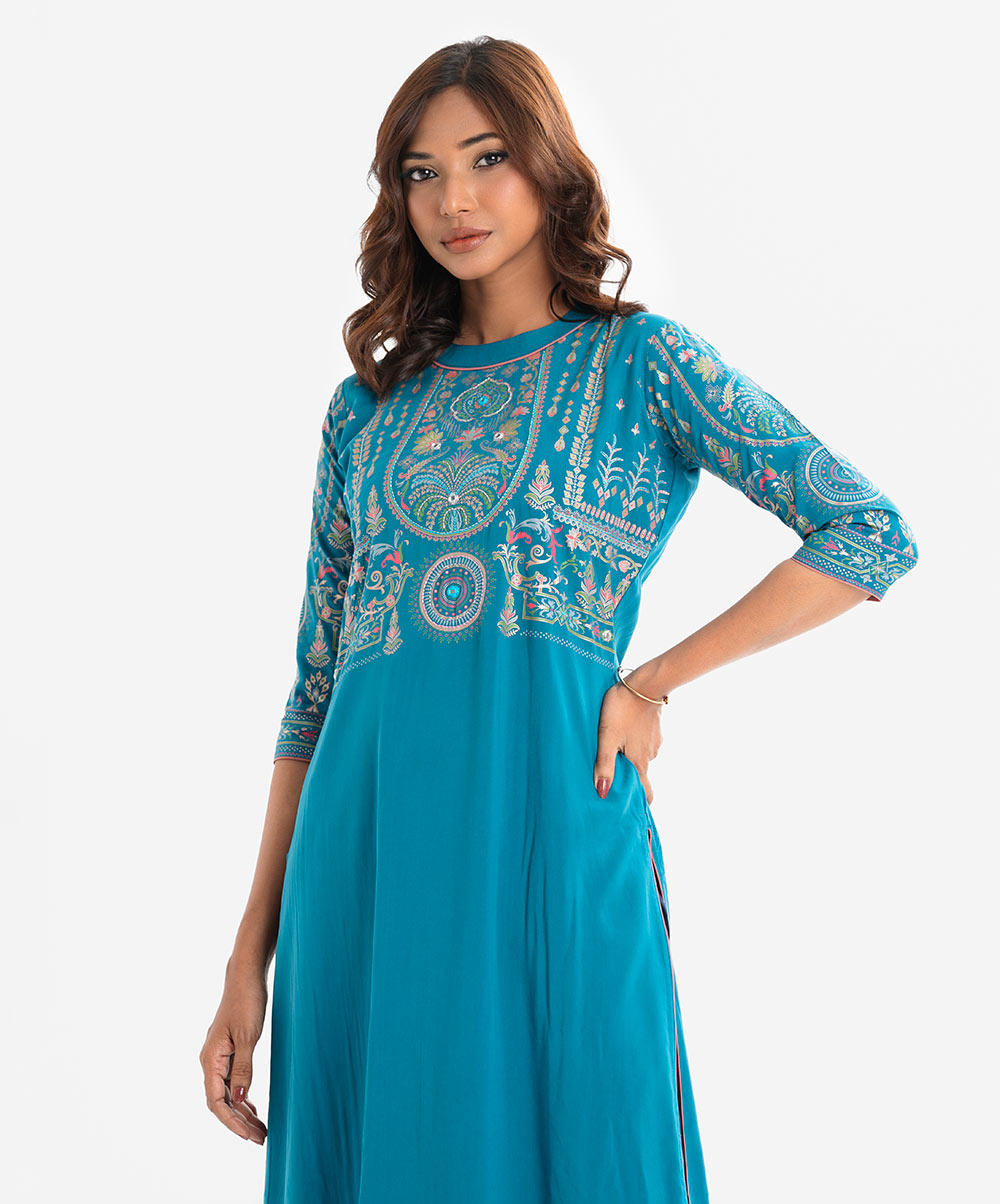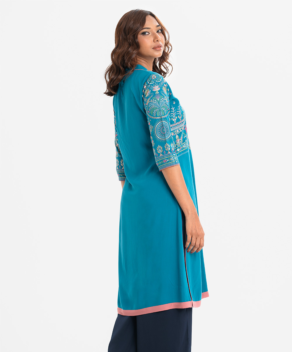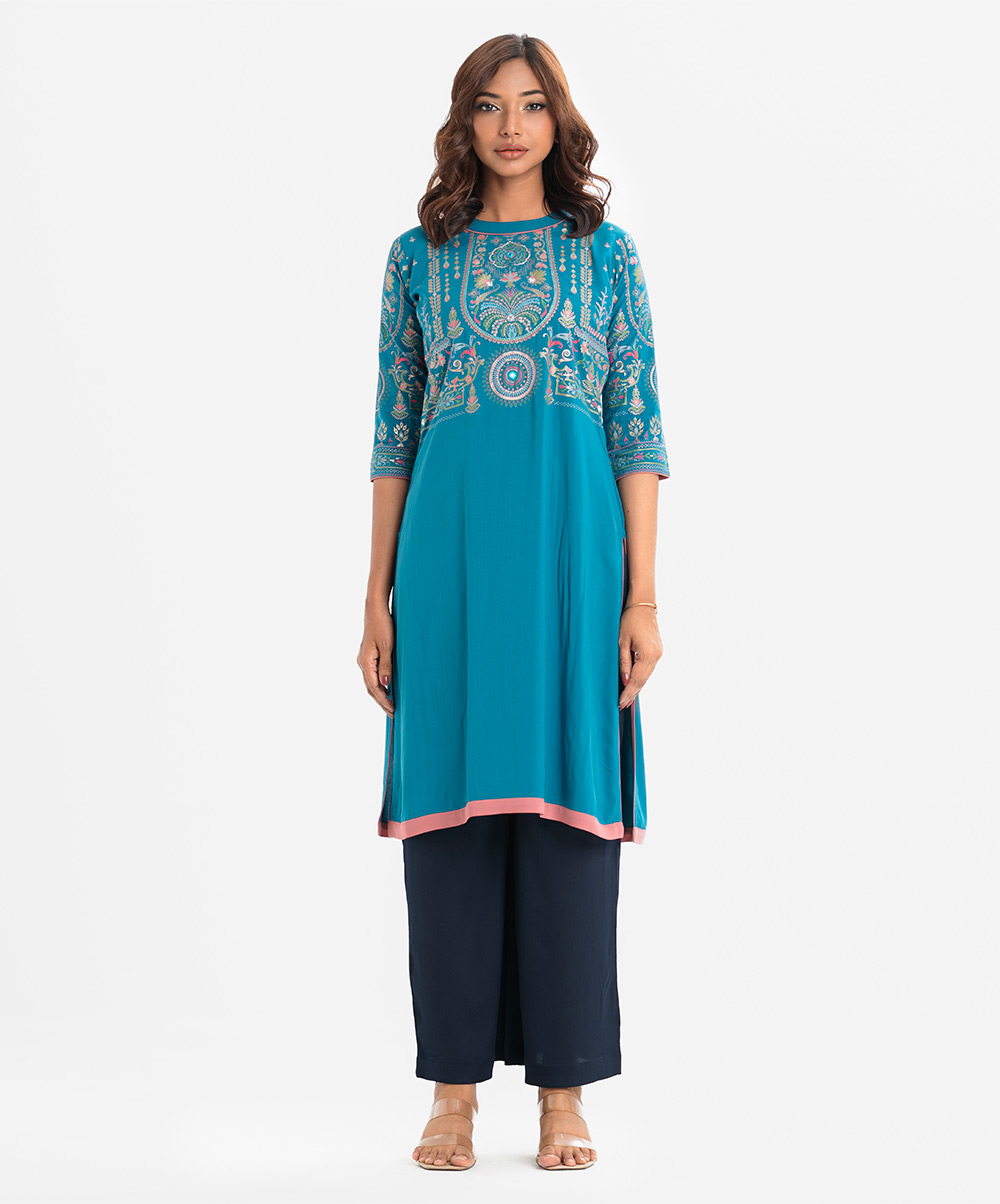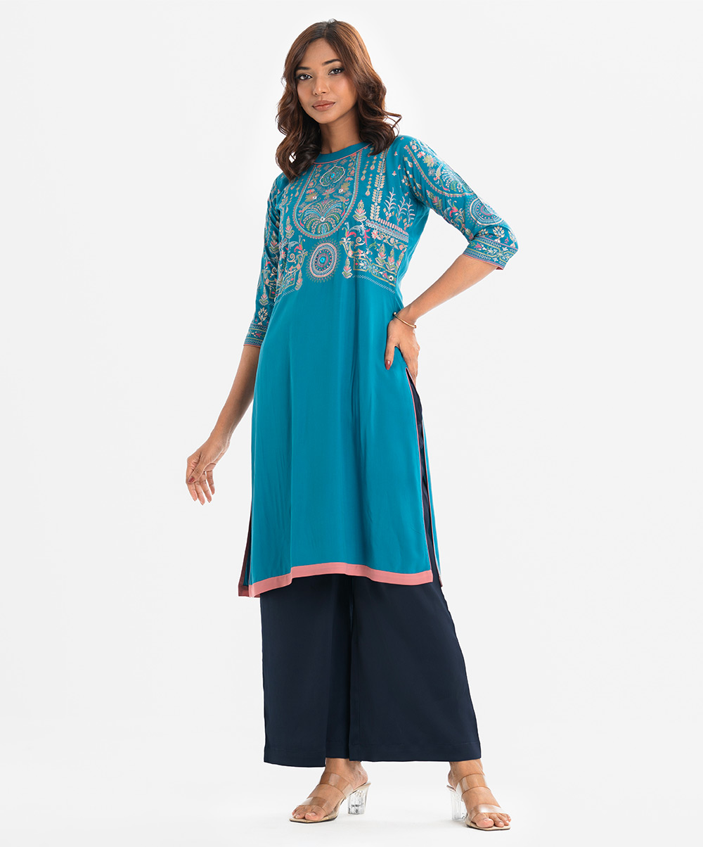 Women’s printed straight kameez in viscose fabric. Mock neck, three-quarter sleeves. Embroidery at front.