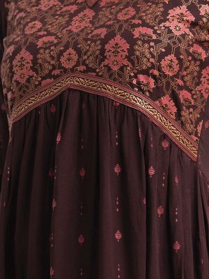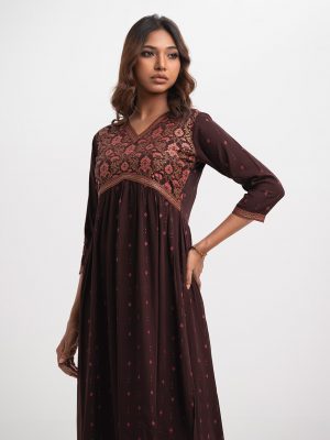 Womens floral printed straight kameez in crepe fabric. Boat neck, three-quarter sleeves and karchupi at the front.