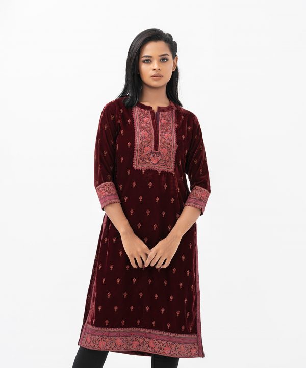 Women’s exclusive straight kameez from Nargisus by Le Reve. All-over karchupi detail kameez in velvet fabric. Stand collar, three-quarter sleeves. Patch at the sleeve cuffs, side border and hemline.