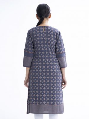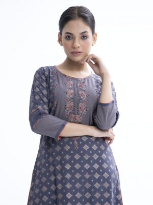 Women’s straight kameez in crepe fabric. Round neck, three-quarter sleeved. karchupi at the front.