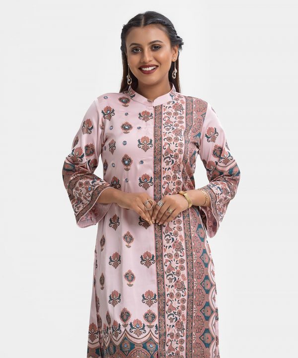 Women’s ethnic printed A-line kameez in georgette fabric. Bell sleeves, mandarin collar. Karchupi at the front and sleeves. Slit at the front hemline.