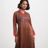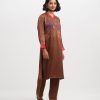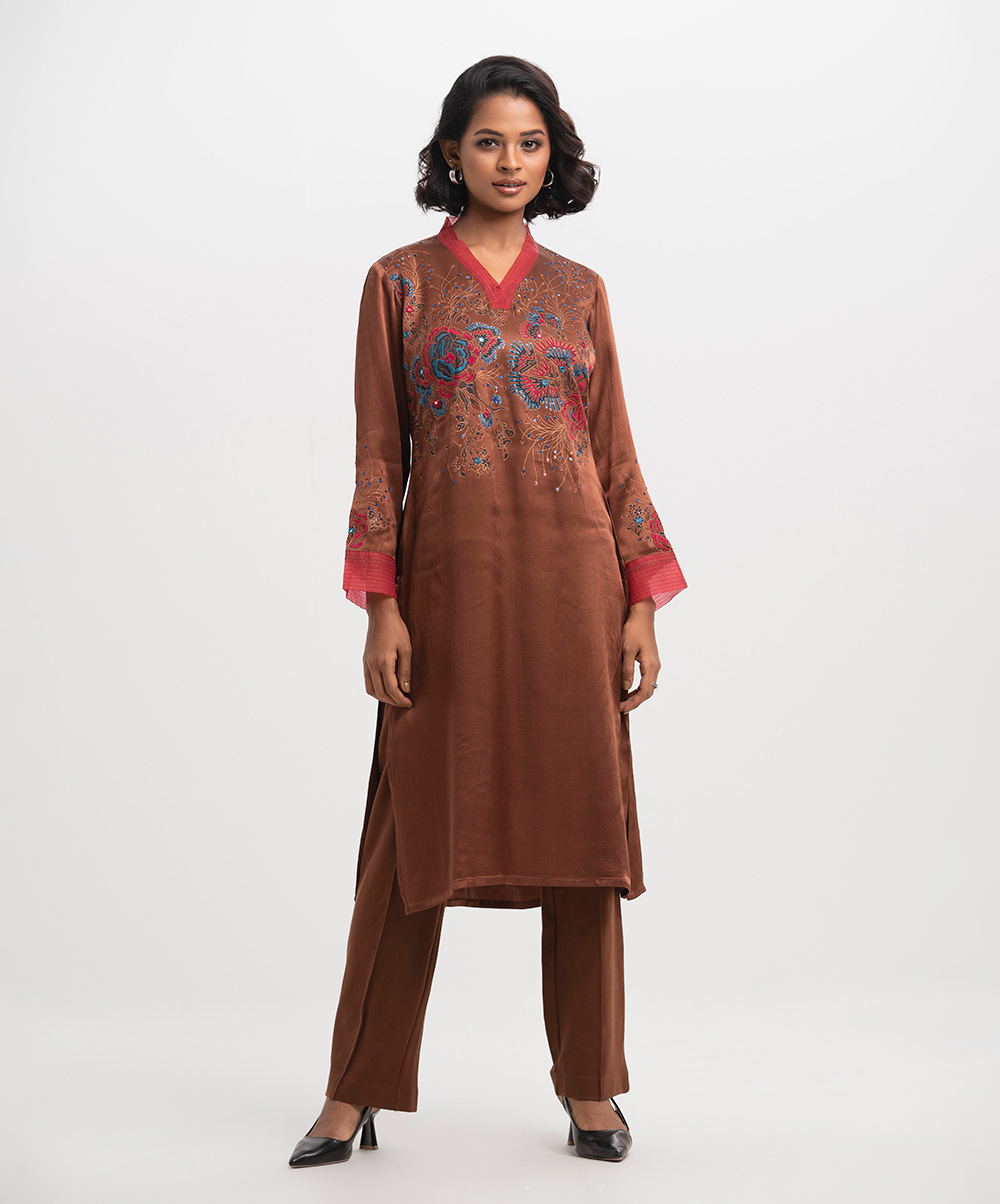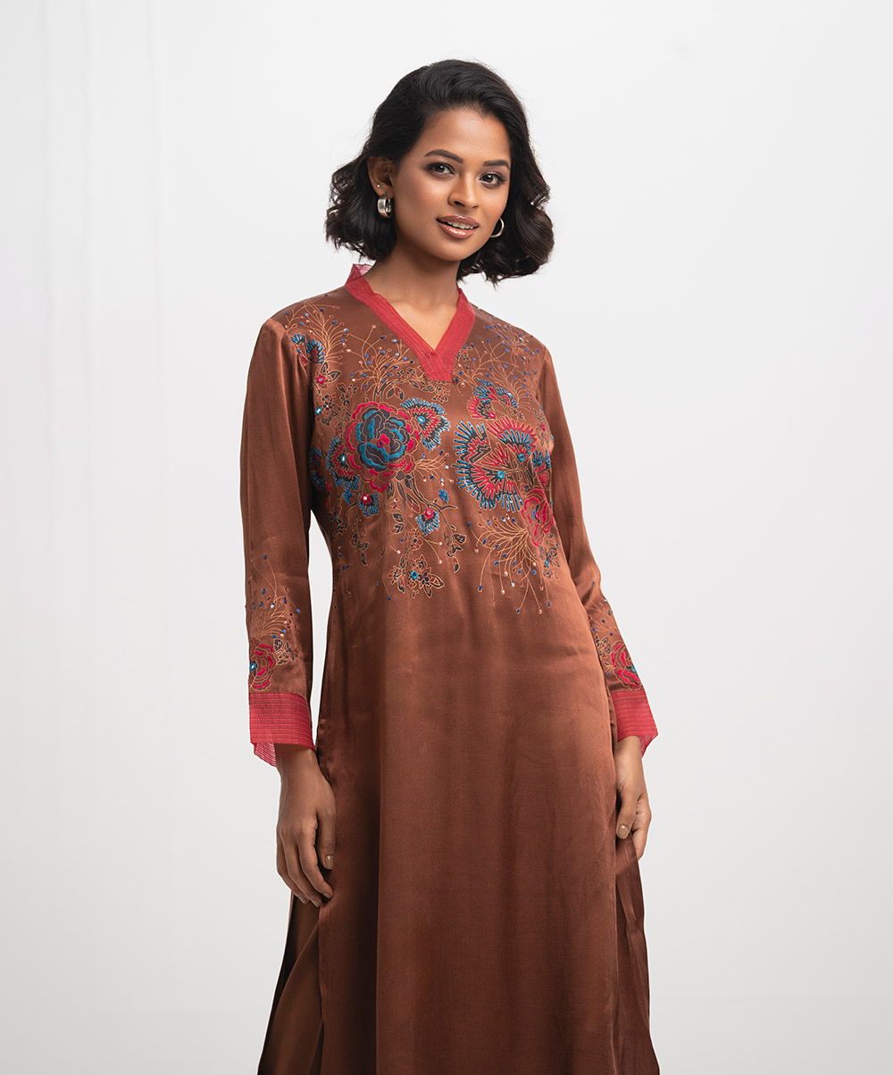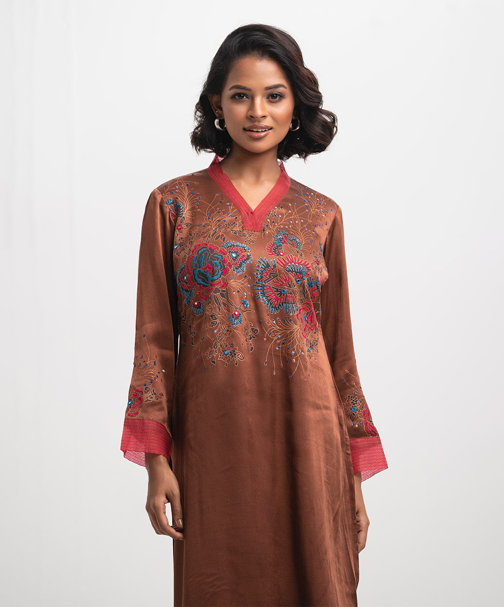 V-neck A-line kameez in silk viscose fabric from the Nargisus by Le Reve. Full sleeves, karchupi at the front and the sleeves.