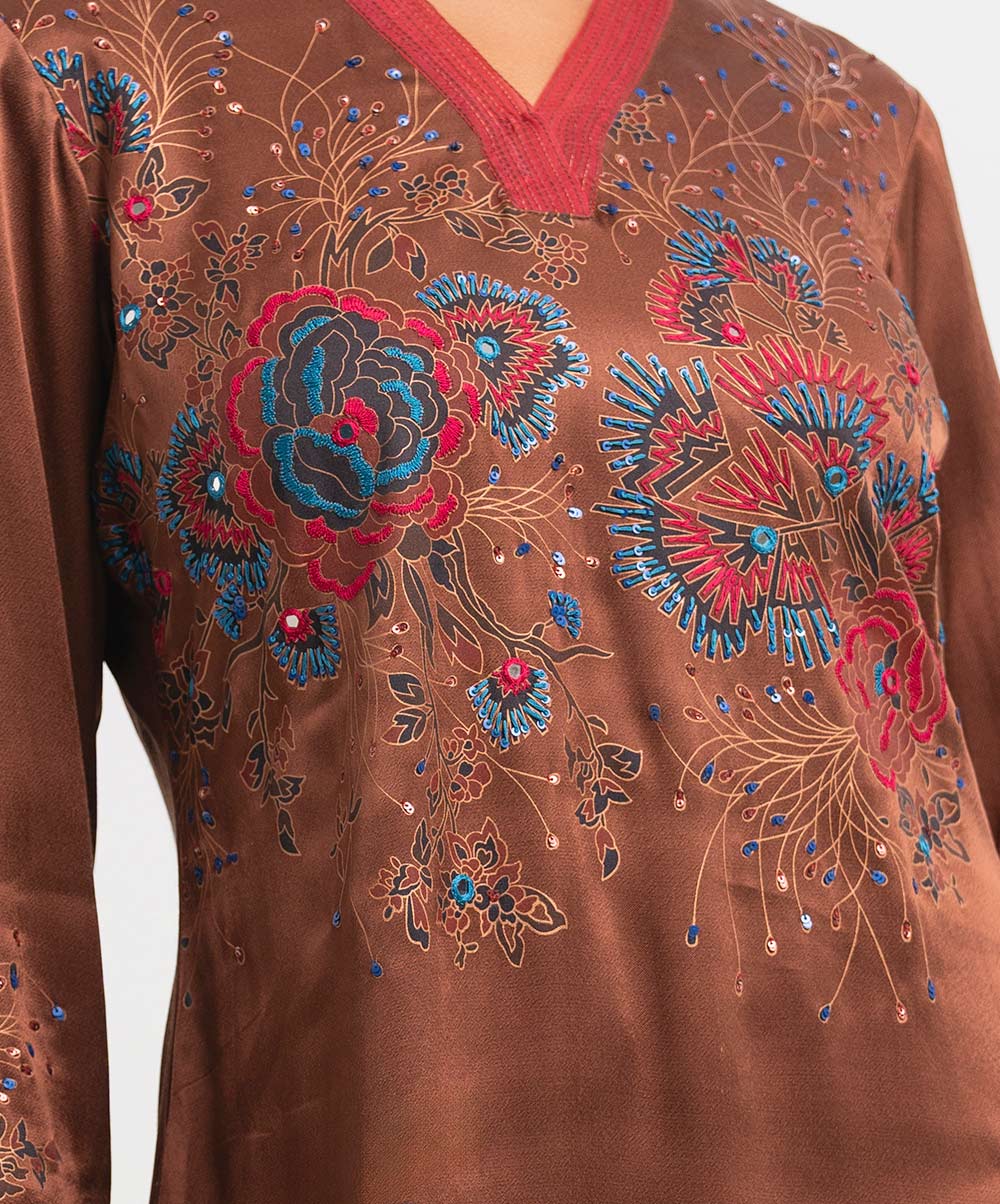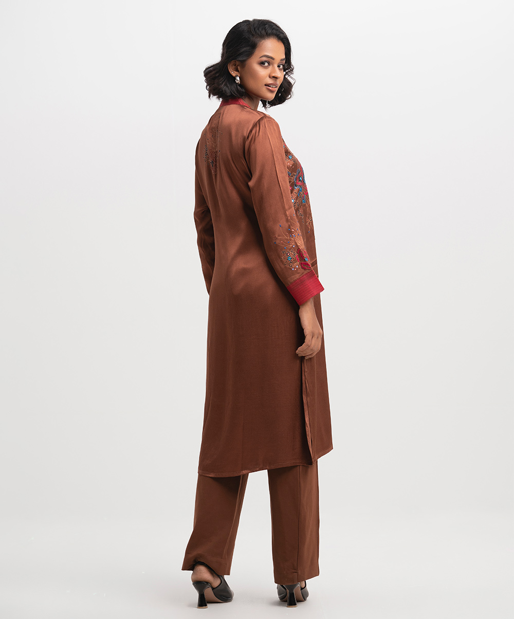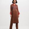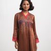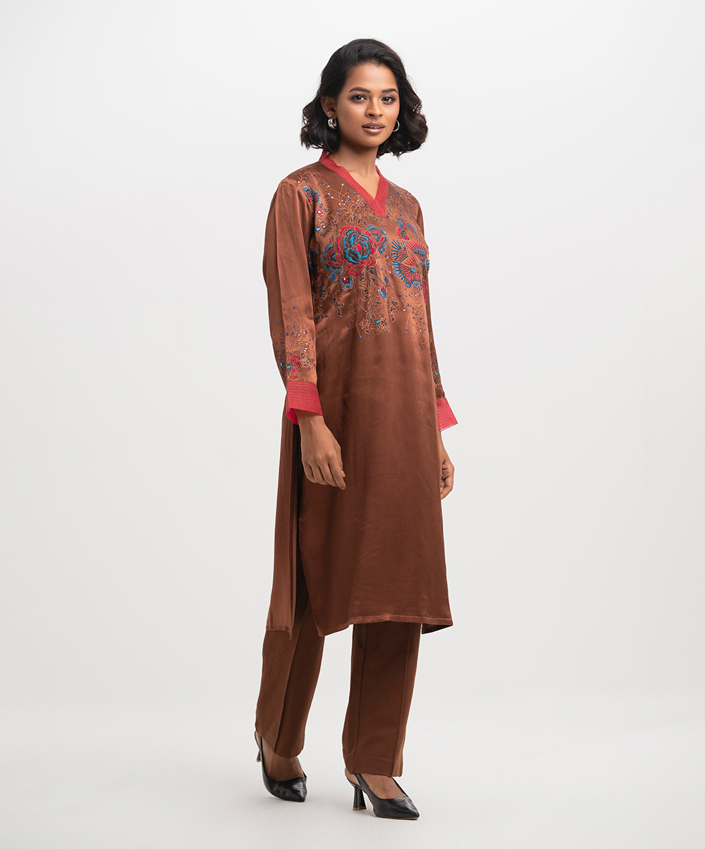 V-neck A-line kameez in silk viscose fabric from the Nargisus by Le Reve. Full sleeves, karchupi at the front and the sleeves.