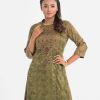 Women’s printed A-line kameez in textured georgette fabric. Three-quarter sleeves, mock neck. Embroidery at the front.