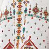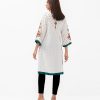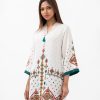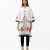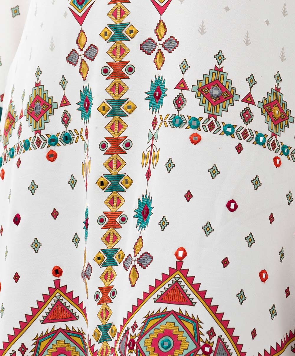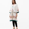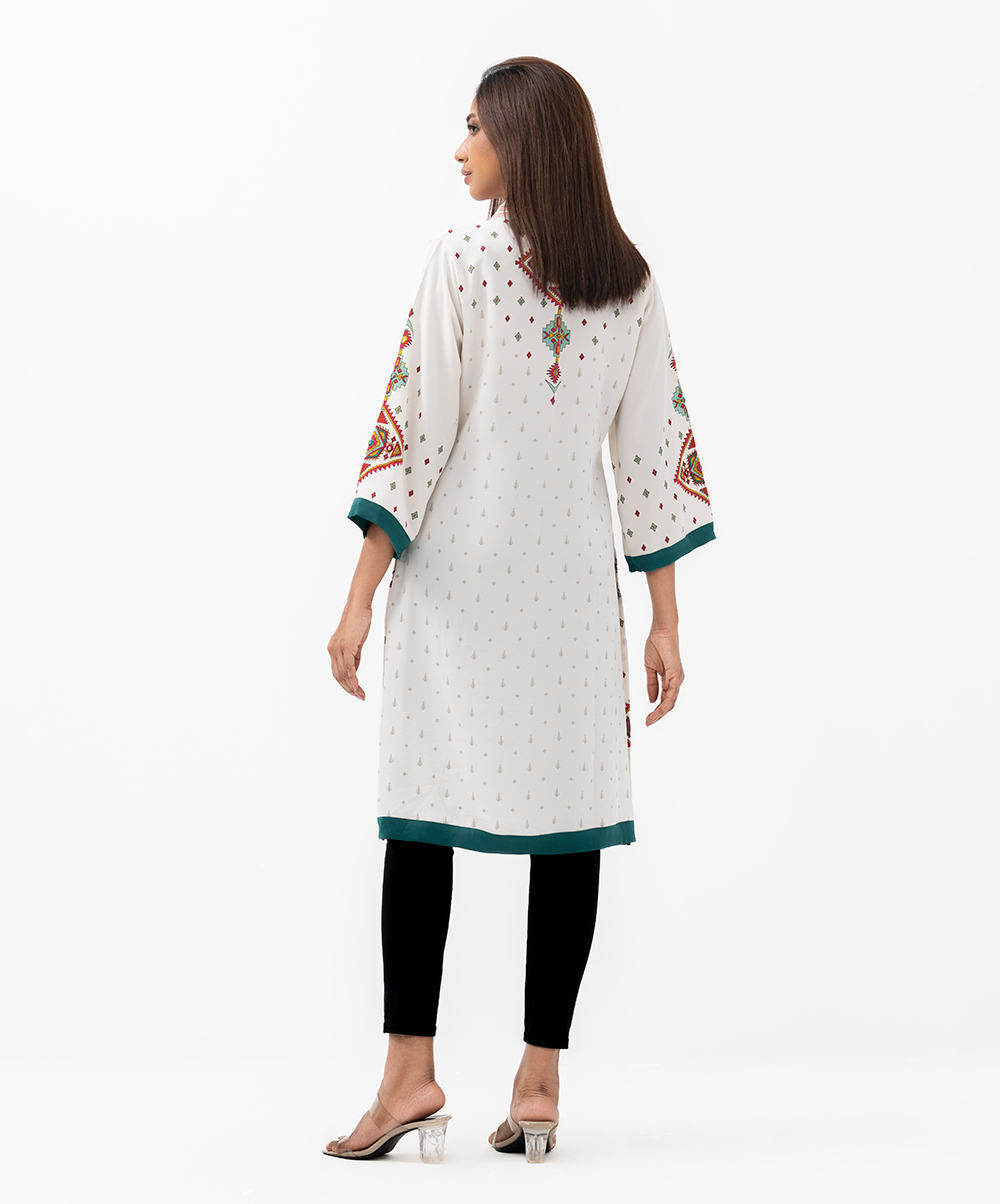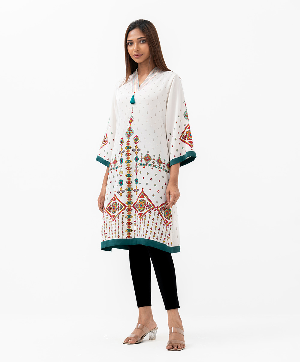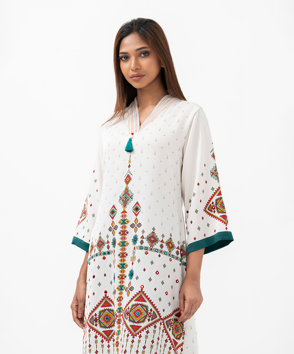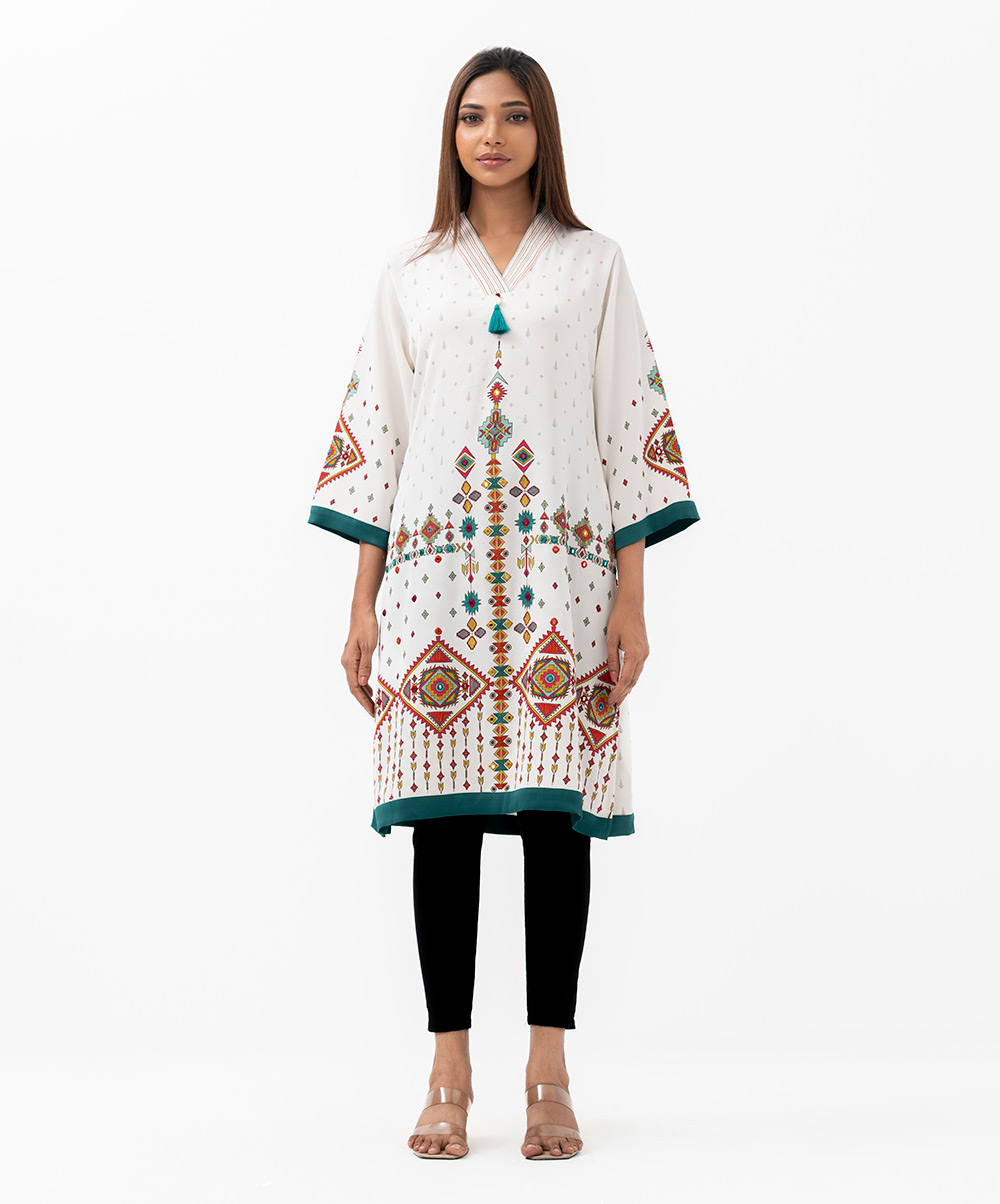 Women’s printed straight kameez in stretched georgette fabric. caftan collar, quarter sleeves and embroidery at the front.