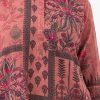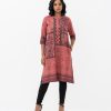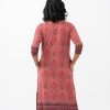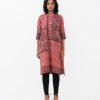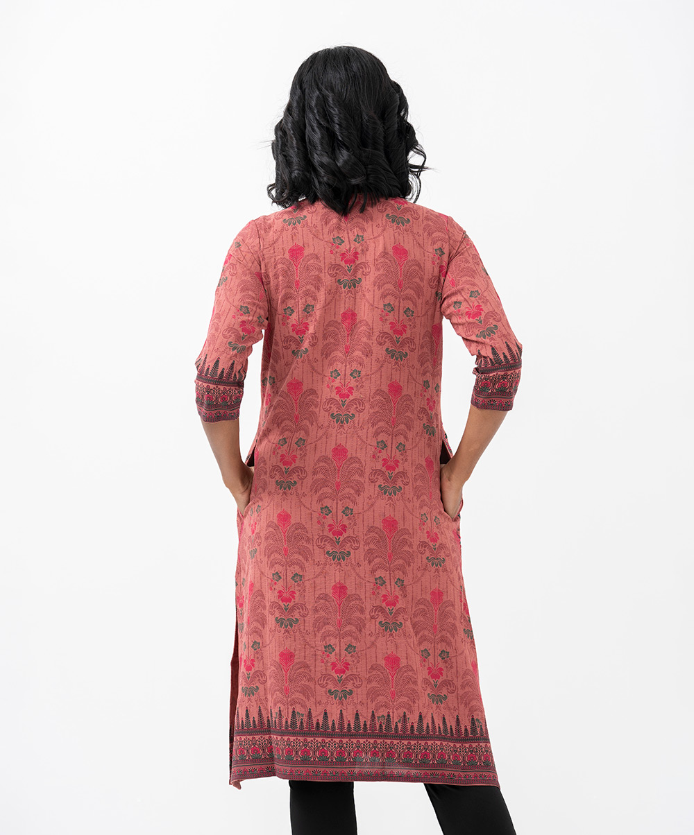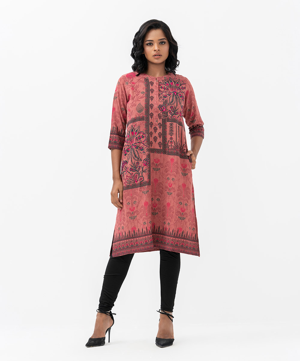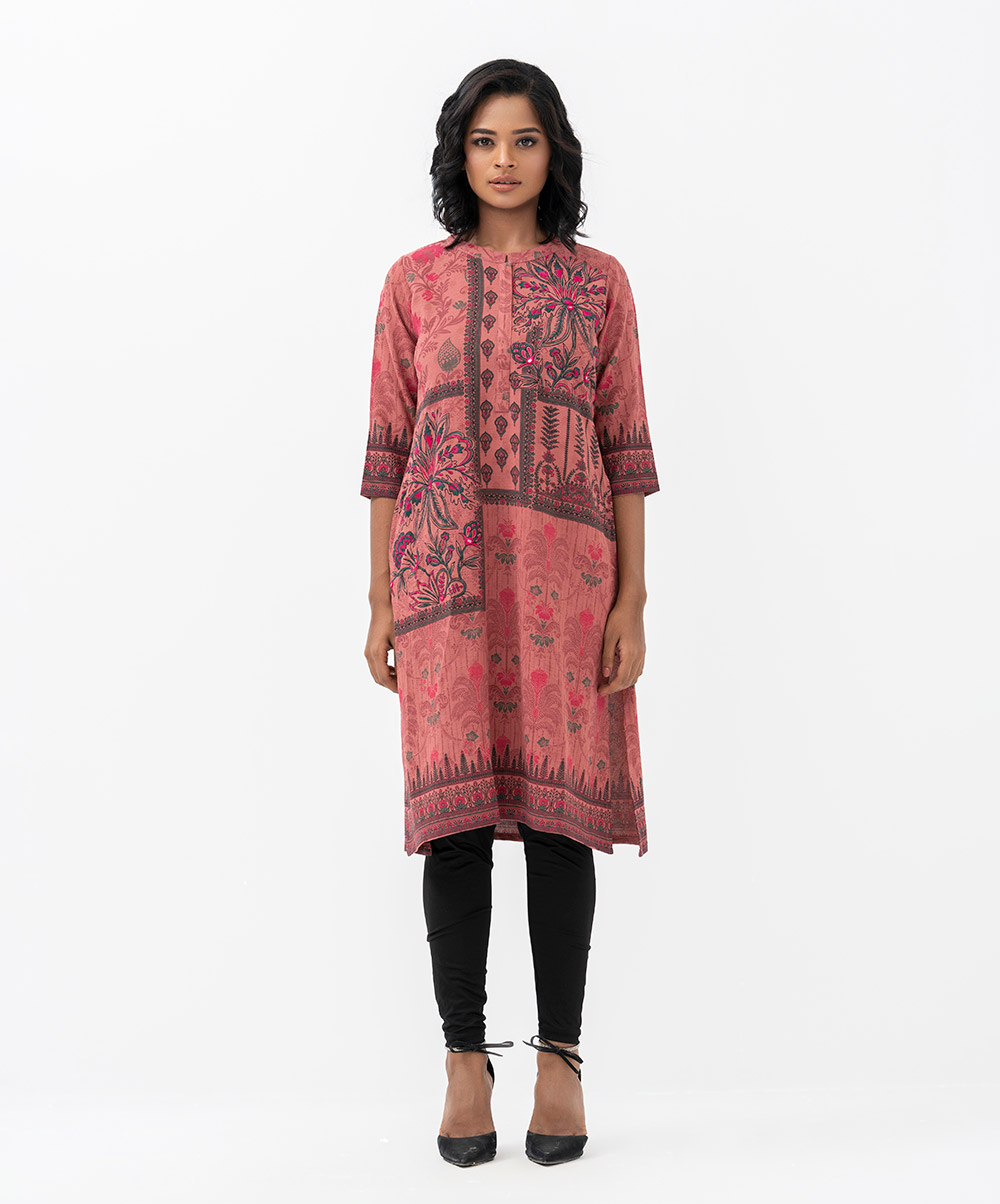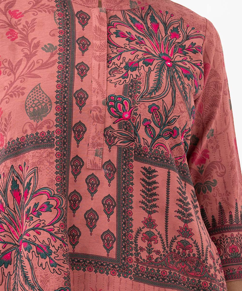 Women’s printed A-line kameez in georgette fabric. Stand collar, three-quarter sleeves and embroidery at the front.