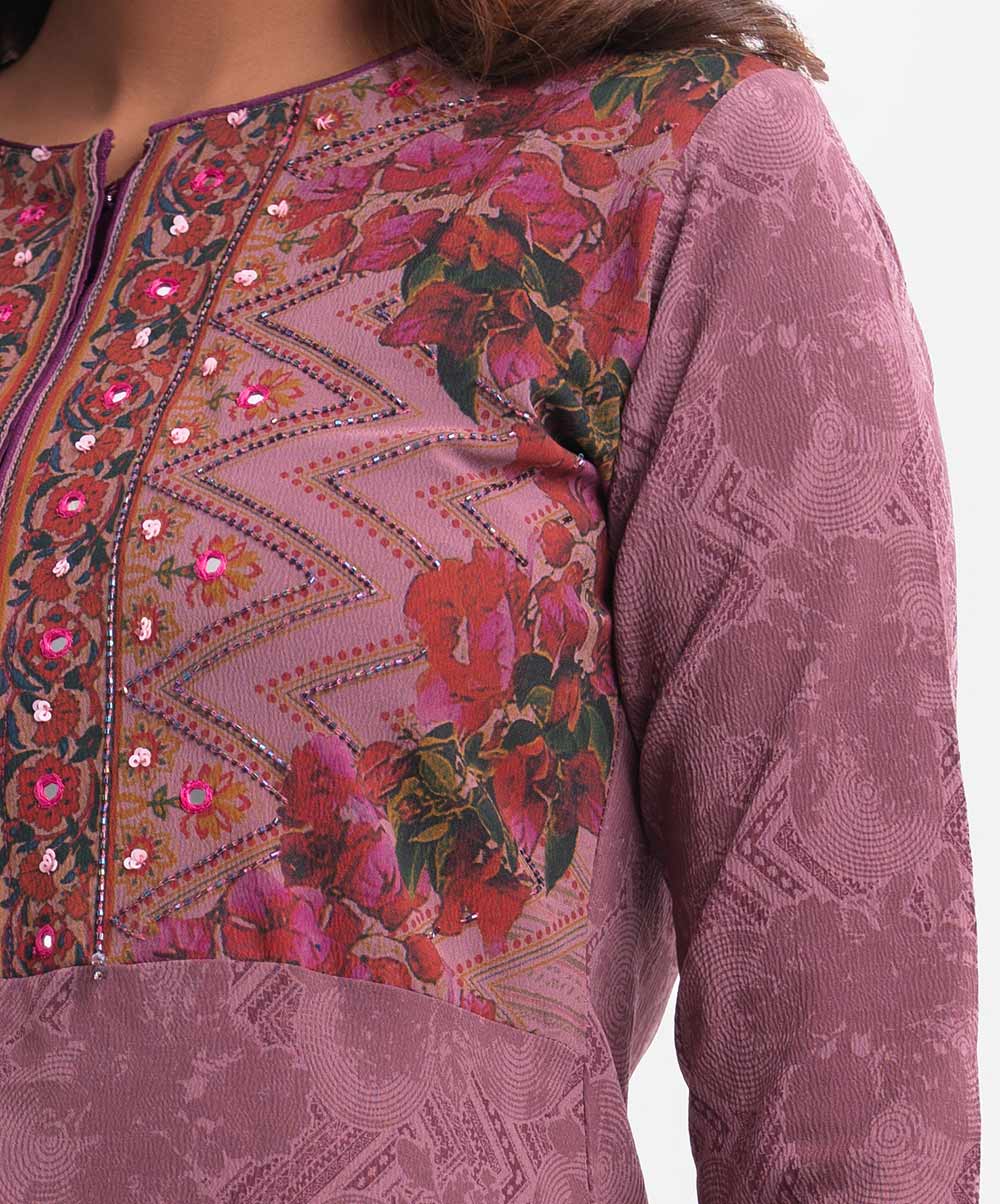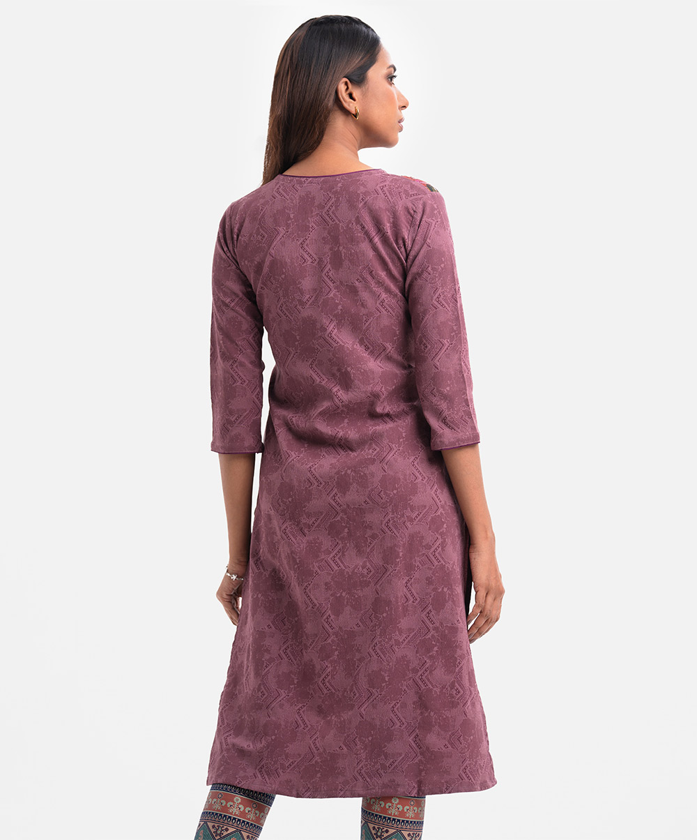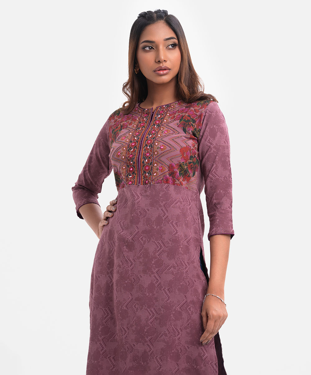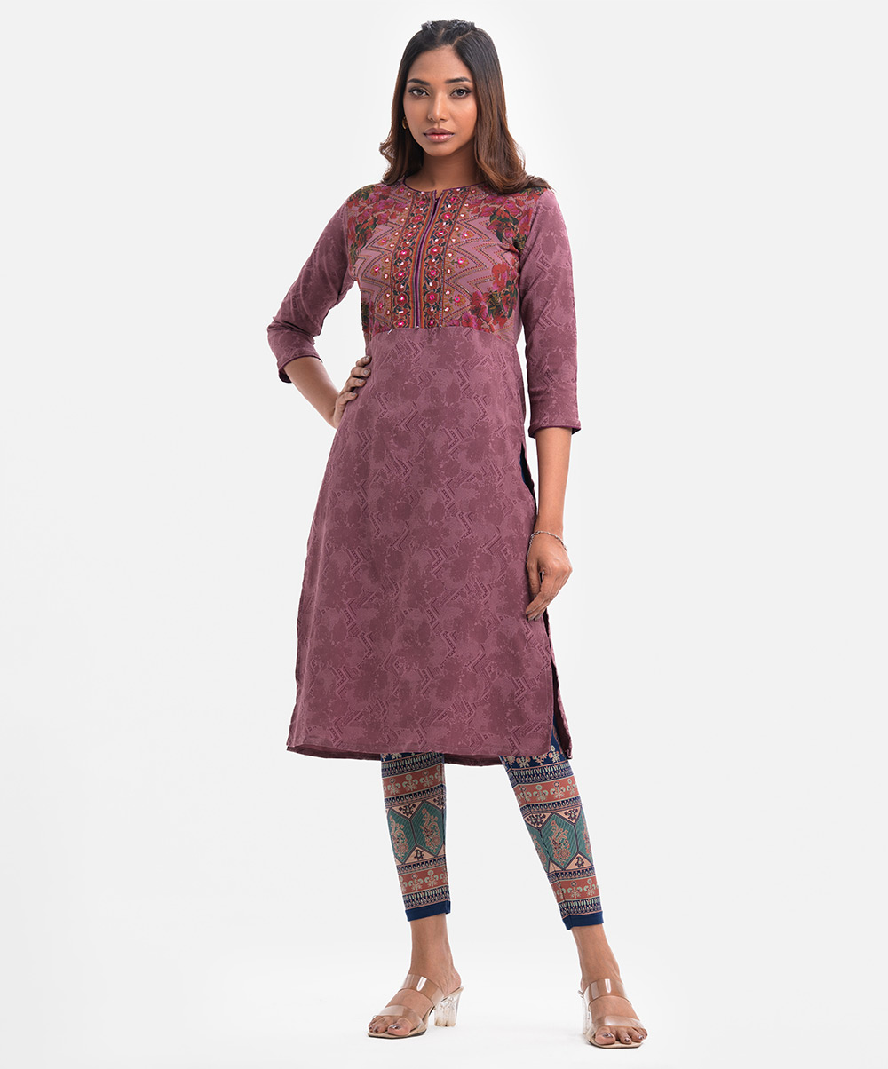 Women’s straight kameez in joom fabric. Round neck, three-quarter sleeves. Karchupi at the front.