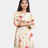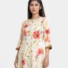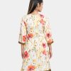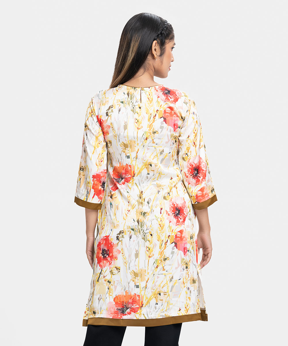 Round neck A-line kameez in soft amino satin fabric. Three-quarter sleeves, karchupi at the front.