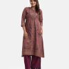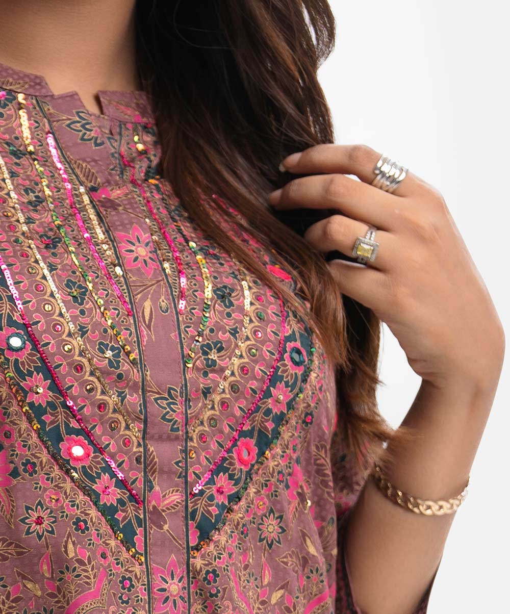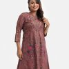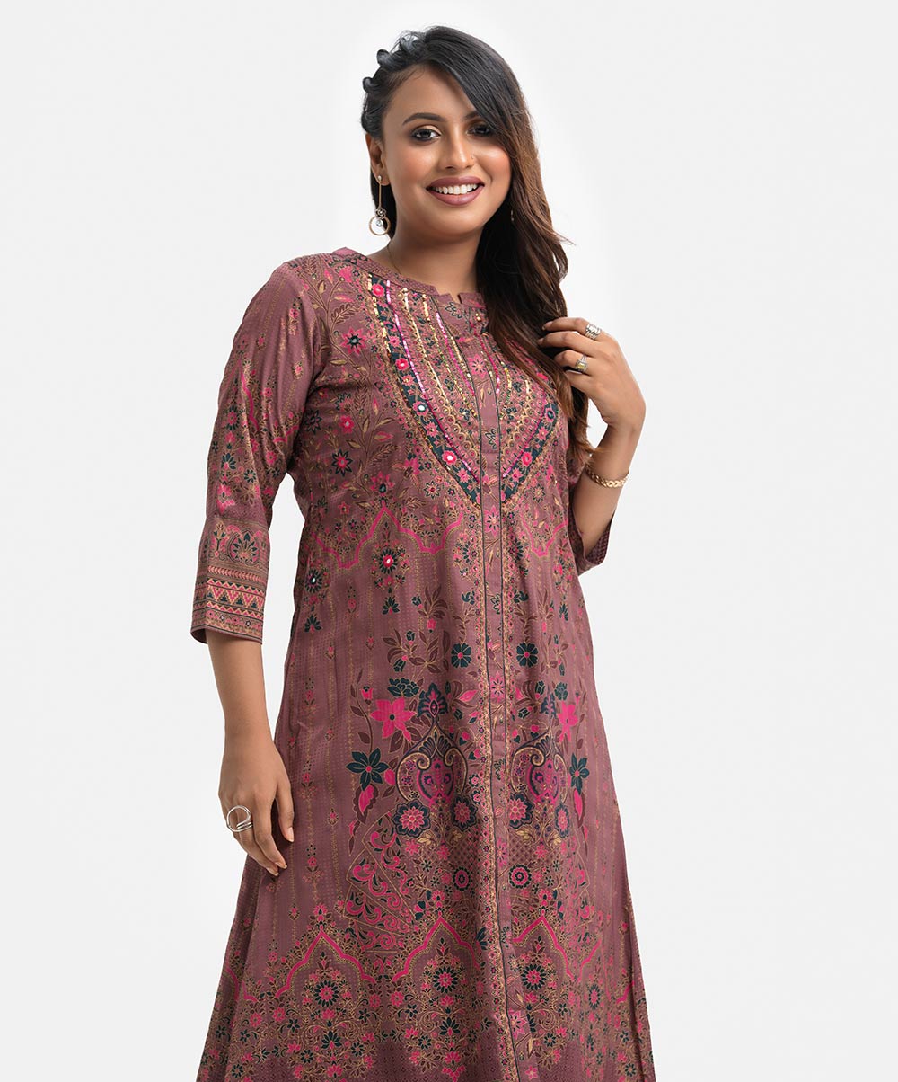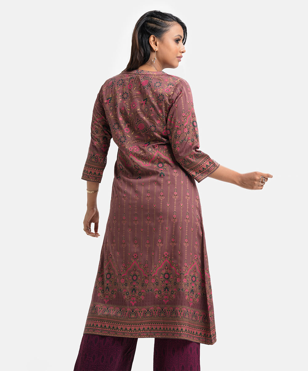 Women’s printed A-line long tunic in textured georgette fabric. Stand collar, three-quarter sleeved. Karchupu and slit at the front.