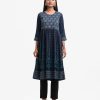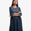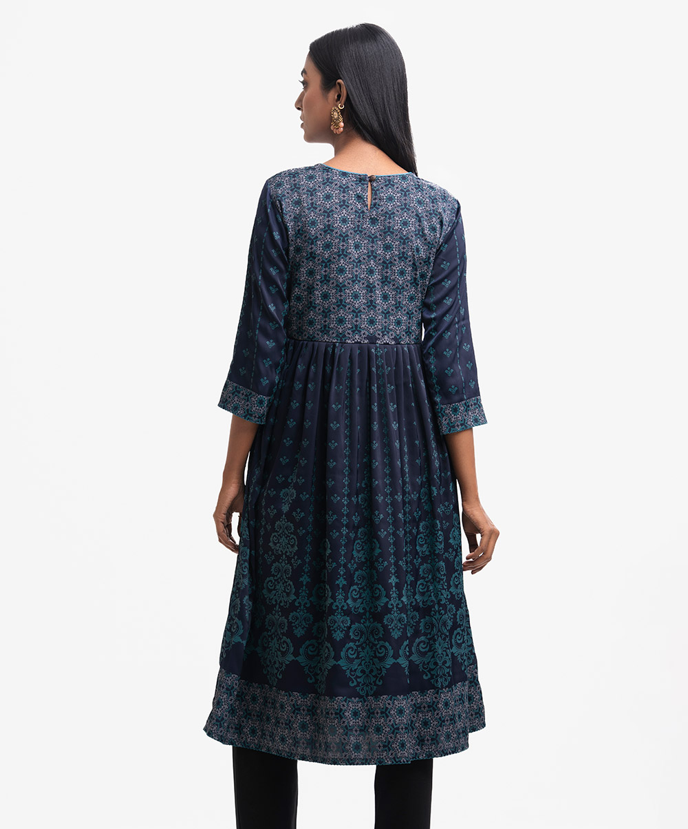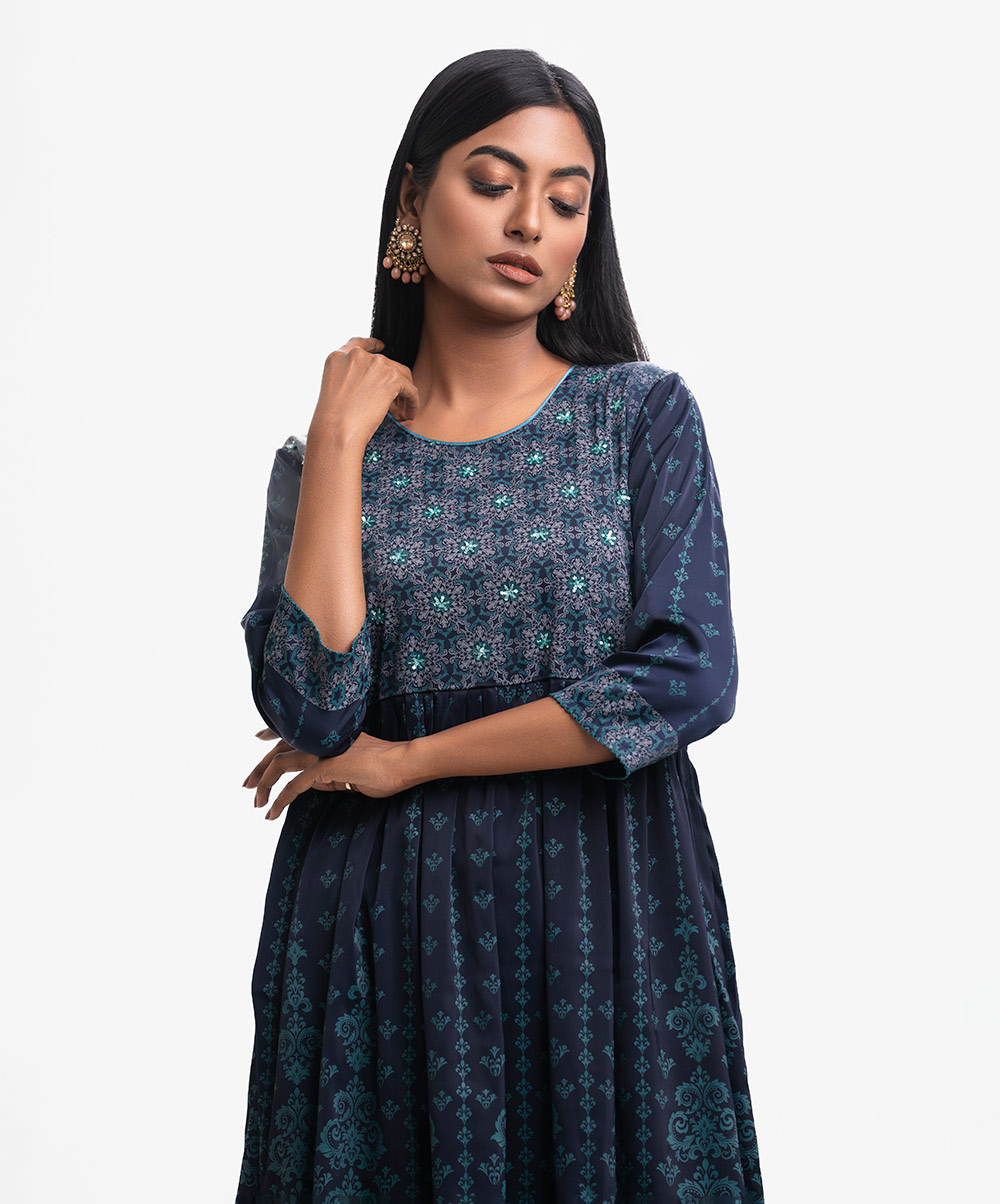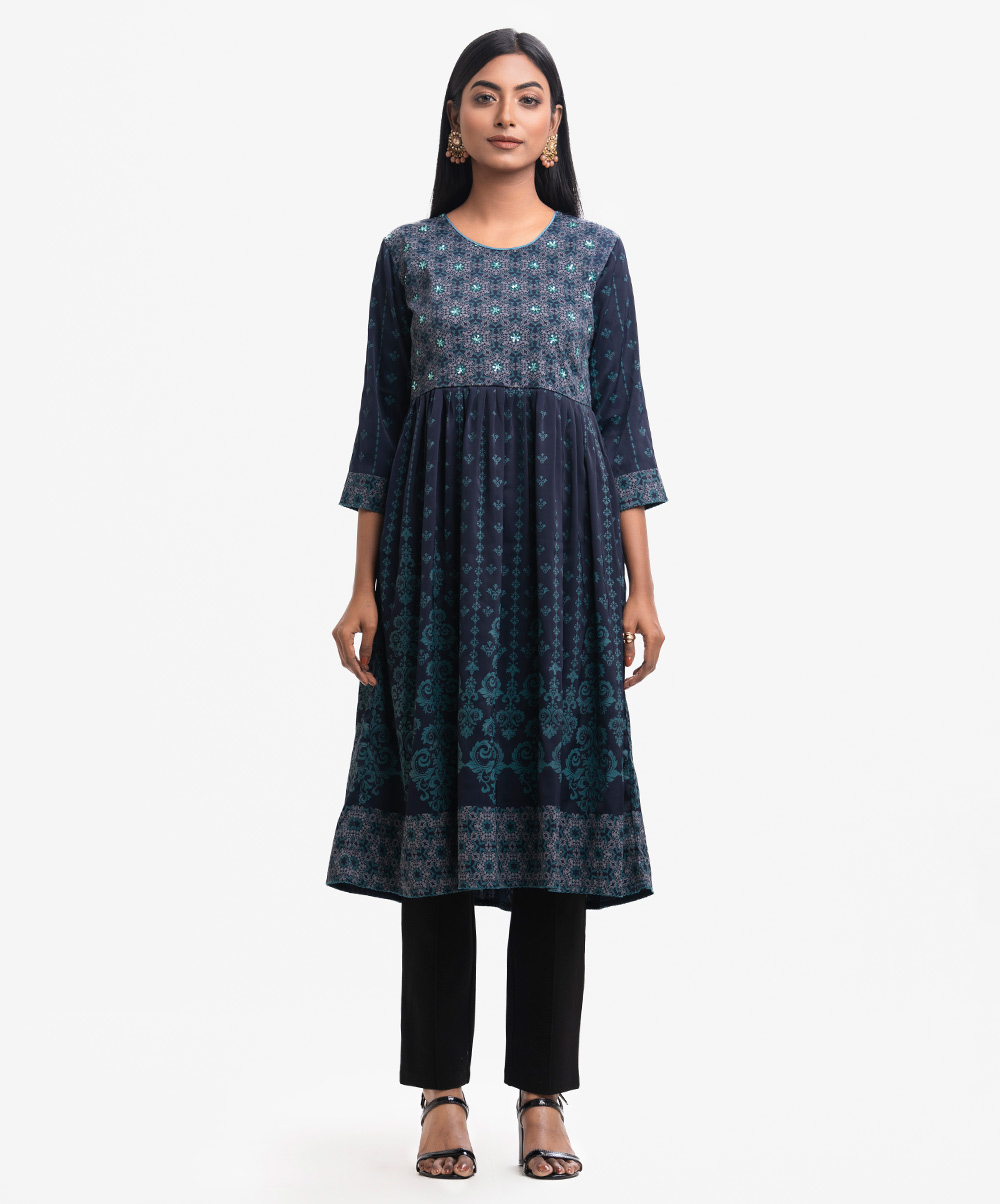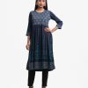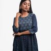 Woman’s printed A-line long tunic in joom fabric. Three-quarter sleeves, round neck. Gathered waistline & karchupi at front.
