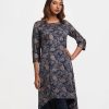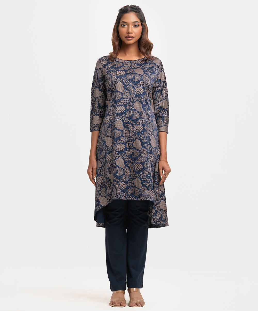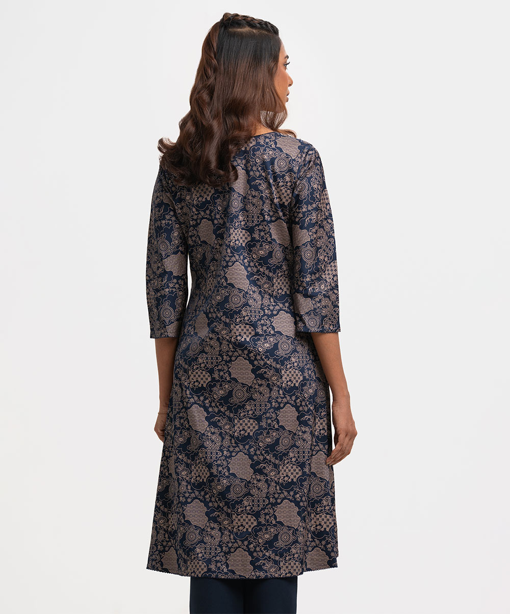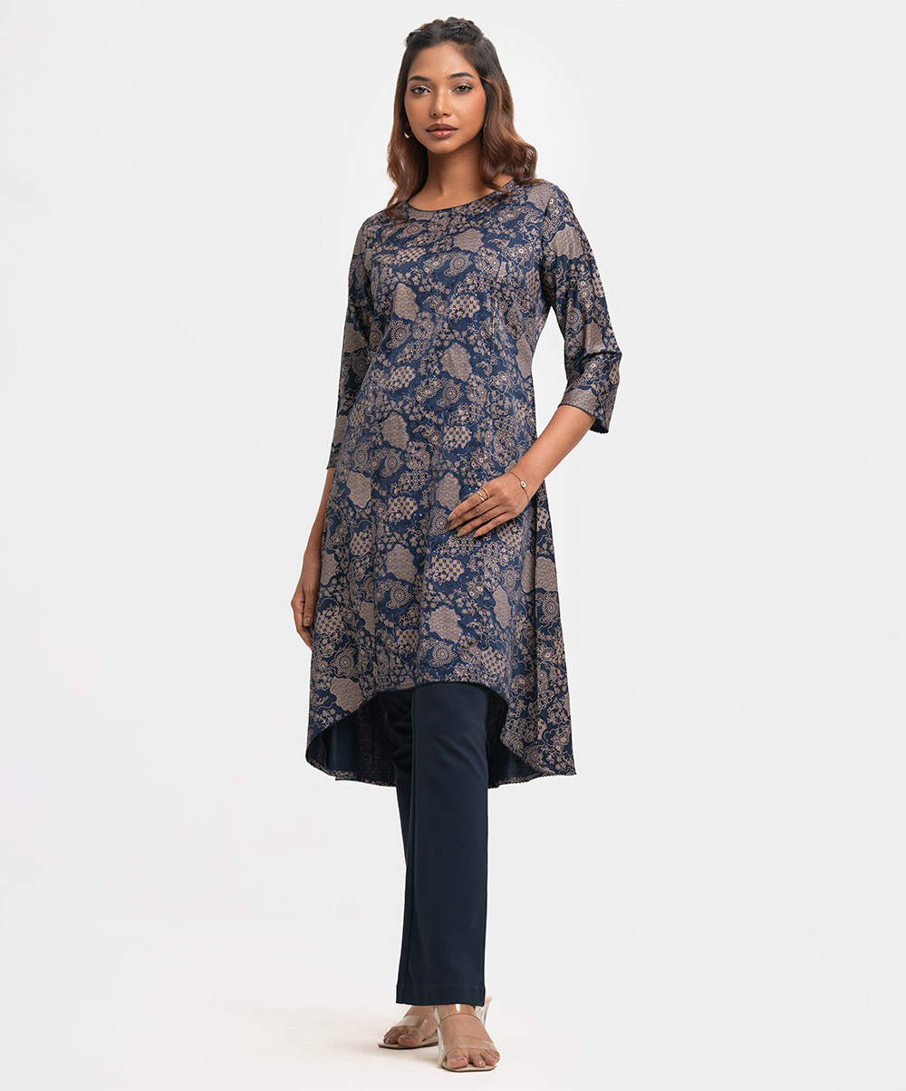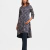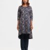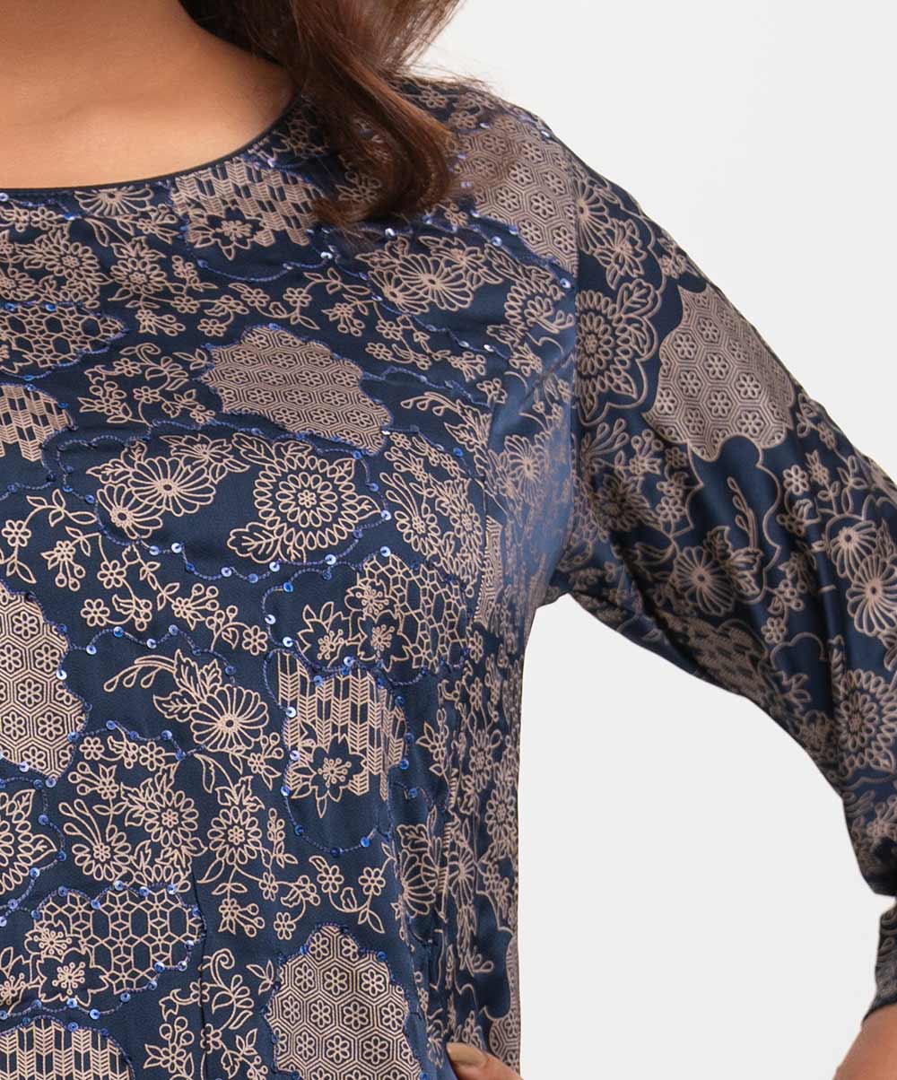 Princess-patterned long tunic with three-quarter sleeves in crepe fabric. Round neck, high-low hemline with sequin details at the front.