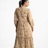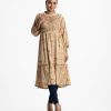 Women’s frock style long tunic in floral printed zoom fabric. Mock neck, three-quarter sleeves. Frill trim with pin tuck at front. Gathered waistline with tie belt.