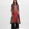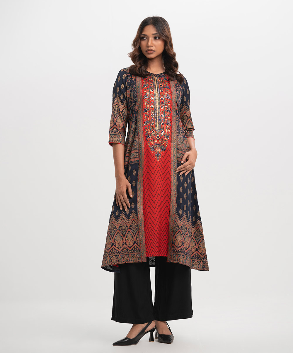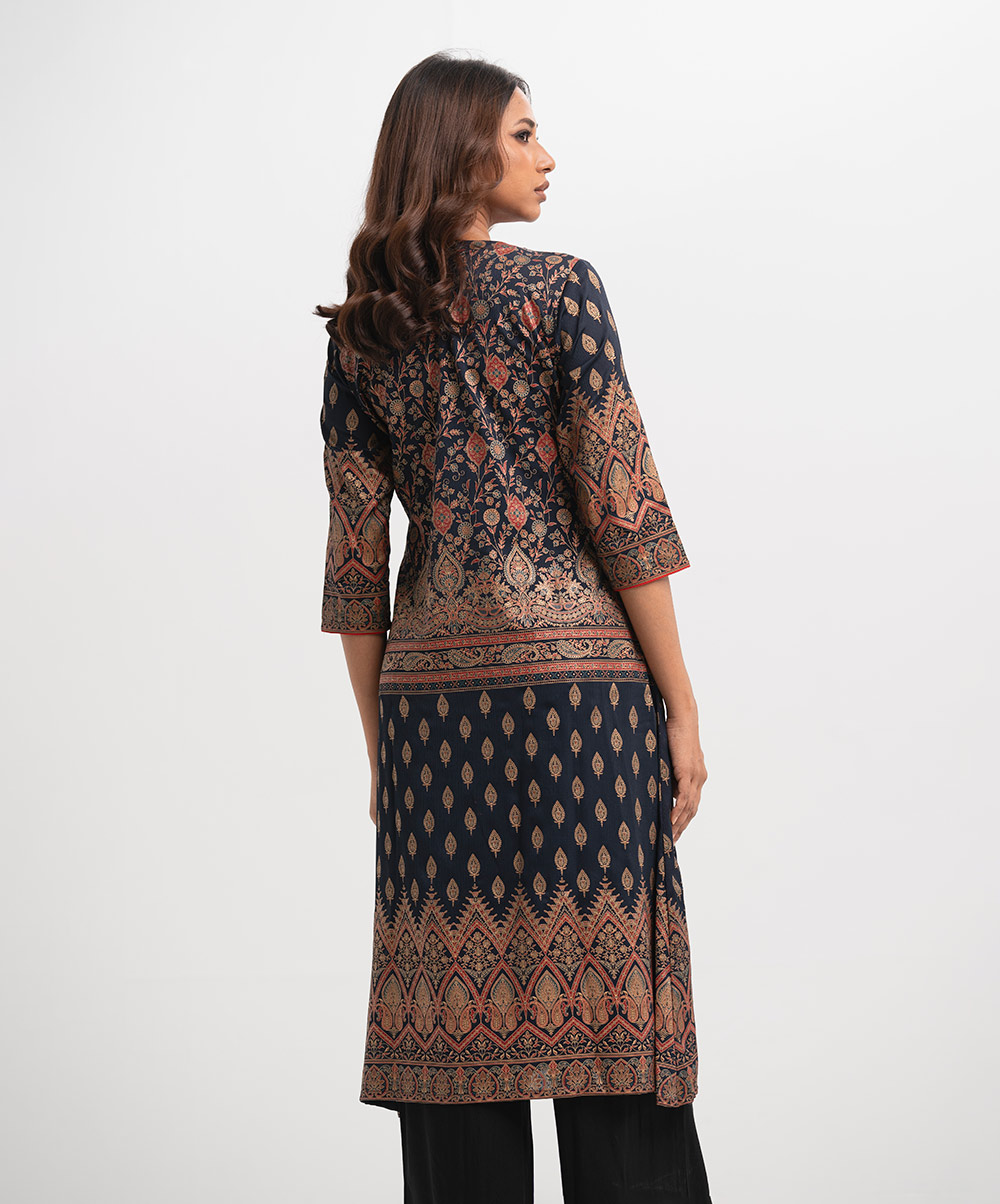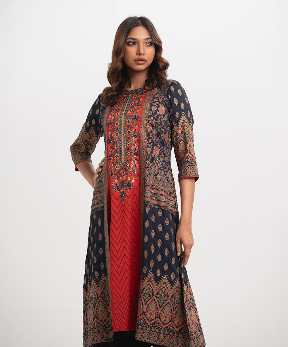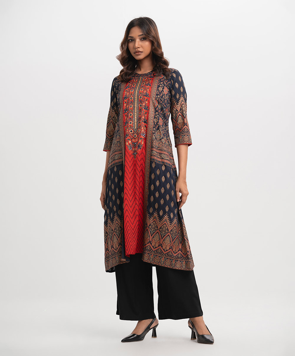 Shrug-style long tunic in joom fabric. Mock neck, three-quarter sleeves, karchupi at the front.