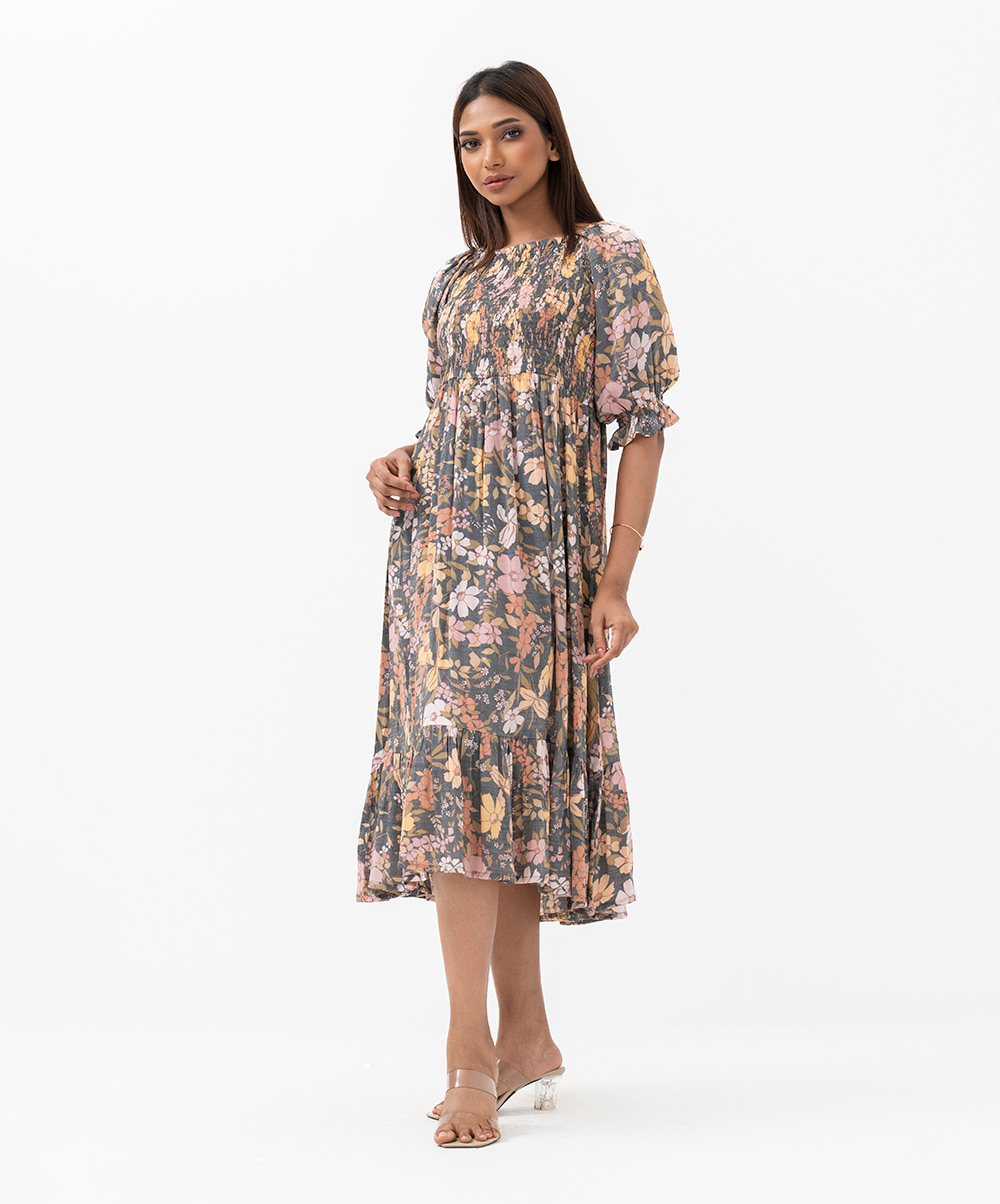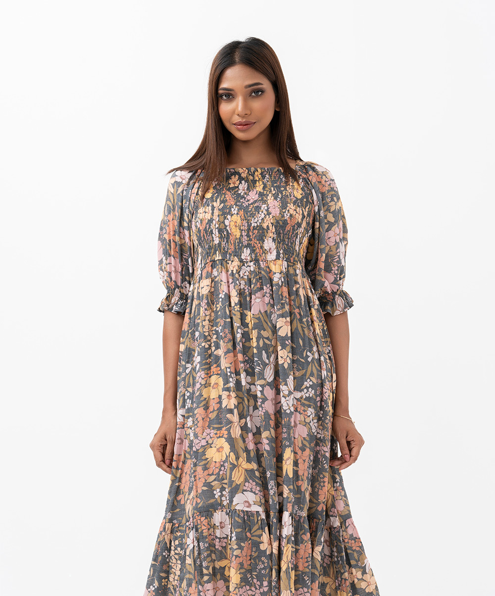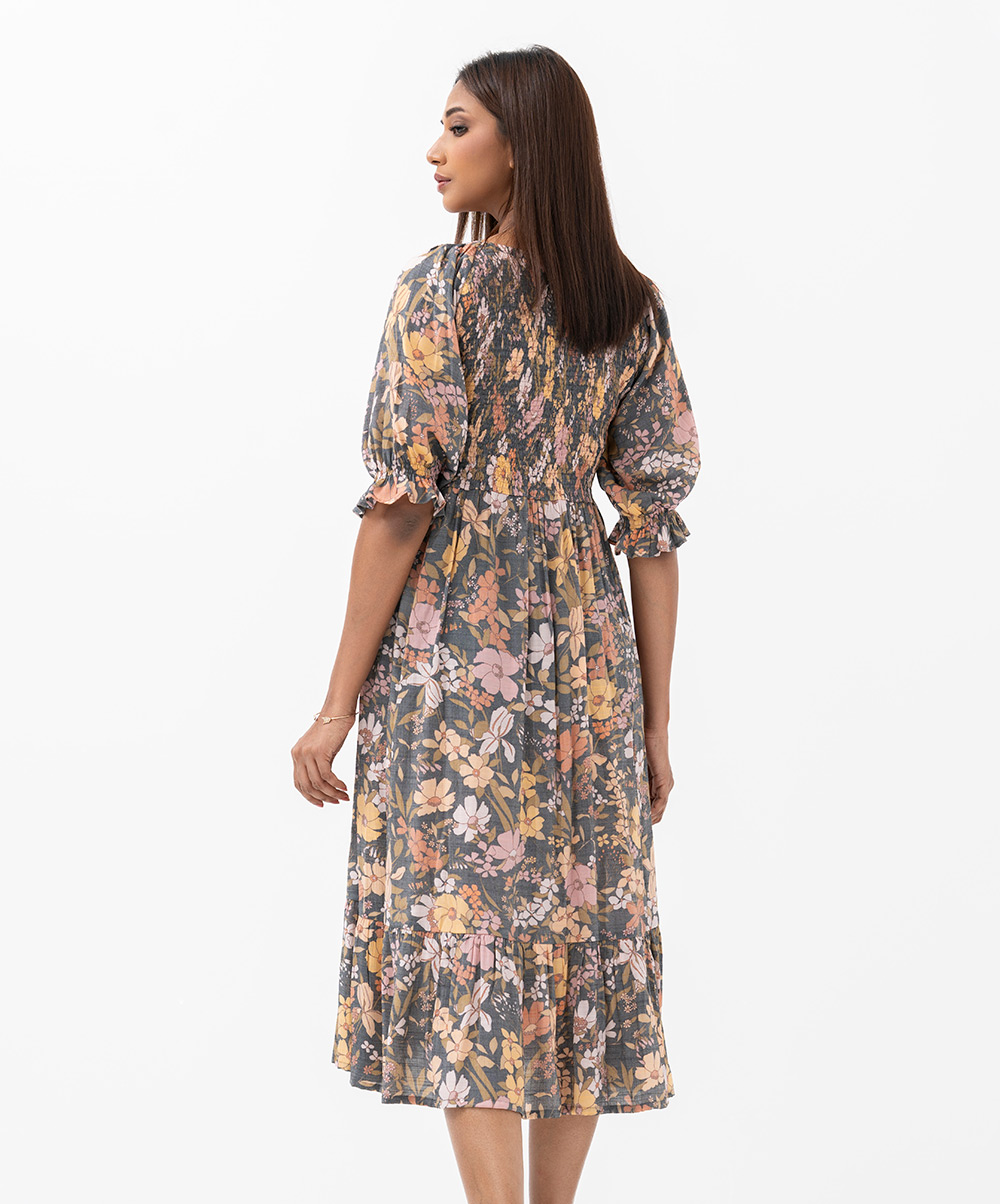Women’s printed flared style long tunic in blended cotton fabric. Square neck, three-quarter sleeved. Smoked at the top front and gathered at the waistline.