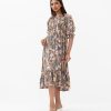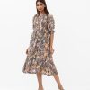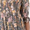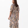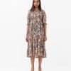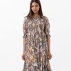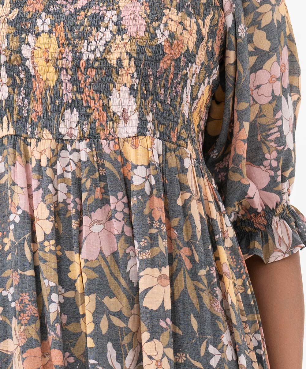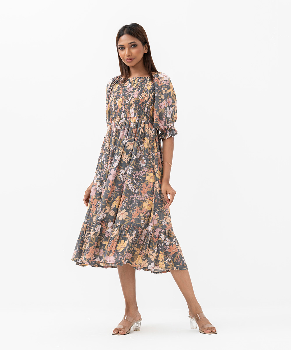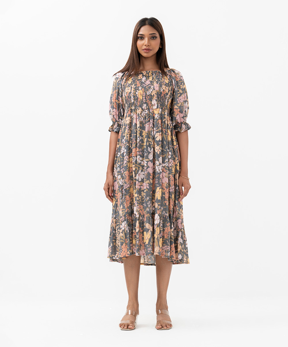 Women’s printed flared style long tunic in blended cotton fabric. Square neck, three-quarter sleeved. Smoked at the top front and gathered at the waistline.