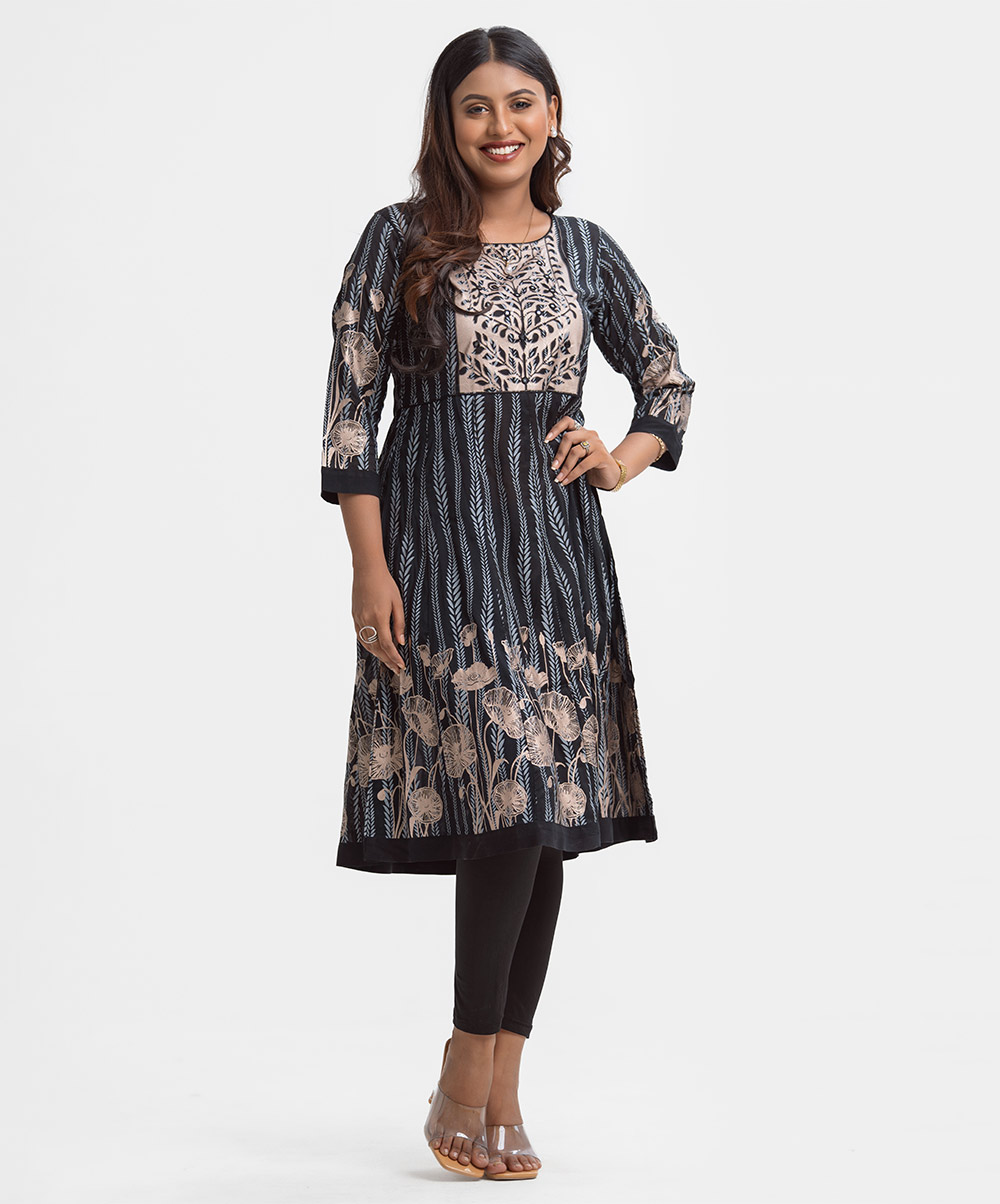 Women’s printed A-line long tunic in cotton. Round neck, three-quarter sleeves and karchupi at the front.