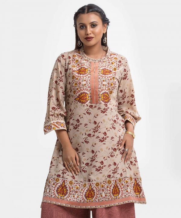Women’s long tunic in printed georgette fabric. Mock neck, three-quarter cuff sleeves. Patch at front & sleeves.