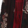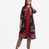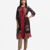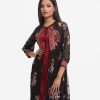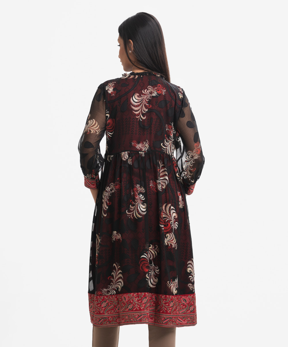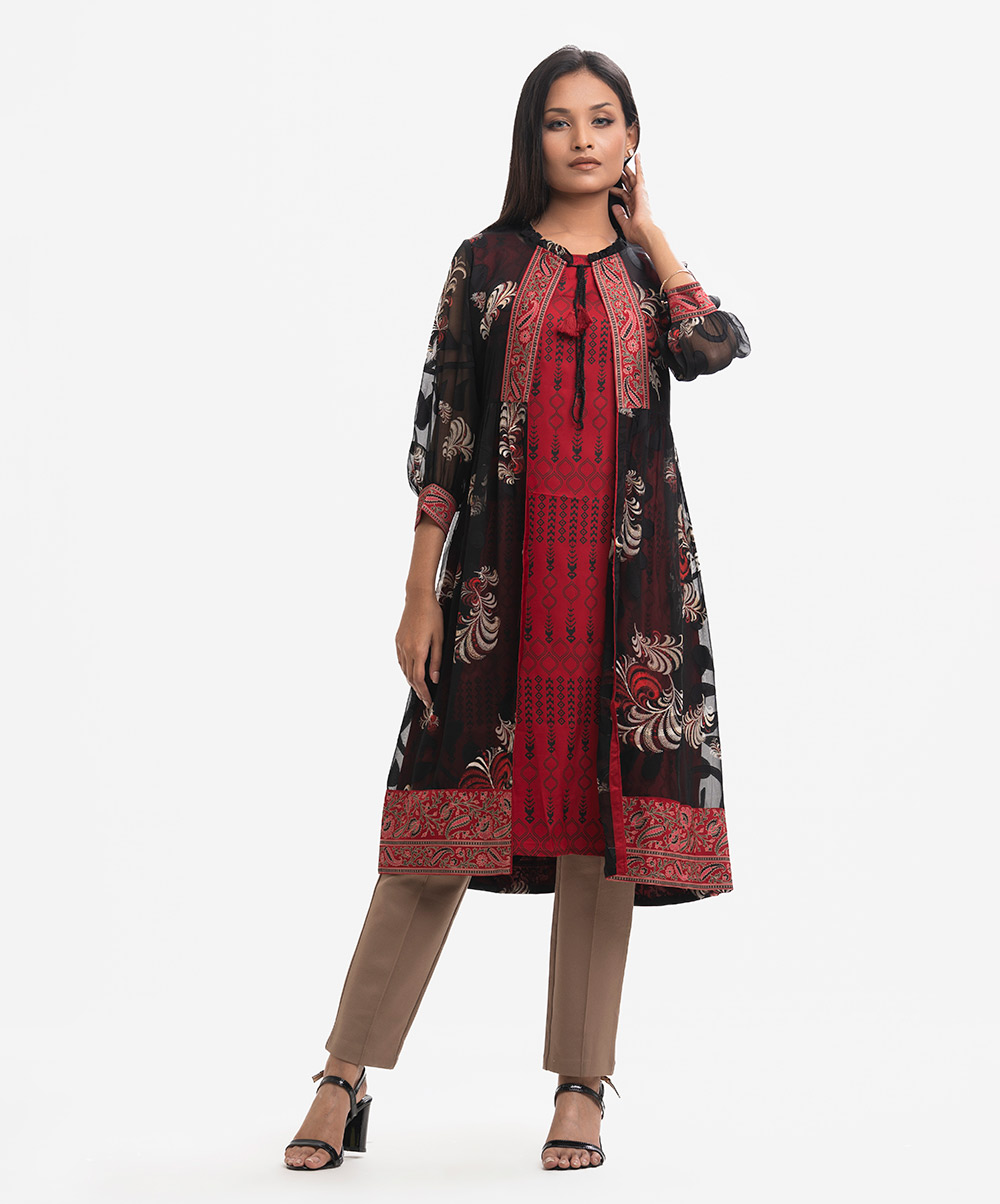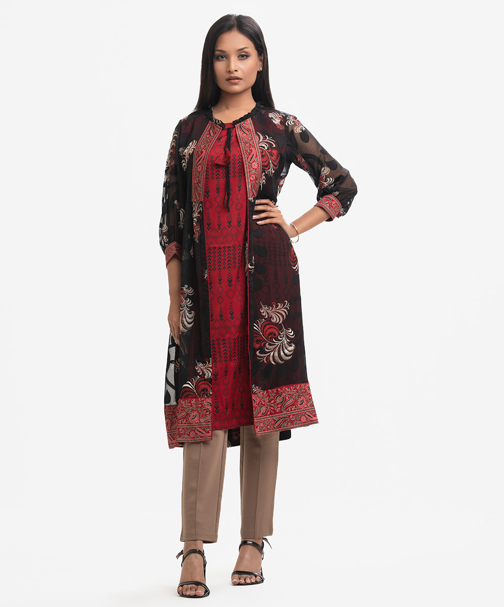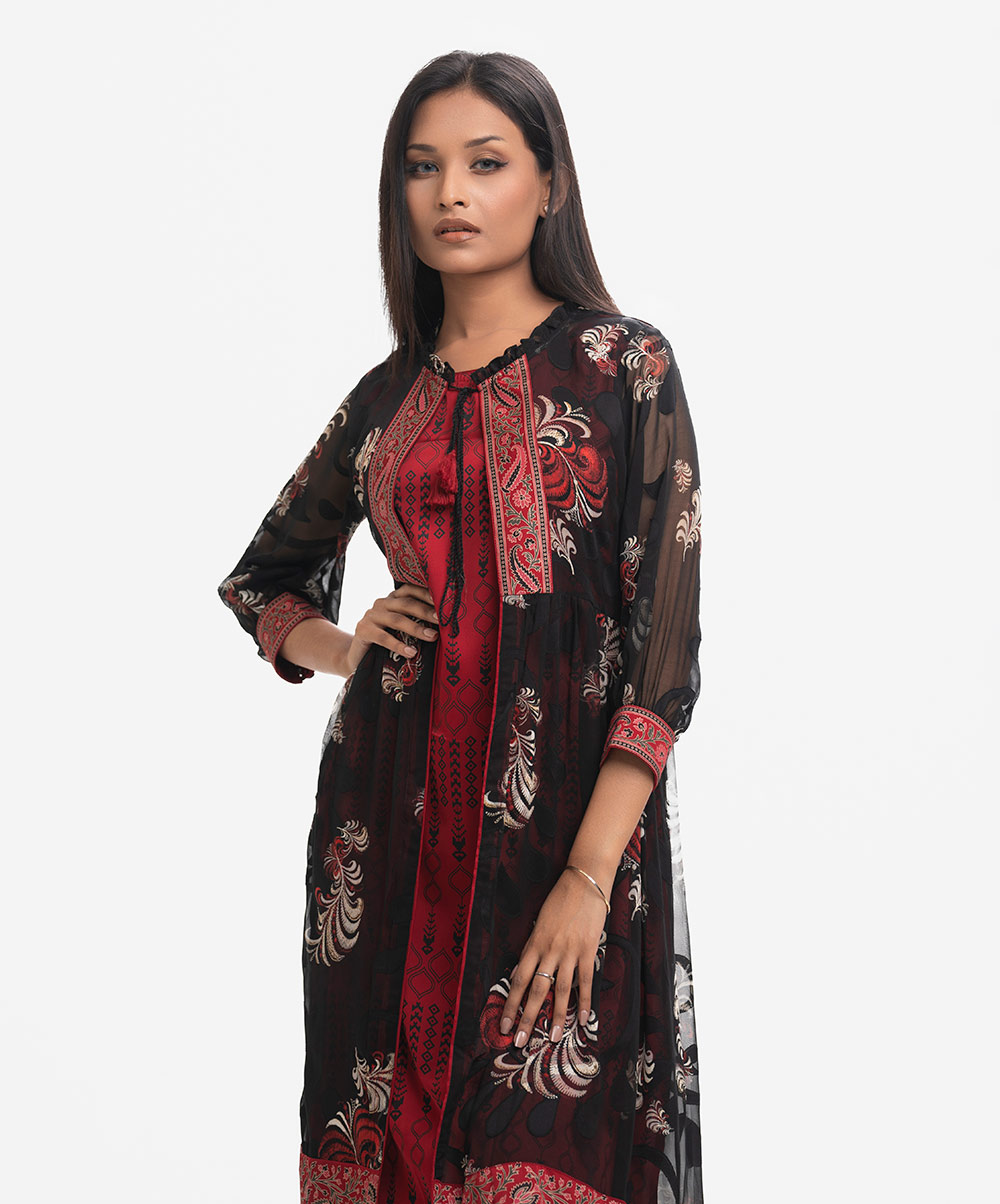 Women’s double-layer shrug attached long tunic in georgette fabric. Frill neck with tassel tie, three-quarter sleeves with patch buttons cuff. Gathered waistline and patch at front.
