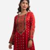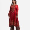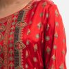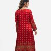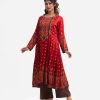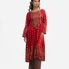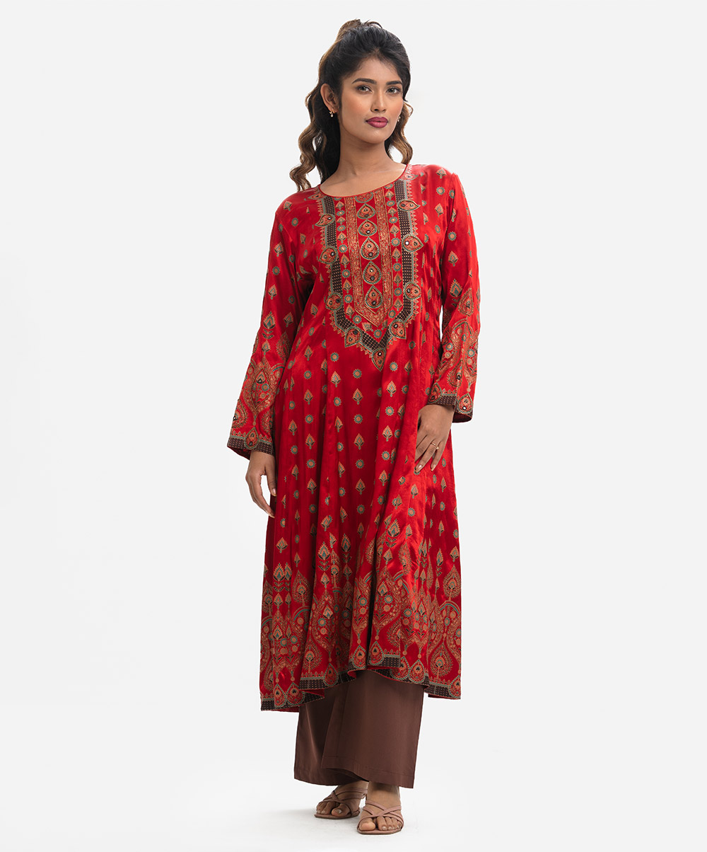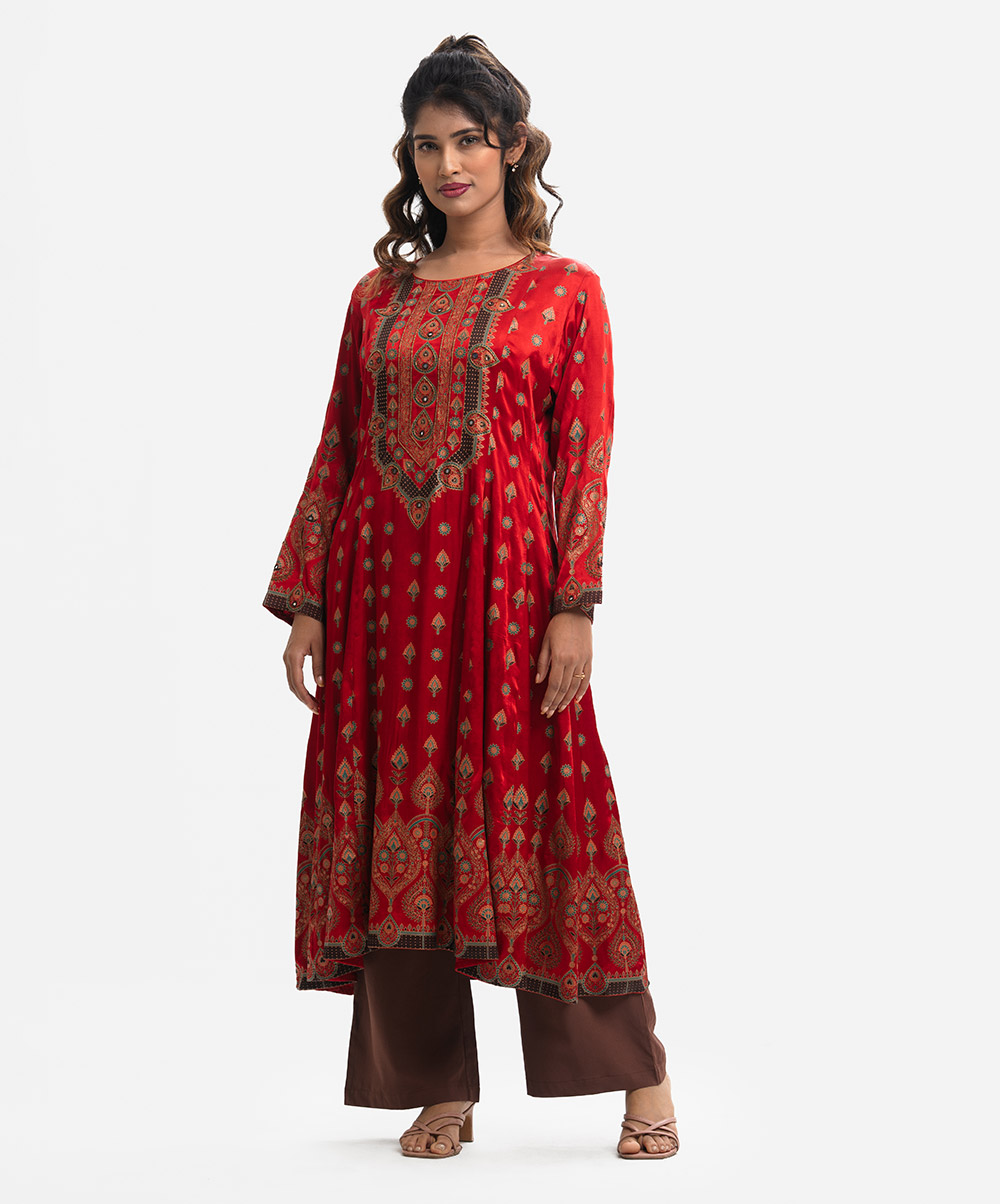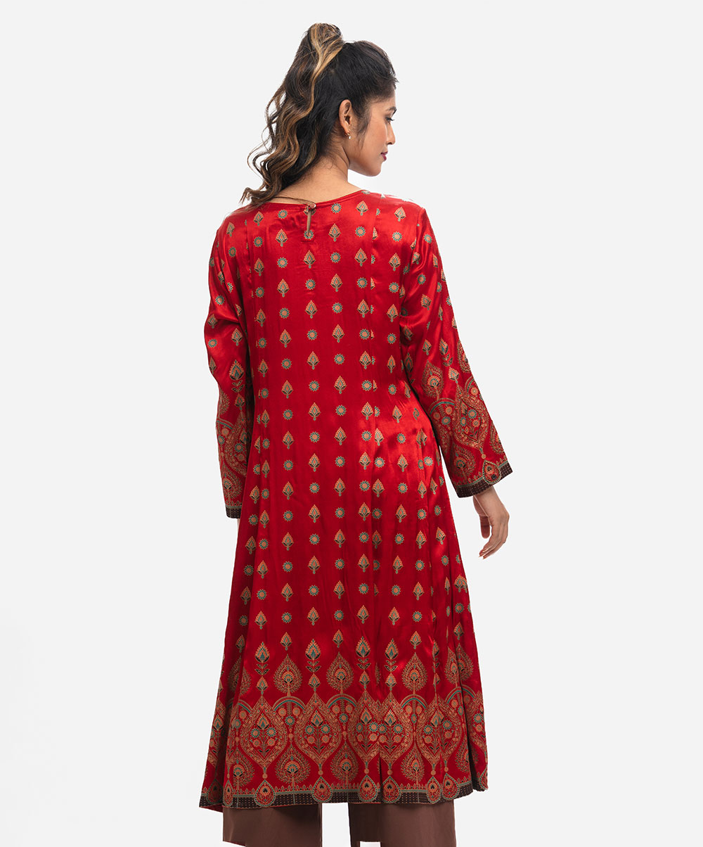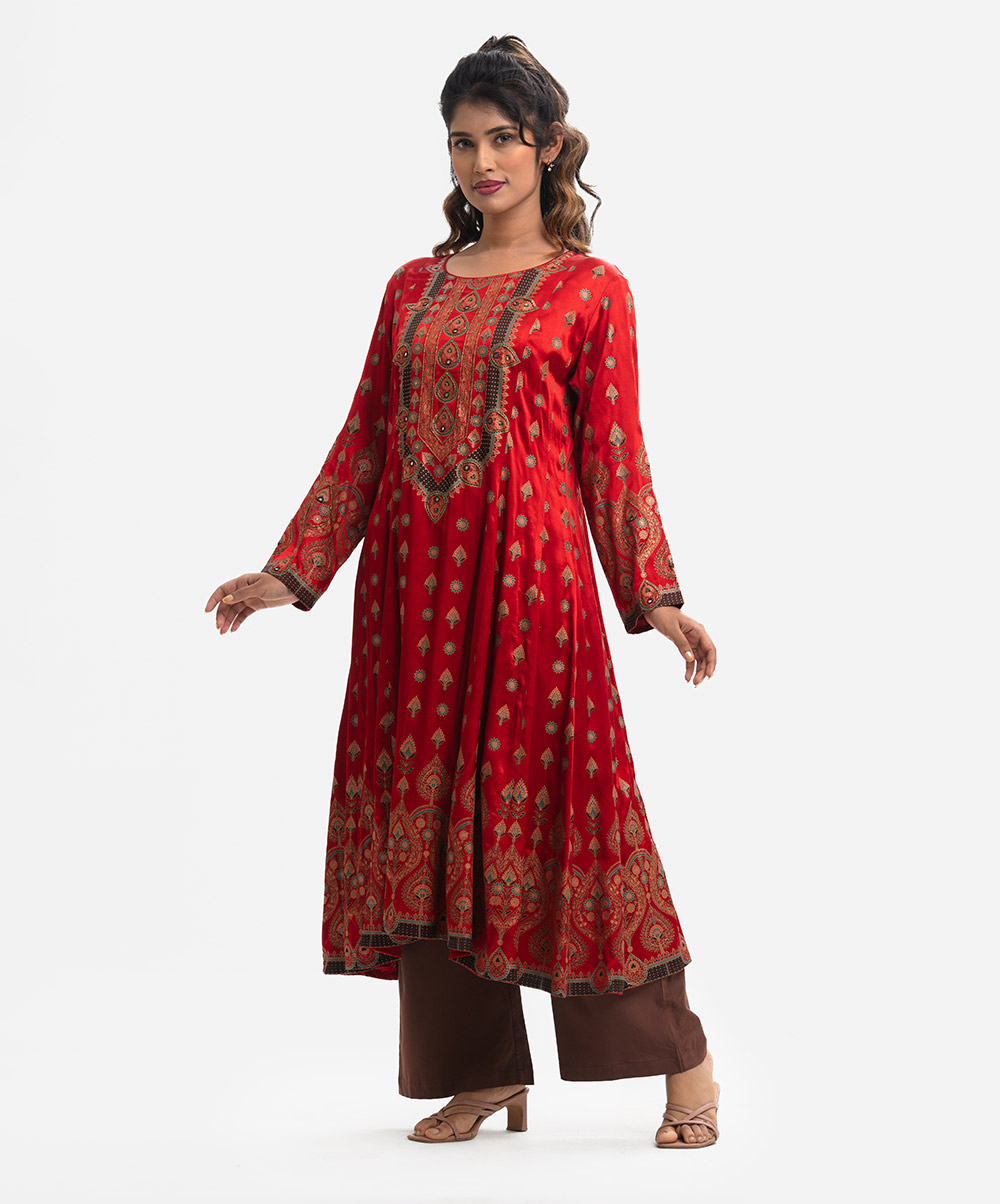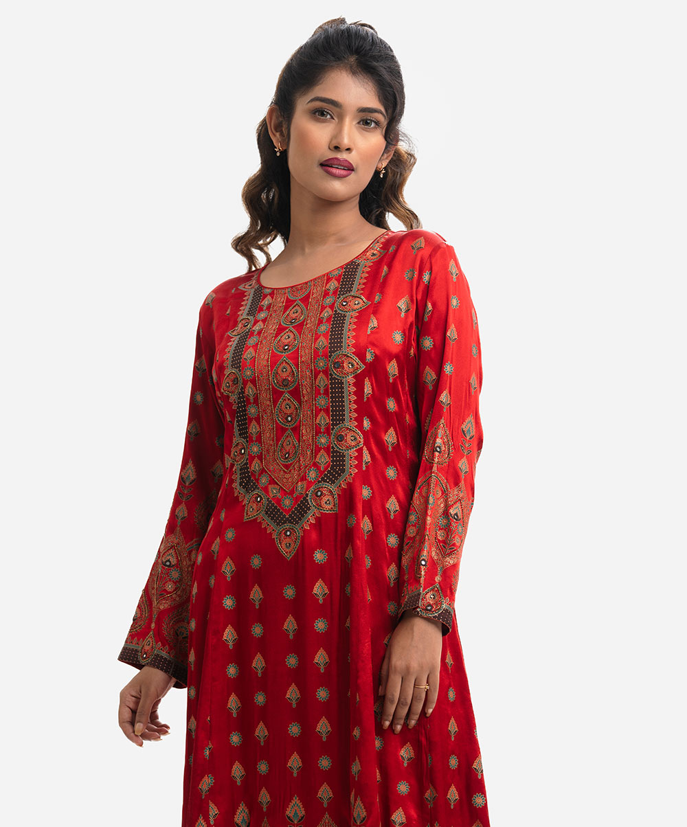 Round neck patterned A-line long tunic in silk-viscose fabric from Nargisus by Le Reve. Full sleeves, karchupi at the front.