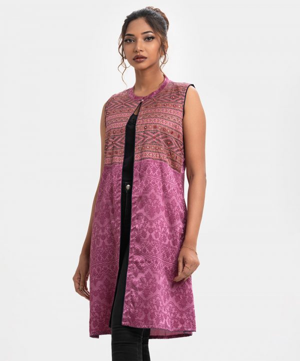 Open front long shrug in satin georgette fabric with karchupi details.