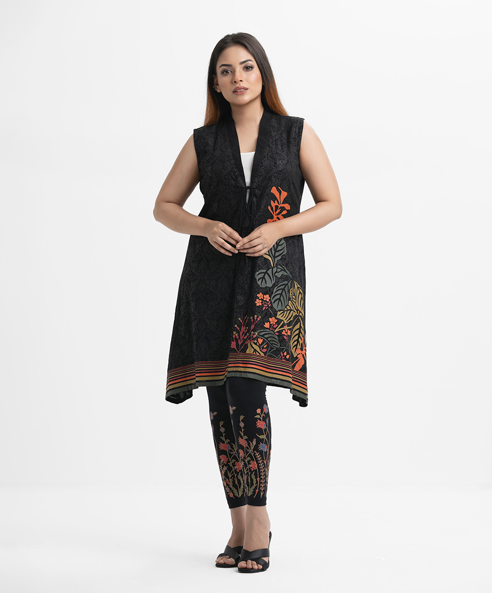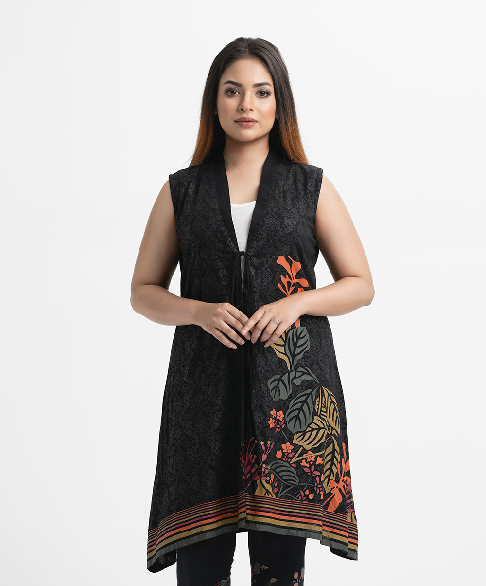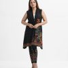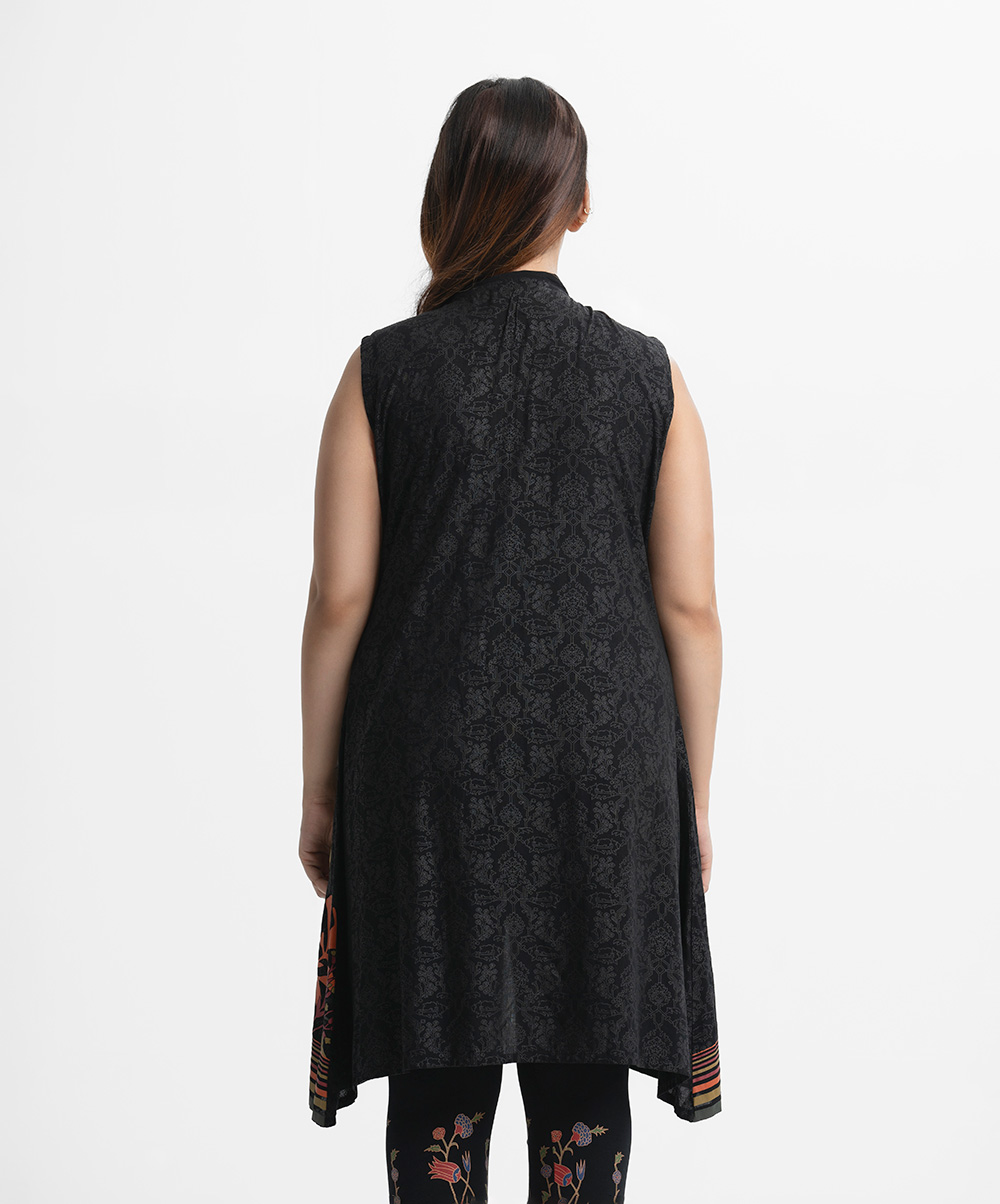 Women’s printed long shrug in viscose fabric. V-neck with tie-cord, sleeveless.