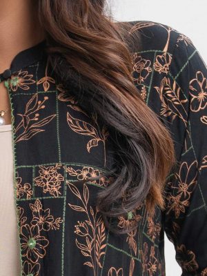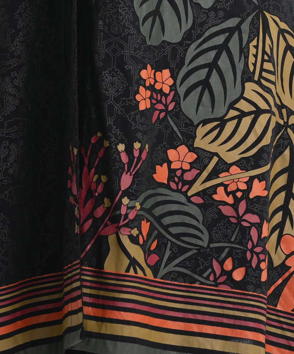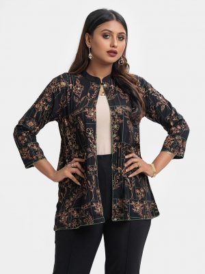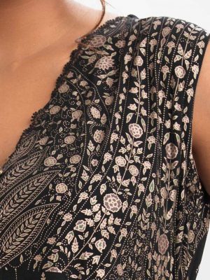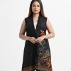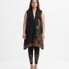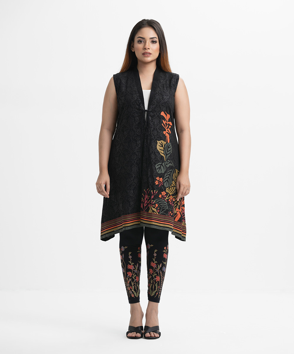 Women’s printed long shrug in viscose fabric. V-neck with tie-cord, sleeveless.
