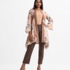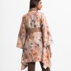 Women’s elongated hem open front shrug in rayon blended fabric. High neck, full bell sleeves. Patch at front.