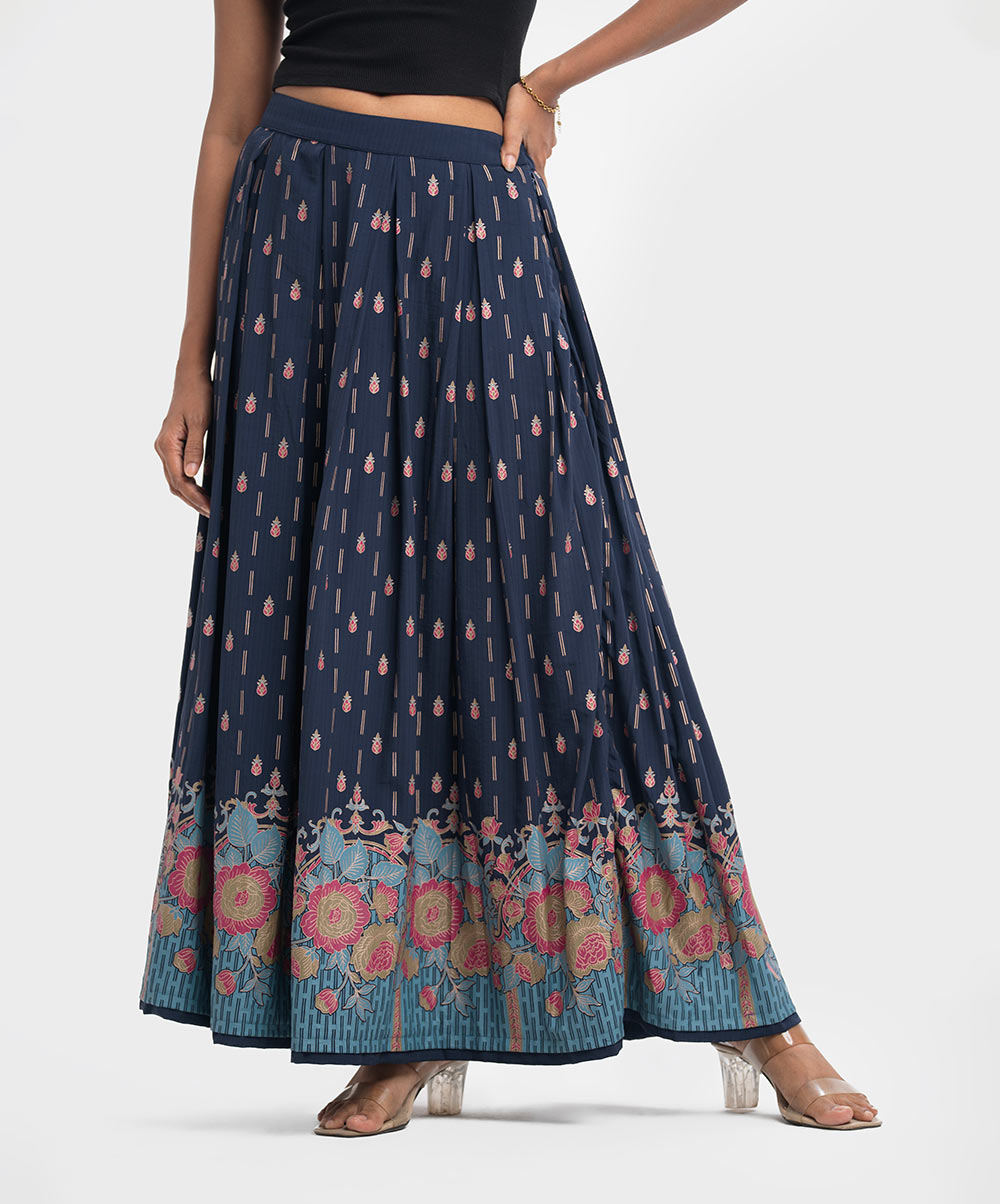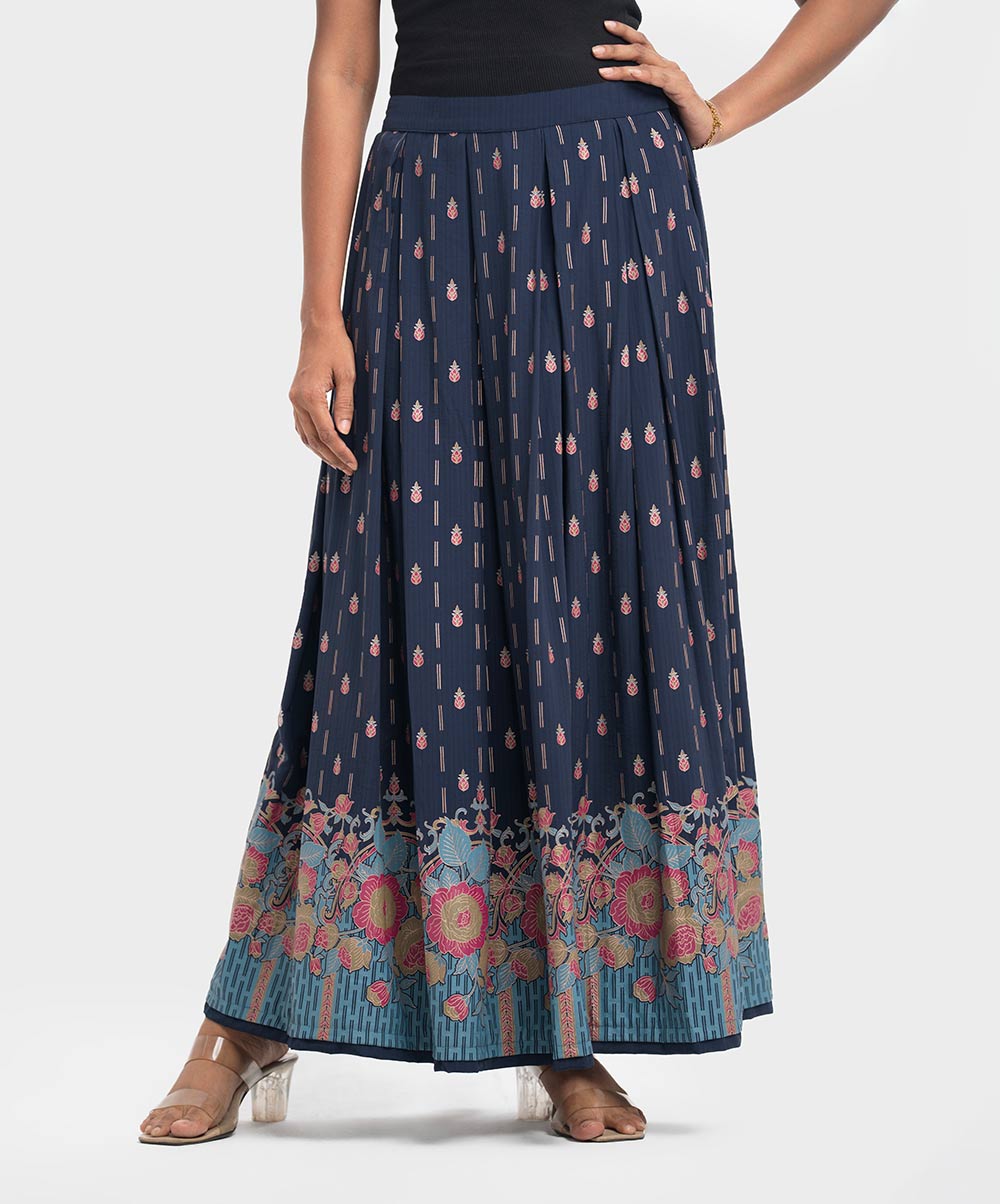 Box pleated long skirt in designed georgette fabric. Elasticated waistline with side zipper opening.