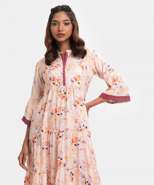 Women’s flared style Maxi in printed blended cotton fabric. Mandarin collar with placket, bell sleeves. Pintuck at front. Patch at placket, sleeves cuff & hemline.