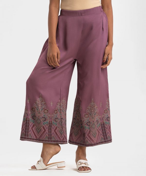 Women’s palazzo in crepe fabric. Concealed elasticated waistline. Printed detail at the ankle.