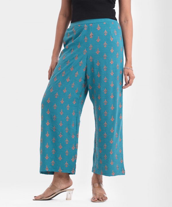 Women’s printed palazzo in stretchable georgette fabric. Concealed elasticated waistline.
