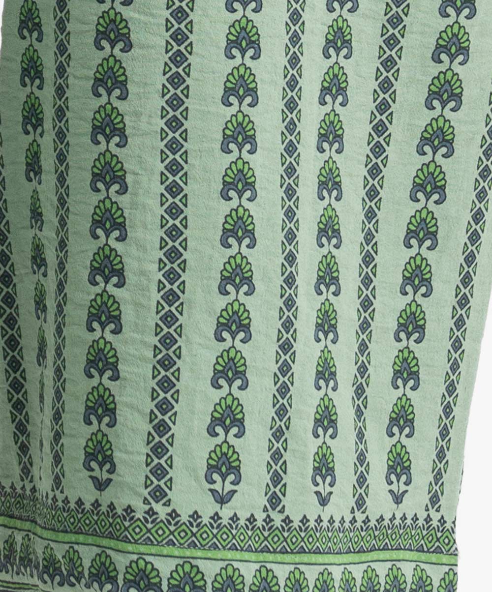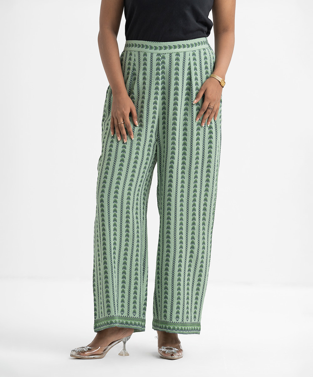 Women’s printed pant style palazzo in stretchable georgette fabric. Concealed elasticated waistline with inseam pockets.