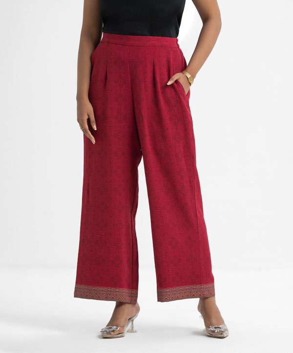 Women’s printed pant style palazzo in stretchable georgette fabric. Concealed elasticated waistline with inseam pockets.