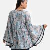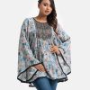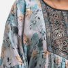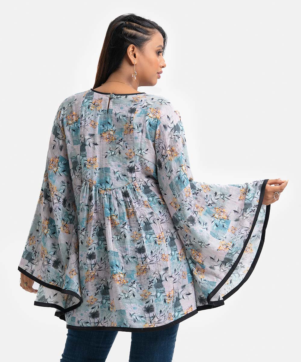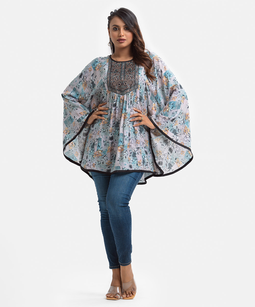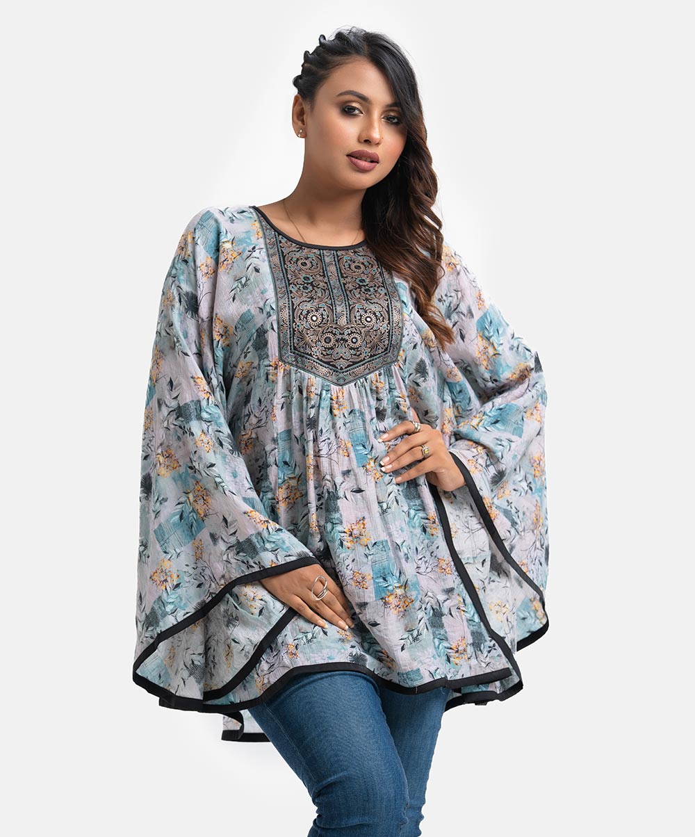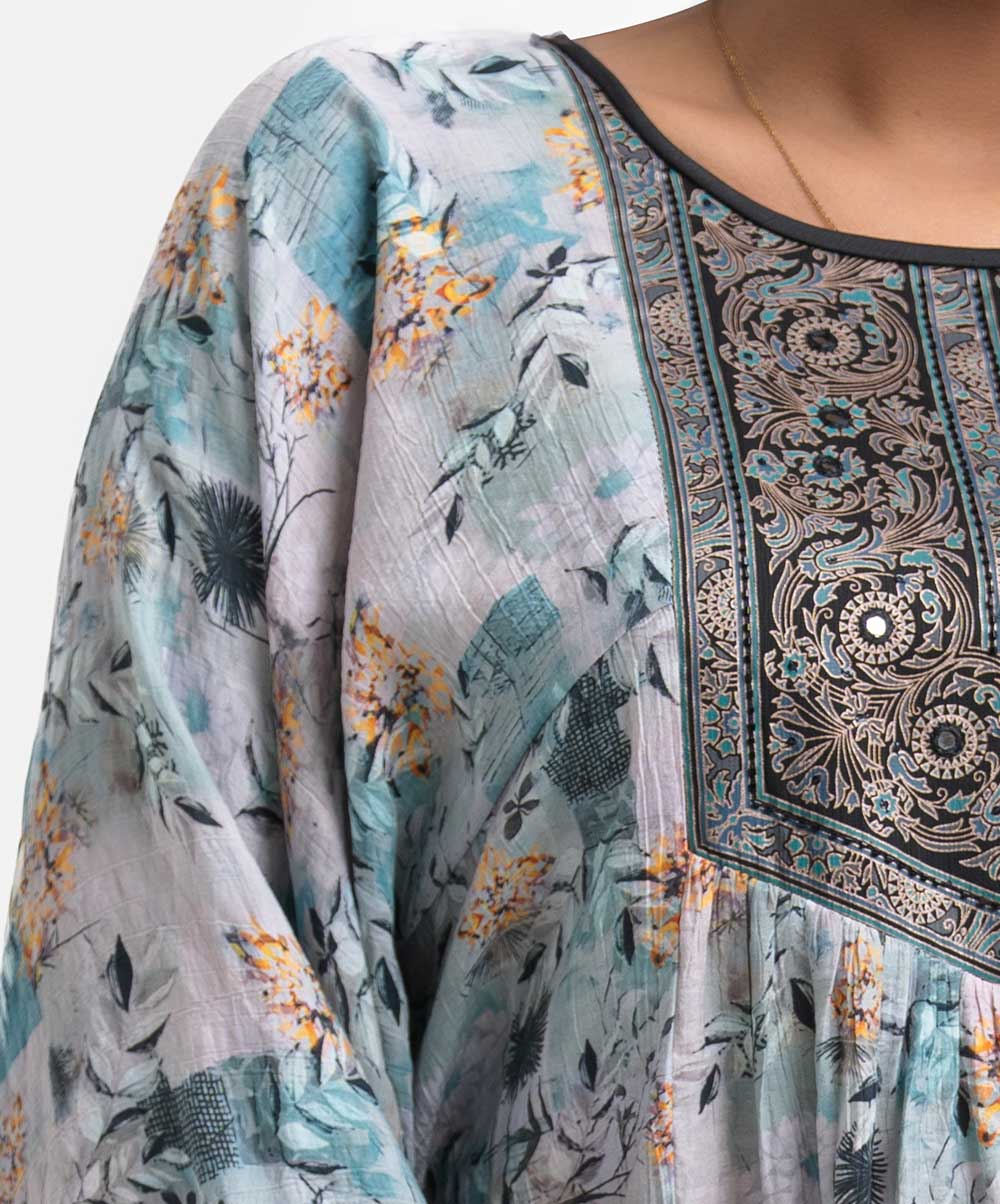 Floral printed kaftan-style maternity tunic in blended cotton fabric. Round neck, patch with karchupi at front.