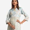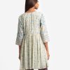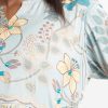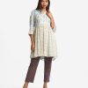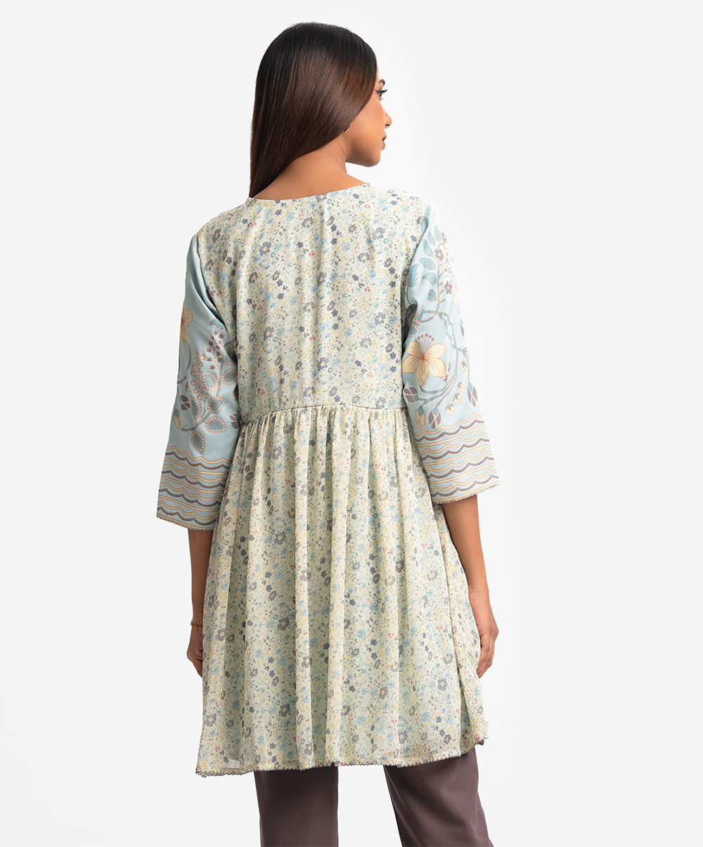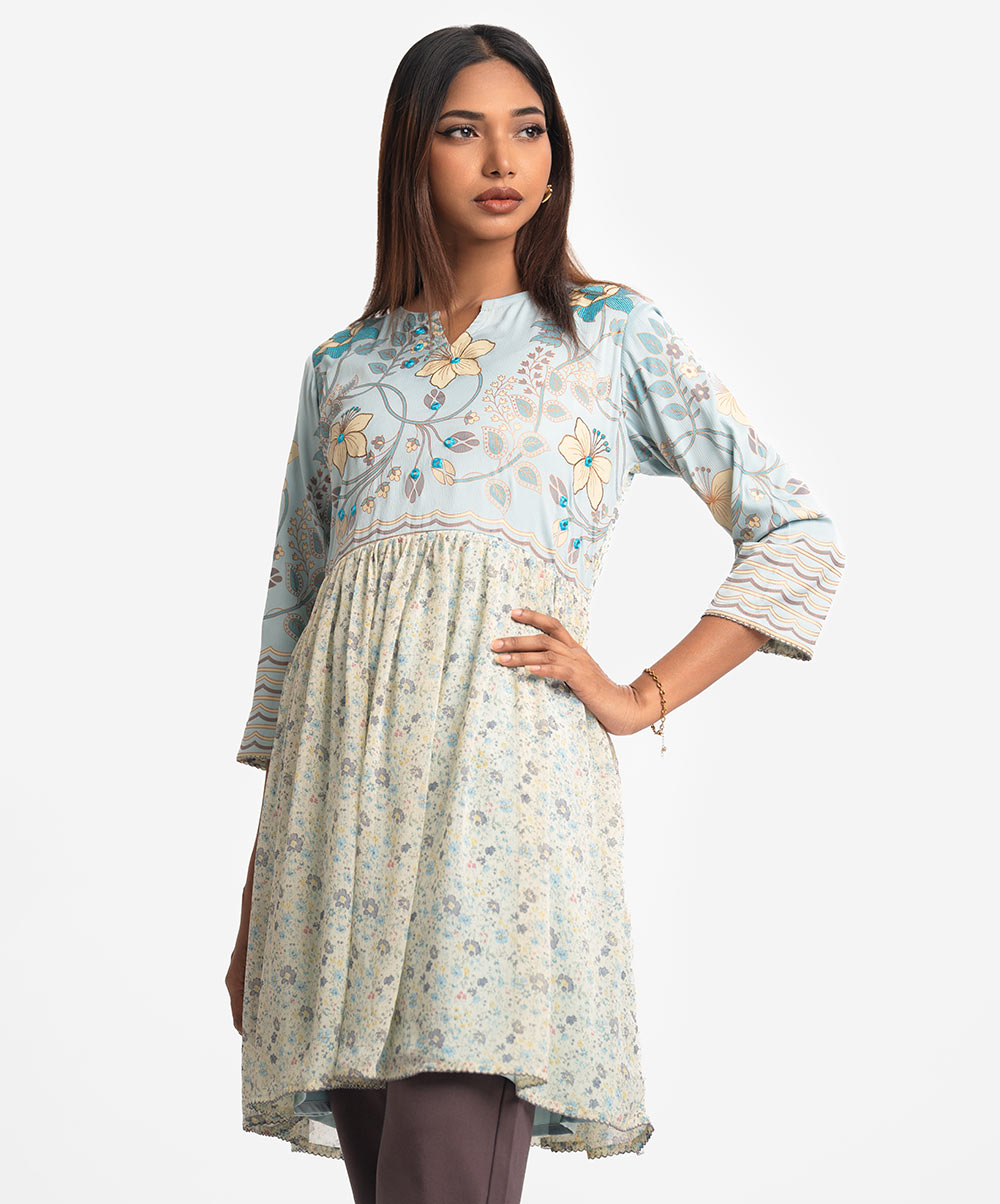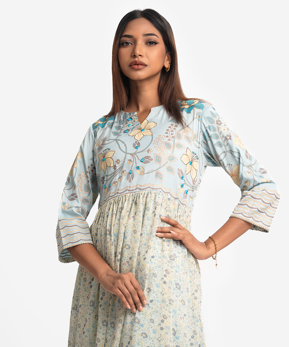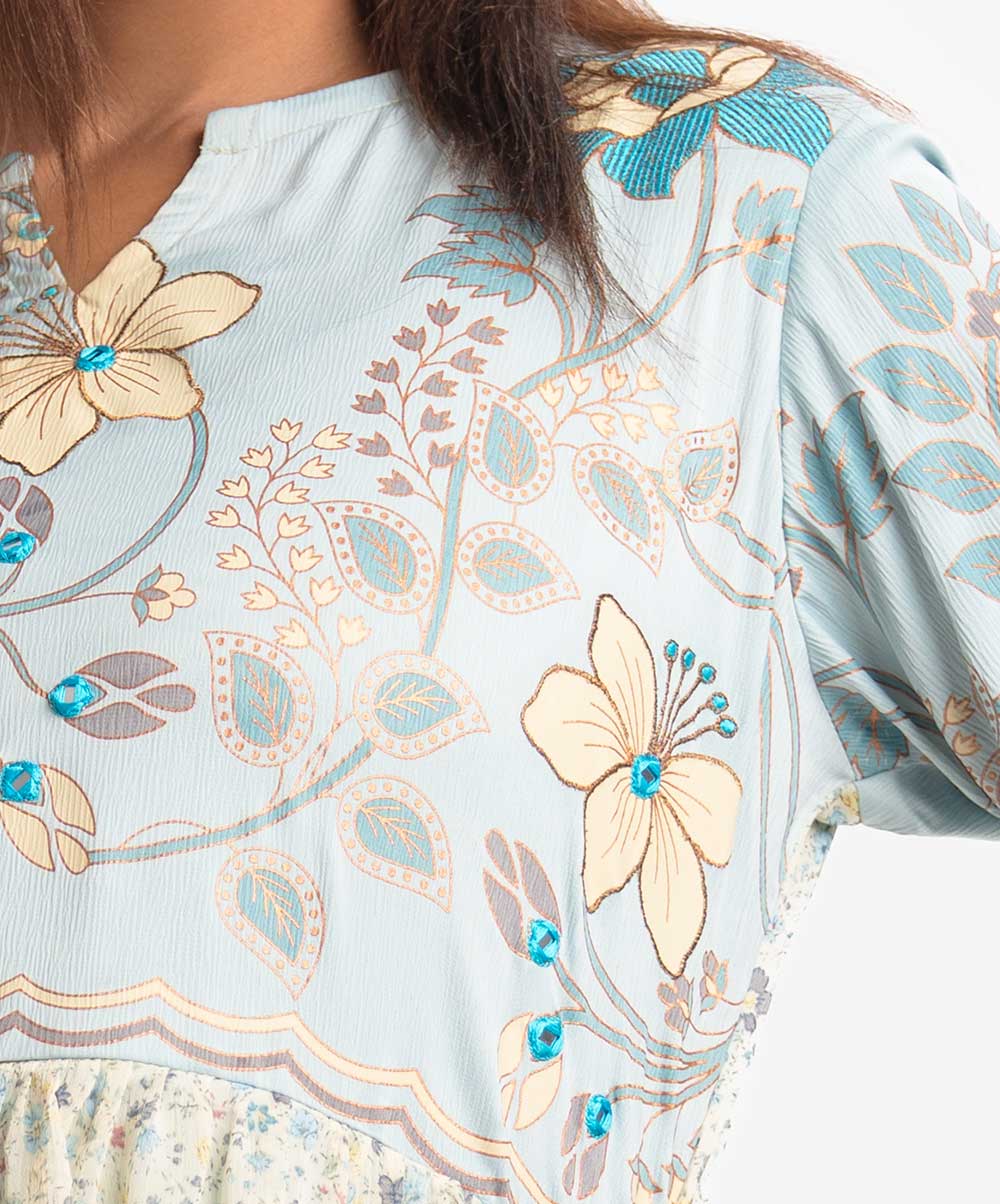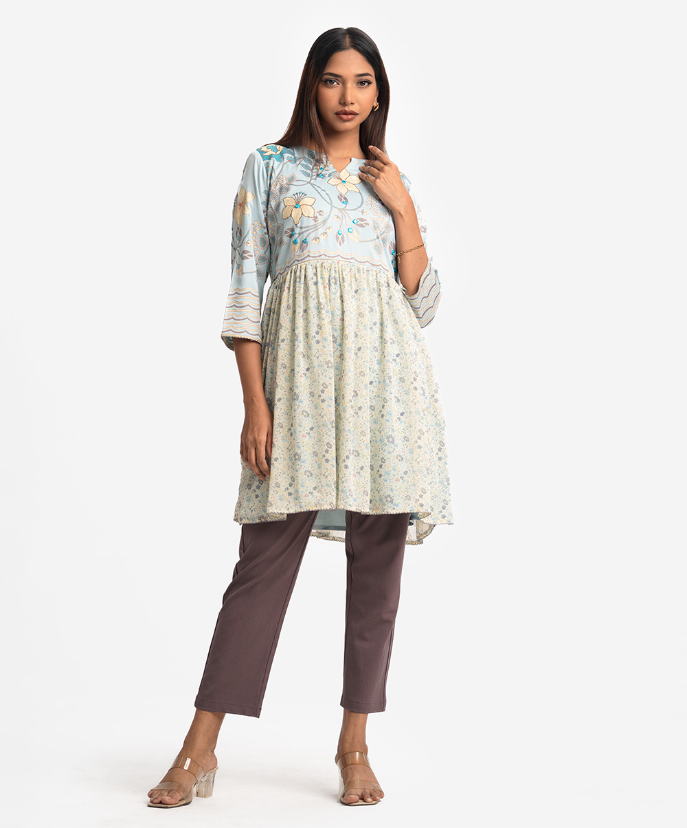 V-neck maternity tunic in georgette & joom fabric. Embroidery at the front, three-quarter sleeves.