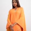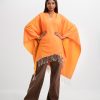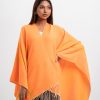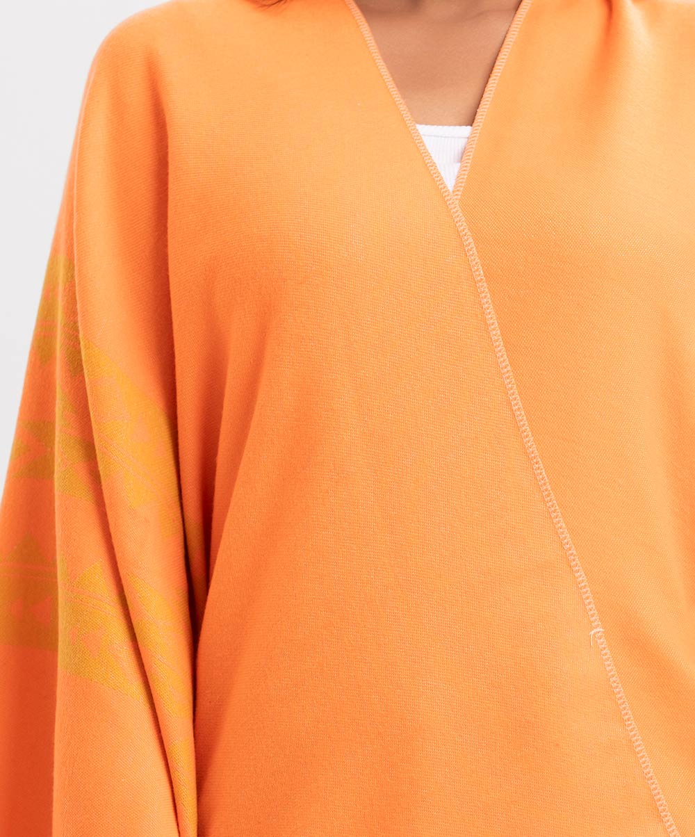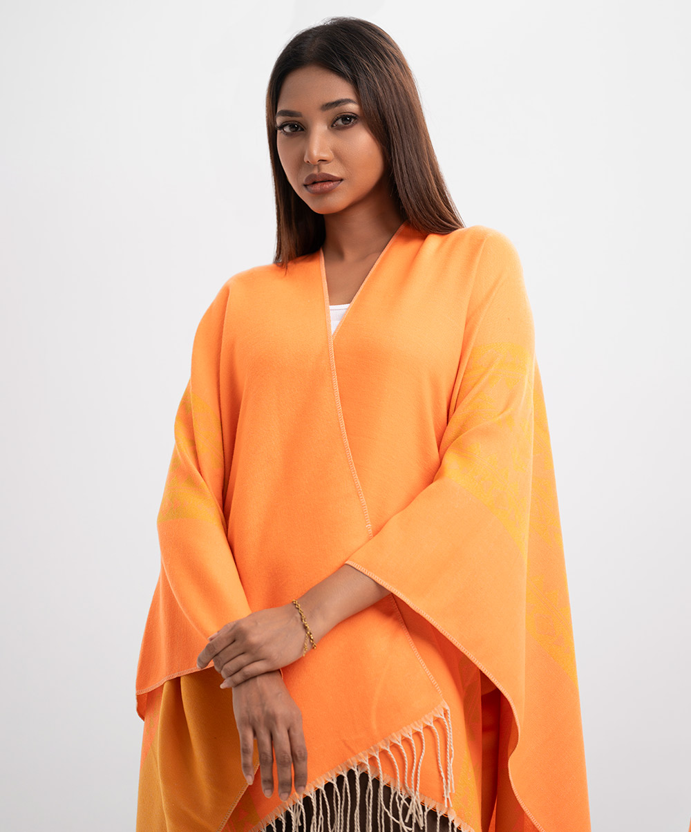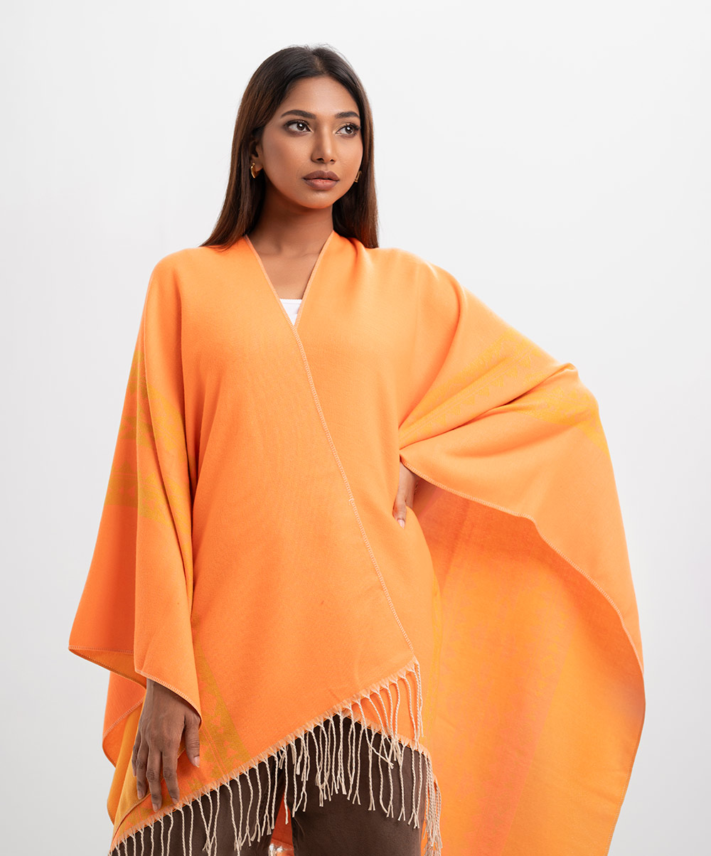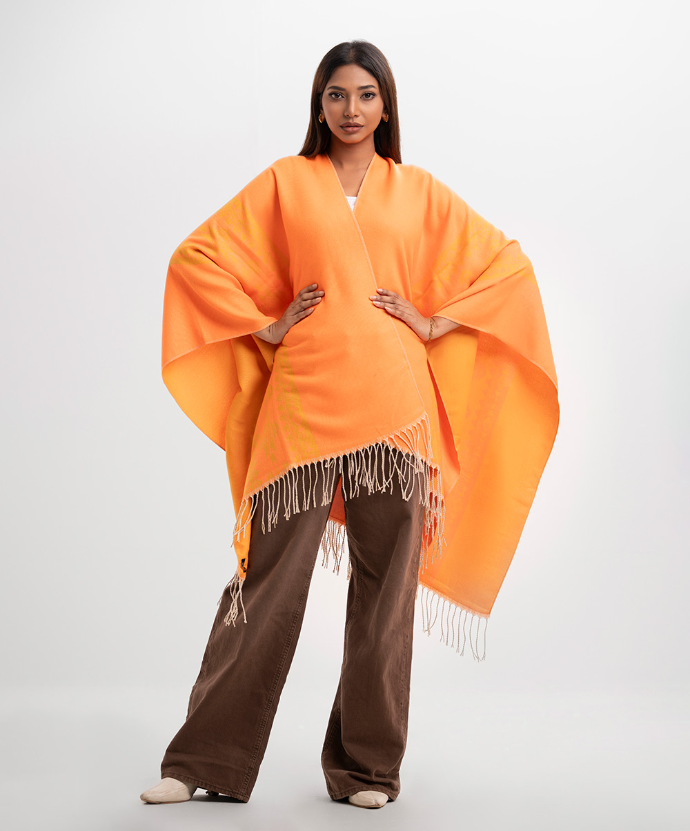 Women’s triangle-shaped winter poncho in woolen fabric. Comes with fringe trim at the border.