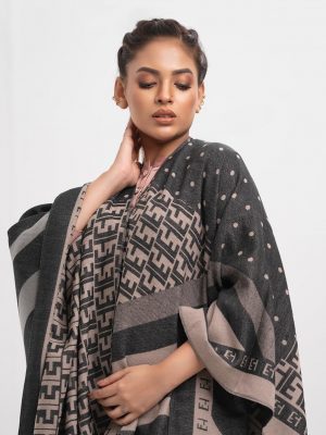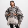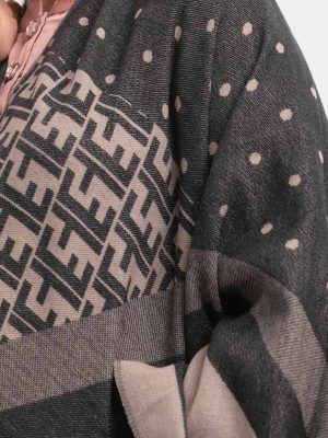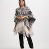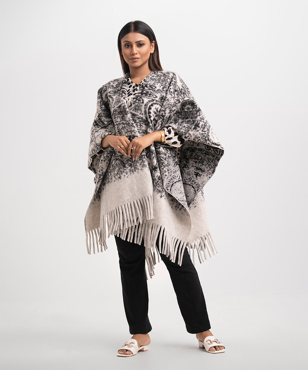 Women’s triangle-shaped winter poncho in woolen fabric. Comes with fringe trim at the border.