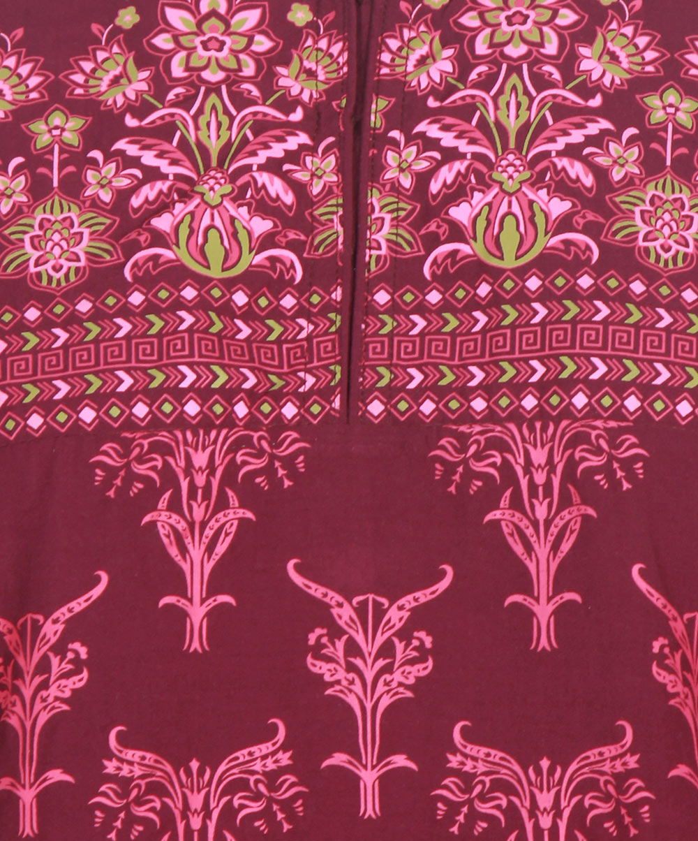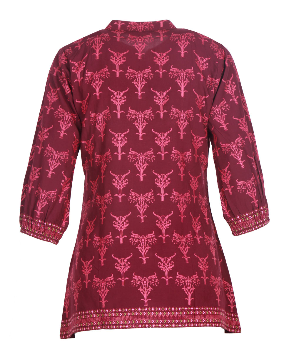 Purple viscose printed tunic with bishop sleeves and mandarin collar.