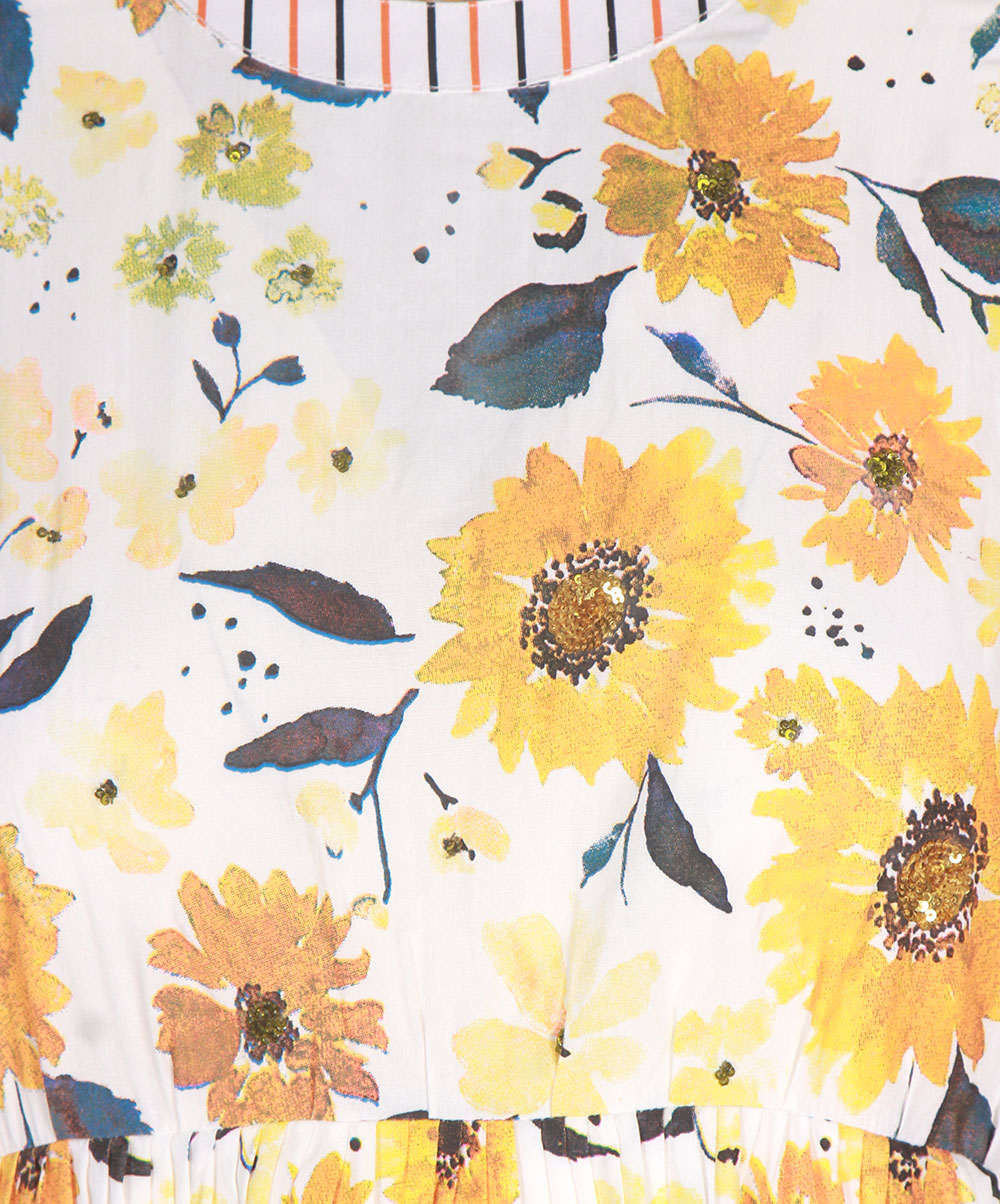 A-line cut white viscose tunic with allover sunflower print. Comes with frilled hemline and gathers on sleeves and waistline.