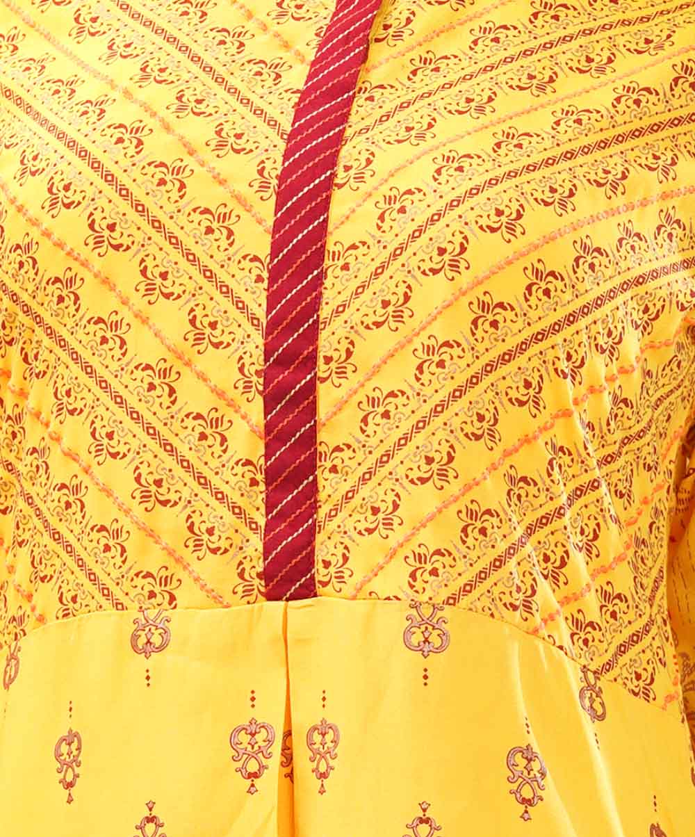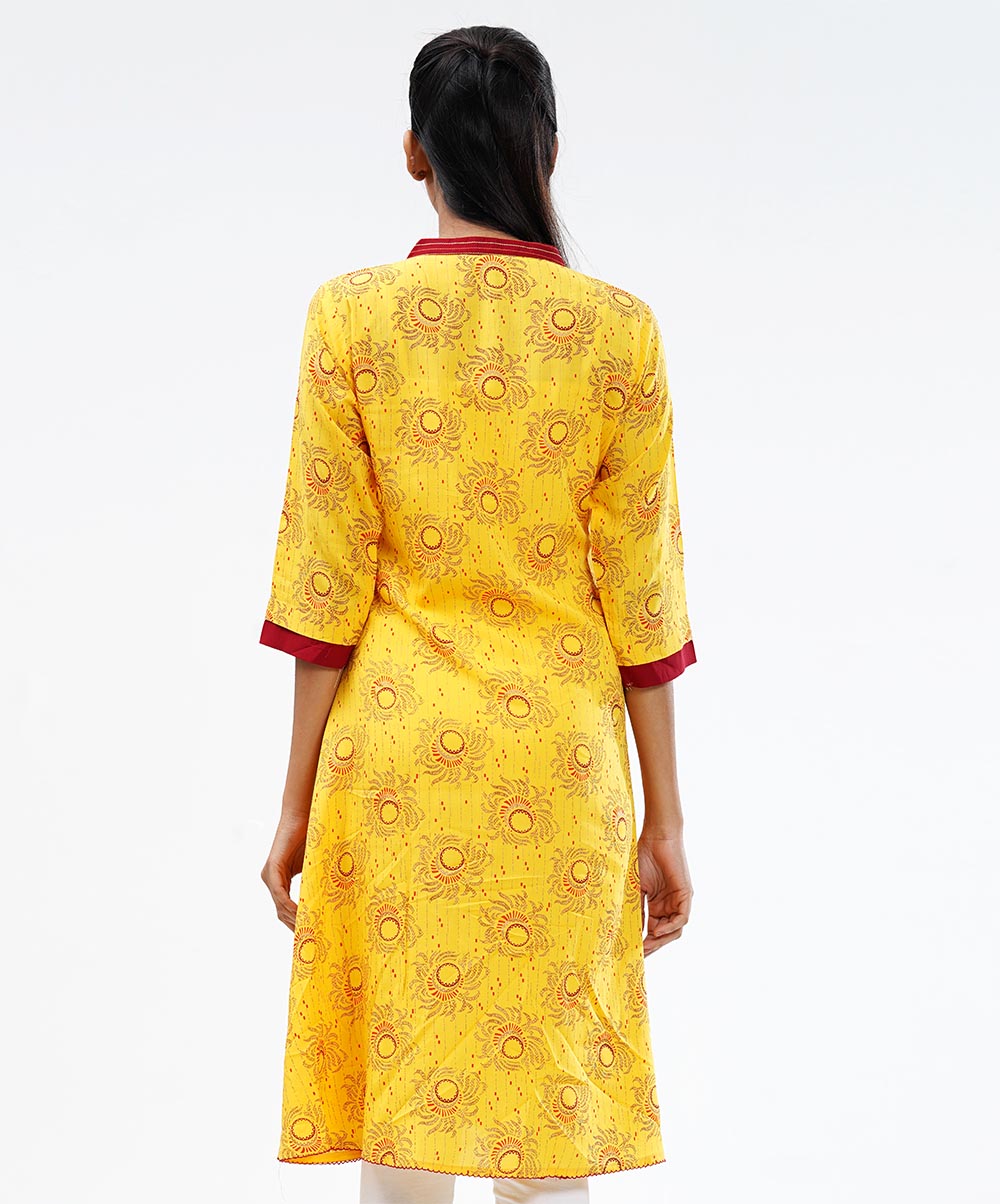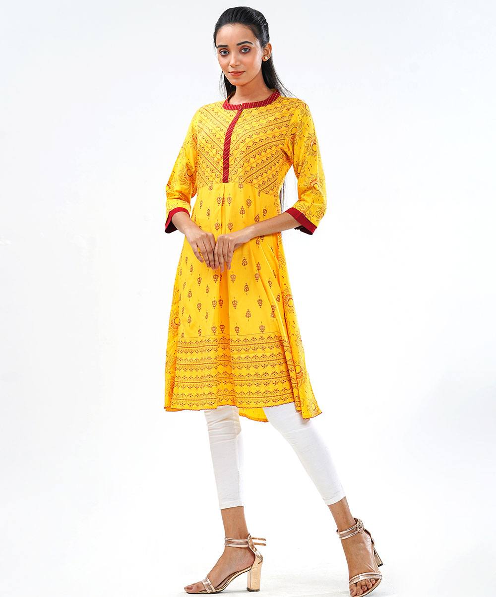 Yellow viscose A-line printed tunic with pleats from waistline. Contrast cut & sew embellishment on button placket and sleeves.
