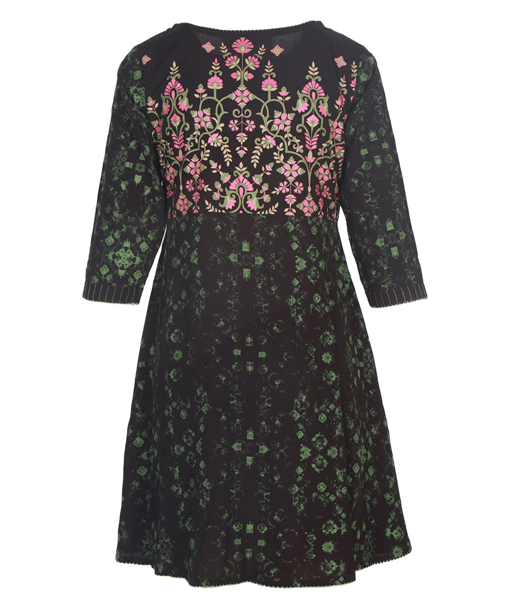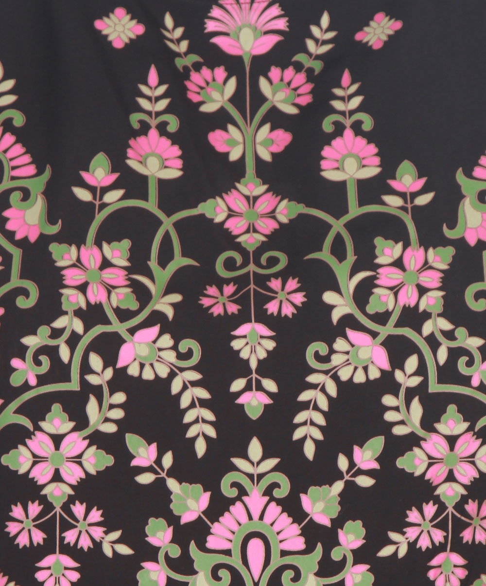 Black viscose tunic with pleats on the side panel of half body. Designed with floral and geometric print allover.