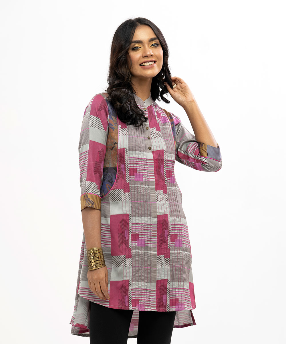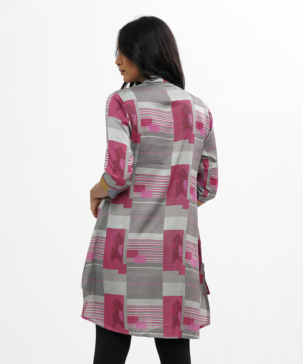 Ash princess cut shirt style tunic crafted in printed crepe silk. Embellished with pleats in front and trendy high low hem.