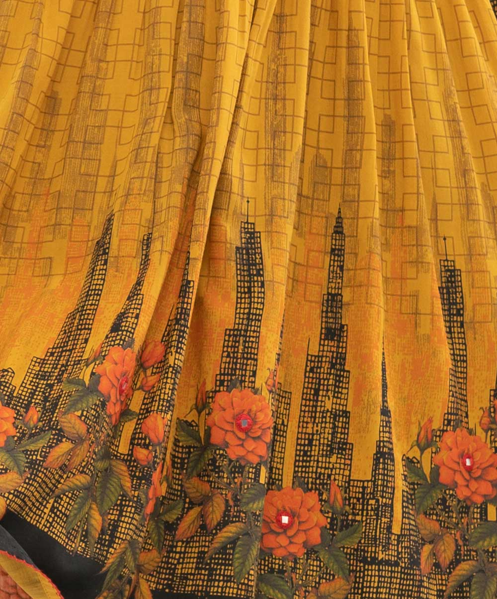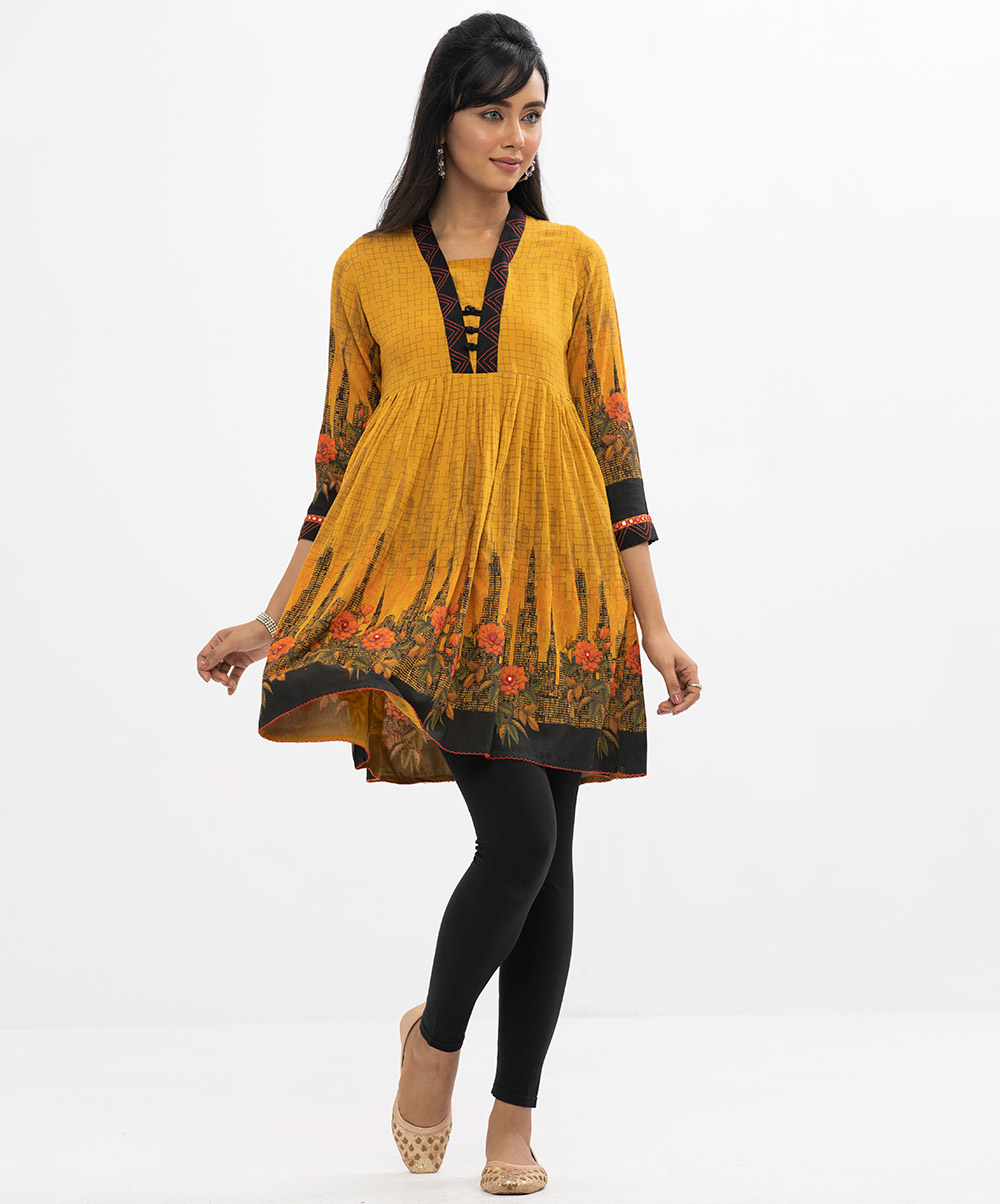Yellow viscose frock style printed tunic with pleats on waistline. Designed with handwork on sleeves opening and lower waistline, and trendy shawl collar.